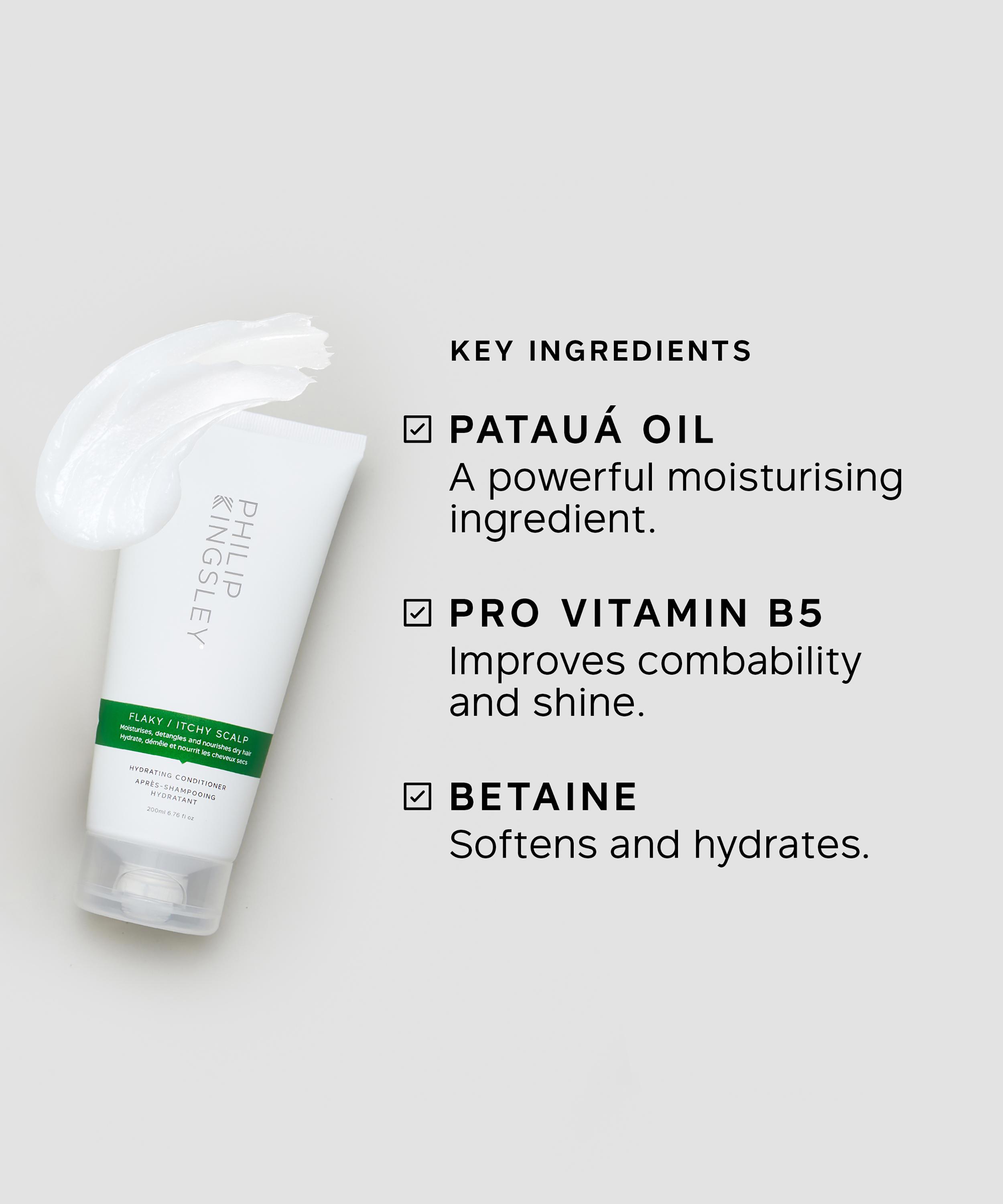 Flaky Scalp Hydrating Conditioner: Aqua/Water/Eau, Cetearyl Alcohol, Glycerin, Betaine, Cetyl Alcohol, Propylene Glycol, Behentrimonium Chloride, Panthenol, Oenocarpus Bataua Fruit Oil, PPG-3 Benzyl Ether Myristate, Phenoxyethanol, Isopropyl Alcohol, Silicone Quaternium-18, Ethylhexylglycerin, Parfum (Fragrance), Trideceth-6, Trideceth-12, Pentaerythrityl Tetra-Di-T-Butyl Hydroxyhydrocinnamate, Tocopherol