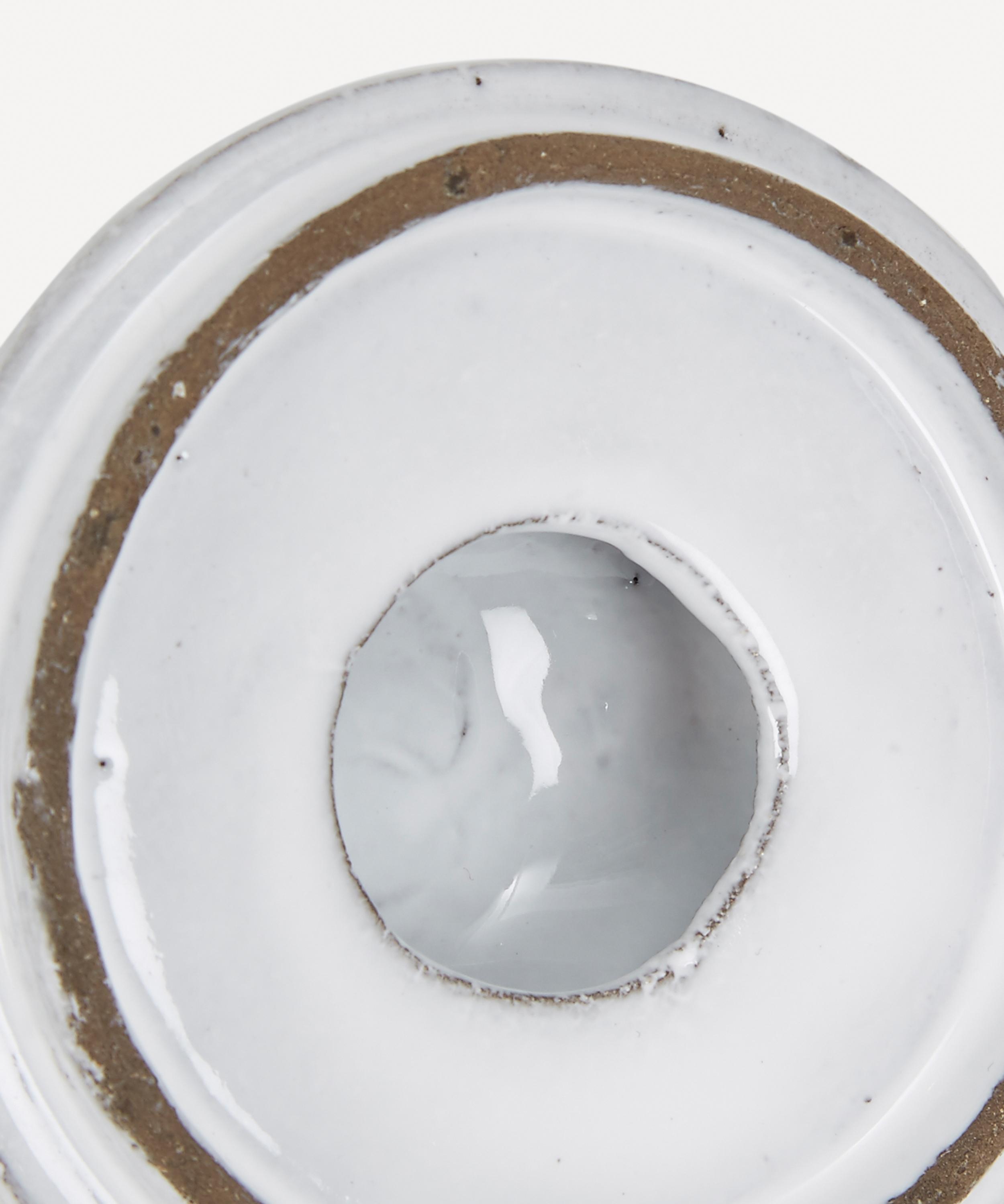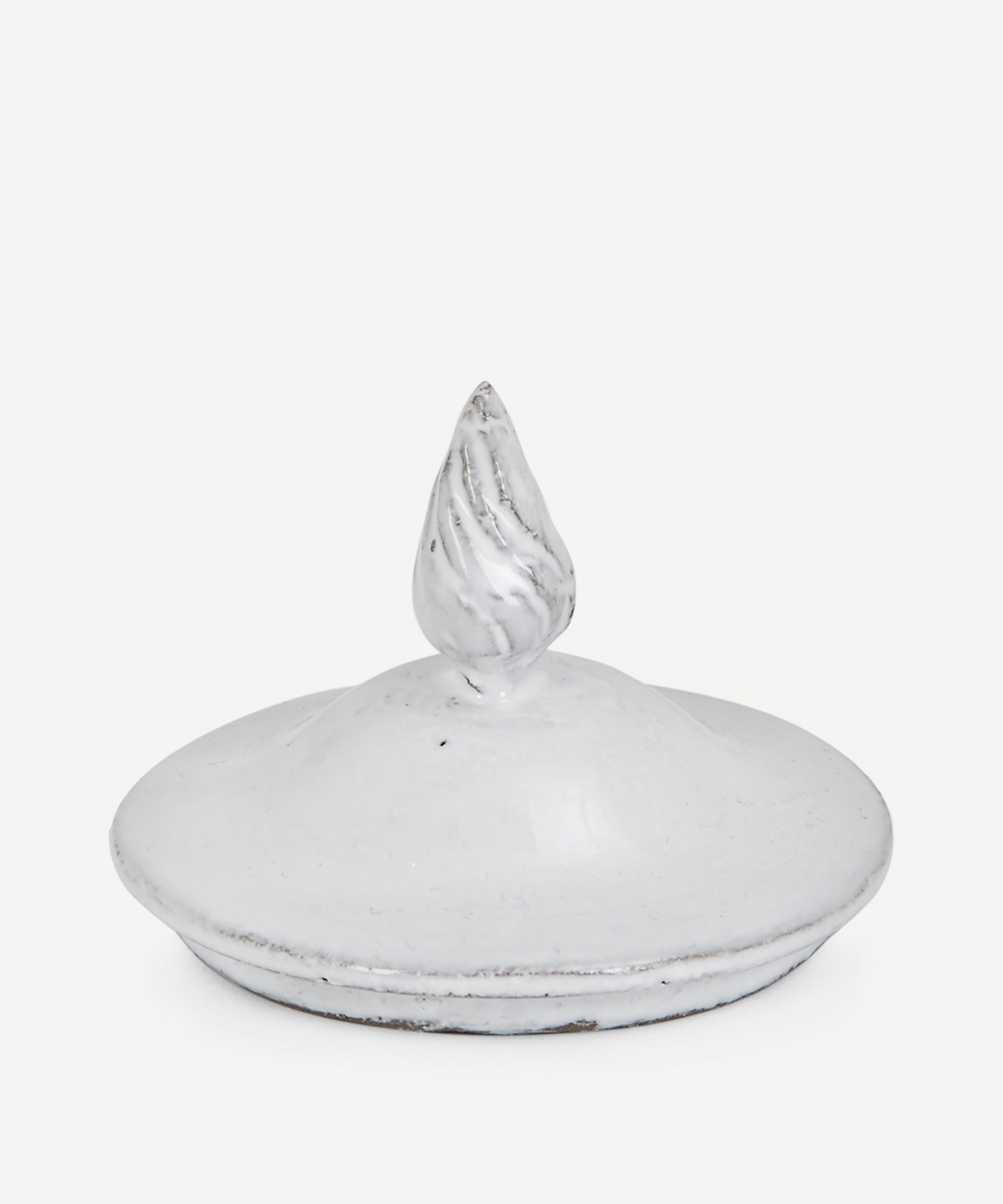 Designed to preserve your ceramic Astier de Villatte scented candle while maintaining its status as an objet d'art even when not in use, this candle lid is crafted from ceramic with an appealing white-washed finish. Finished with a flame-shaped handle, complete with individually-engraved tendrils, it perches beautifully atop your candle of choice to add sophisticated flair to your space.