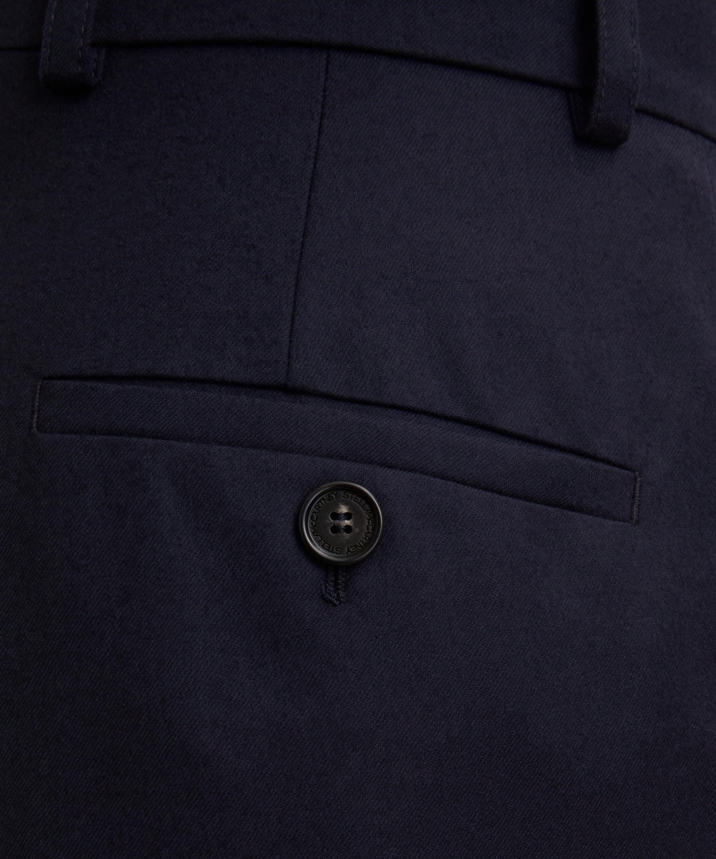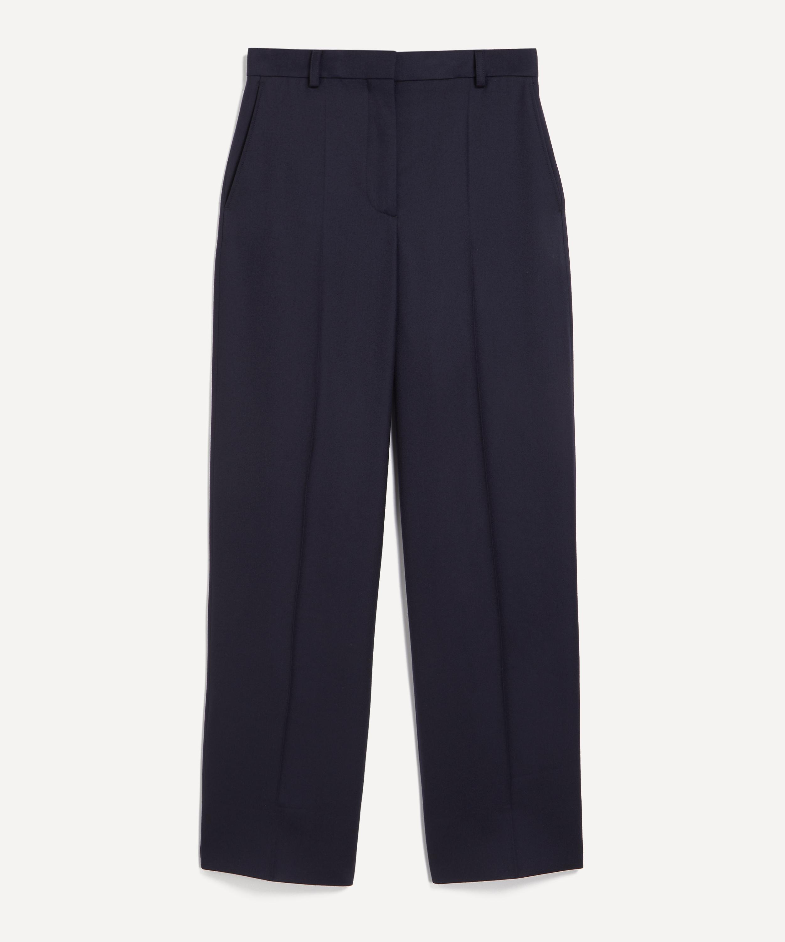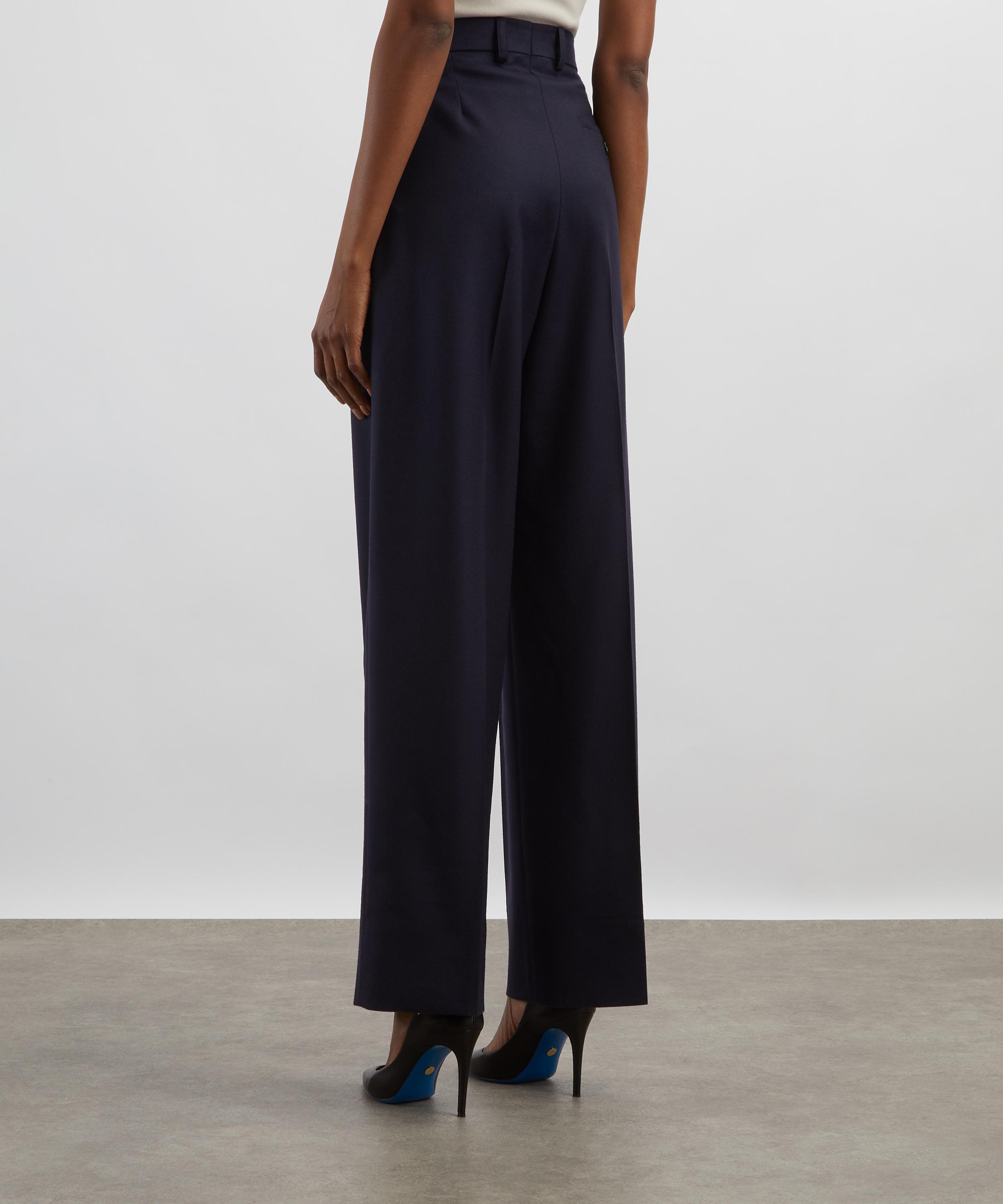 Cut from pure wool in deep navy, these trousers channel a sharply tailored aesthetic with a subtly masculine undertone. The classic straight-leg silhouette is refined by crisp front pleats, delivering a clean, elongated line that complements the body’s natural shape.