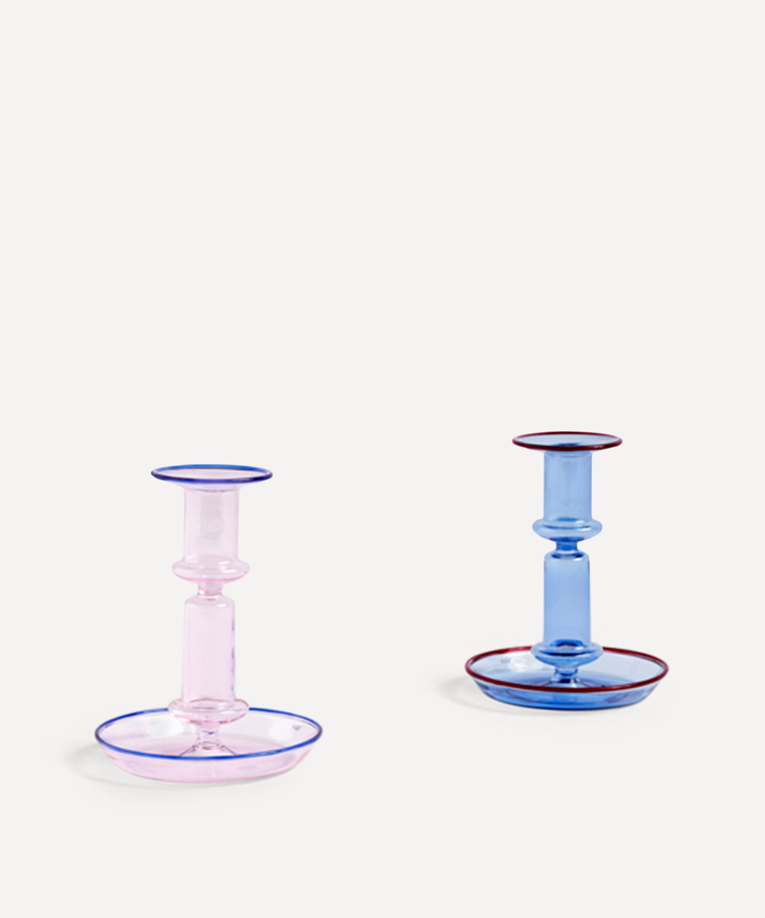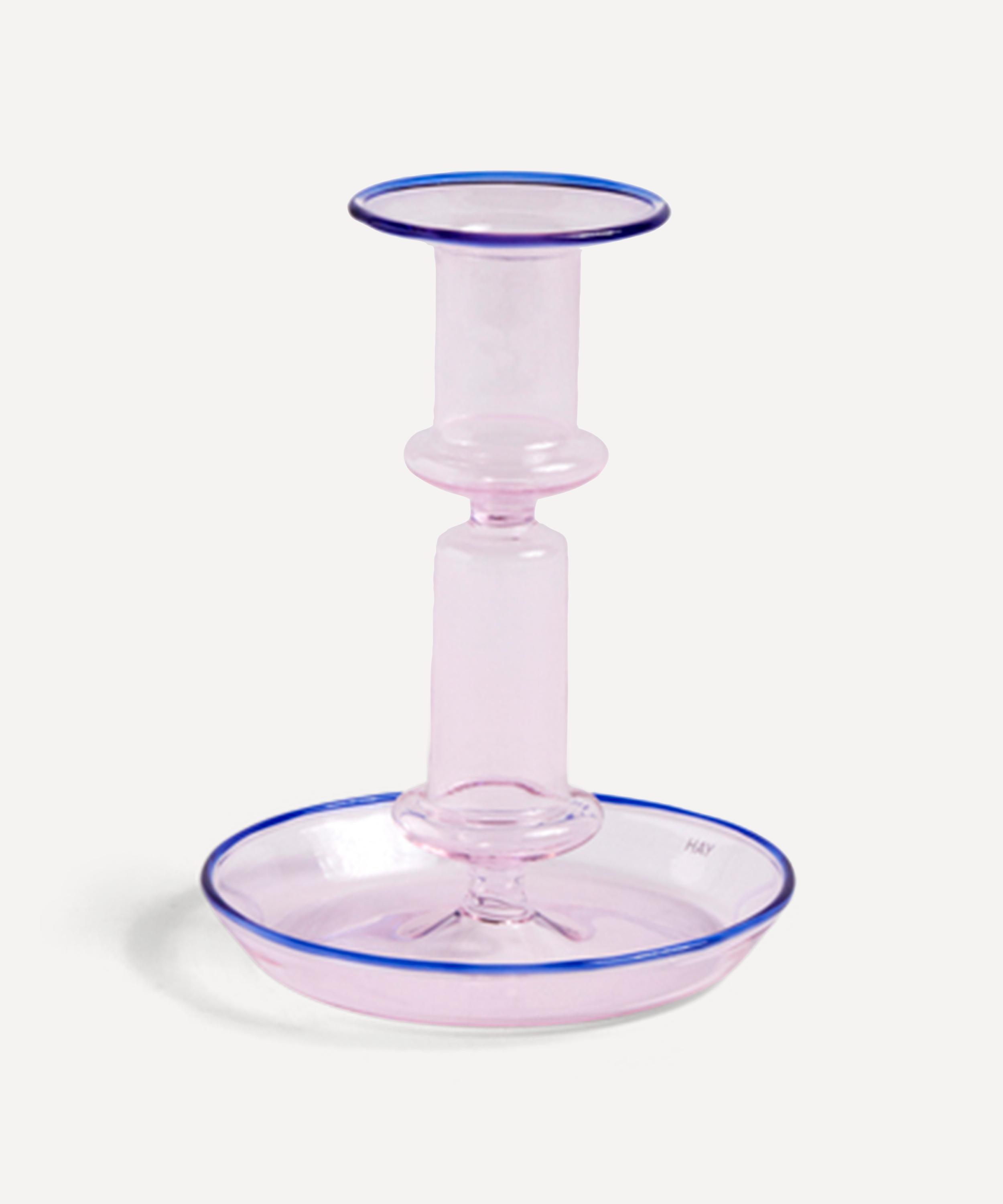 Crafted from heat-resistant borosilicate glass, this decorative candle holder is tinted in a light pink hue with a bold blue rim that catches the light of a flickering flame, wherever you place it. With a thick cylindrical stem and a rounded foot, it will bring a contemporary twist to your interior style – use alongside other candle holders to enhance an atmospheric table setting.