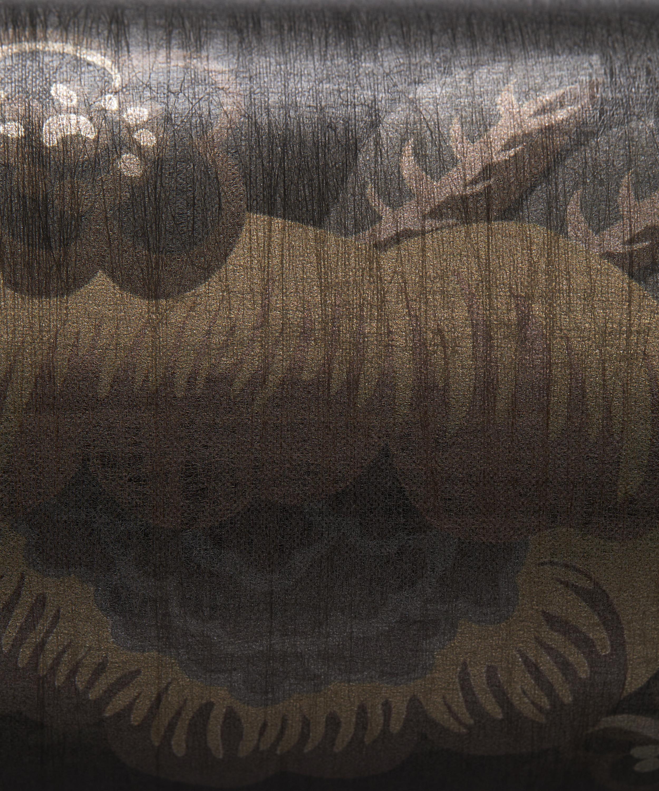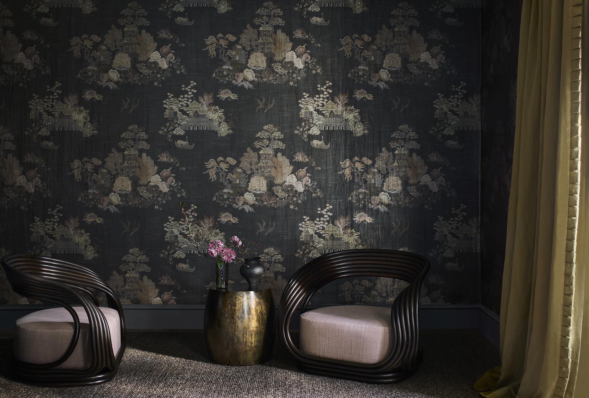 Floating Palace is a reimagined print from the 1970s. Originally a furnishing fabric, it now incorporates new stylistic elements and tonal palettes with intriguing islands filled with lush gardens, oversized lotus flowers, floating sampans, and birds in full flight. Inspired by traditional Chinoiserie wallpaper, it’s printed on a textural fibrous metallic base providing richness and depth reminiscent of antique lacquerware and delicate glass.