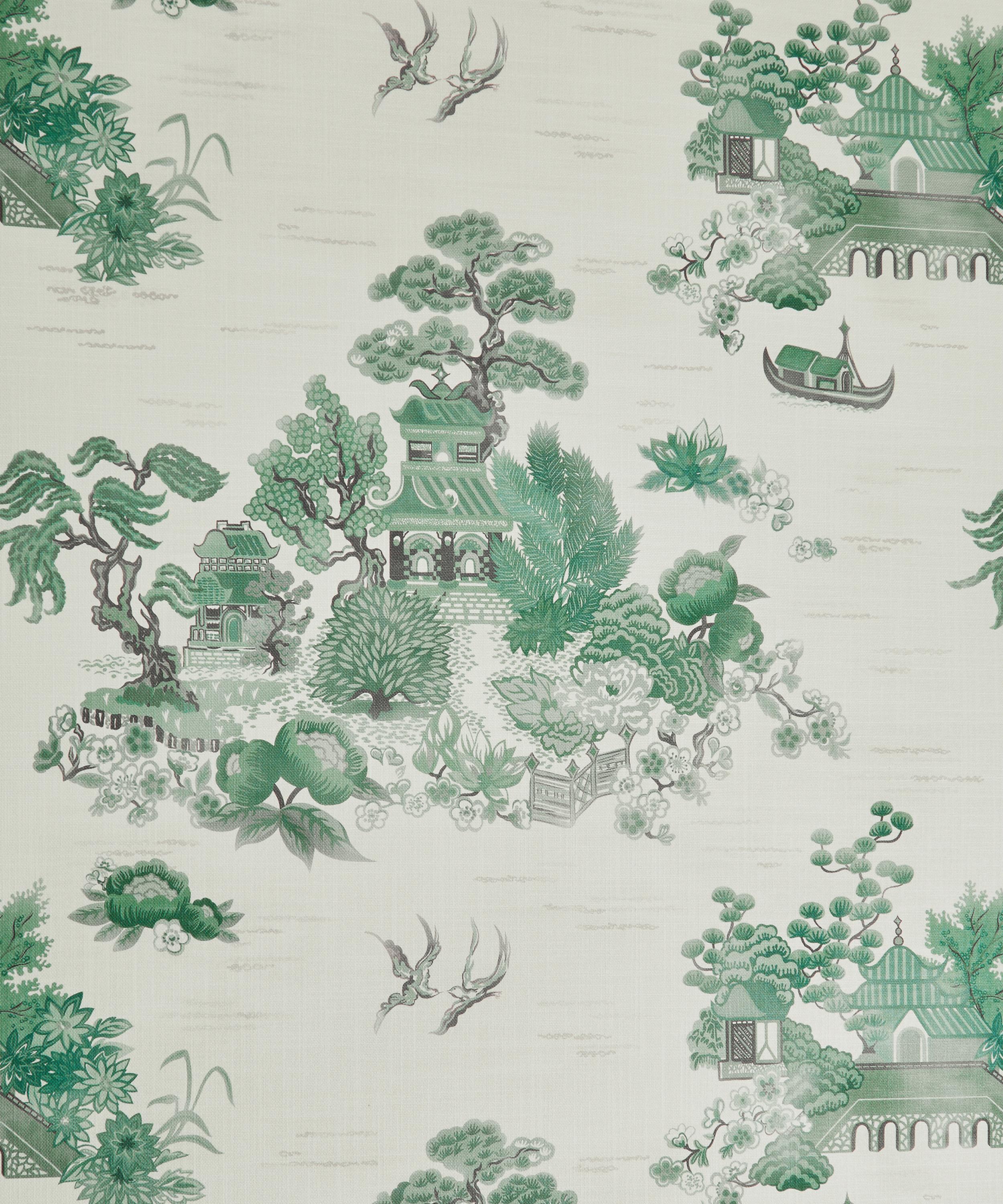 Floating Palace is a reimagined print from the 1970s. Originally a furnishing fabric, it now incorporates new stylistic elements and tonal palettes with intriguing islands filled with lush gardens, oversized lotus flowers, floating sampans, and birds in full flight. Inspired by traditional Chinoiserie wallpaper, it’s printed on paper backed linen providing a fresh, contemporary ground with jade tones.
