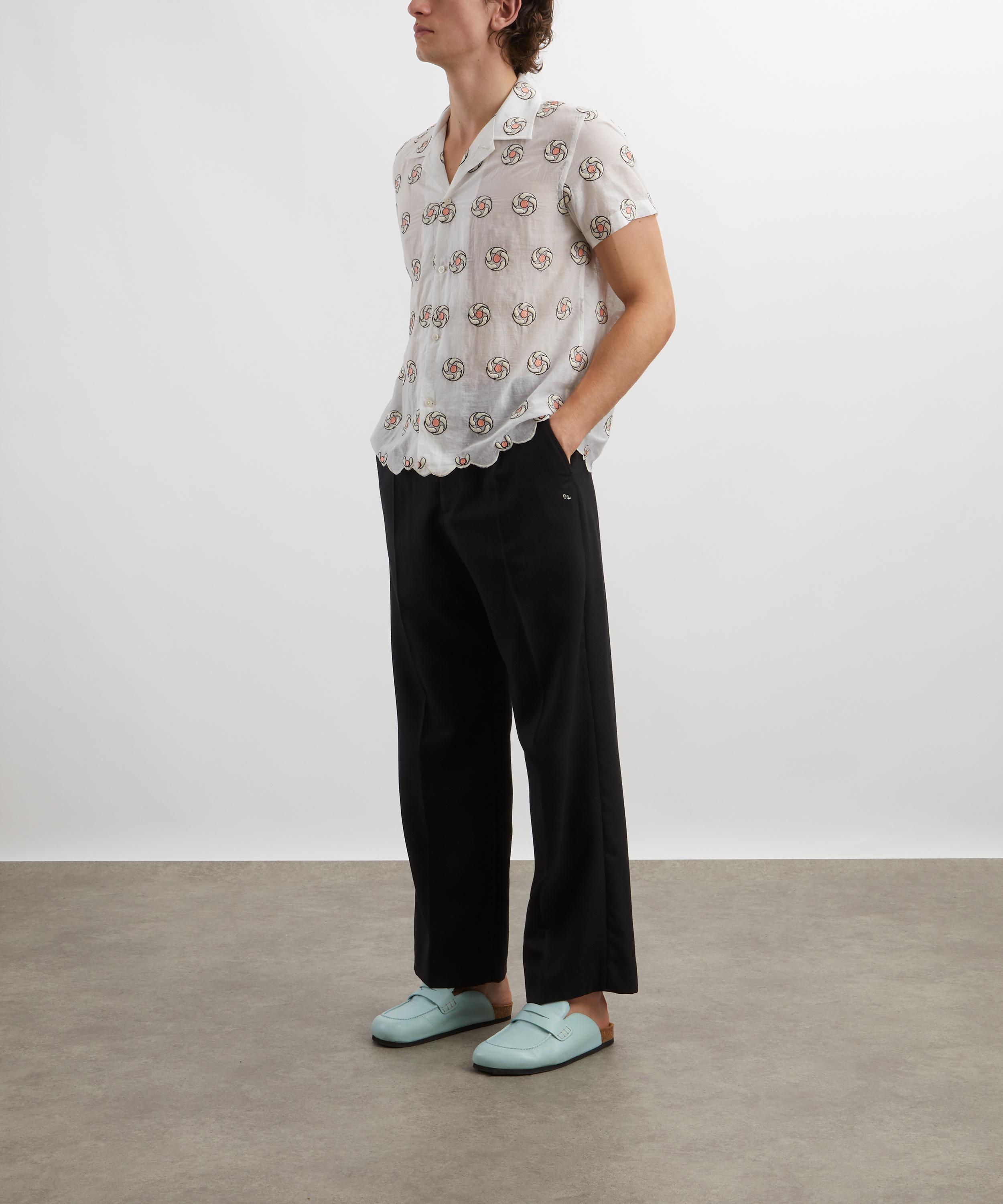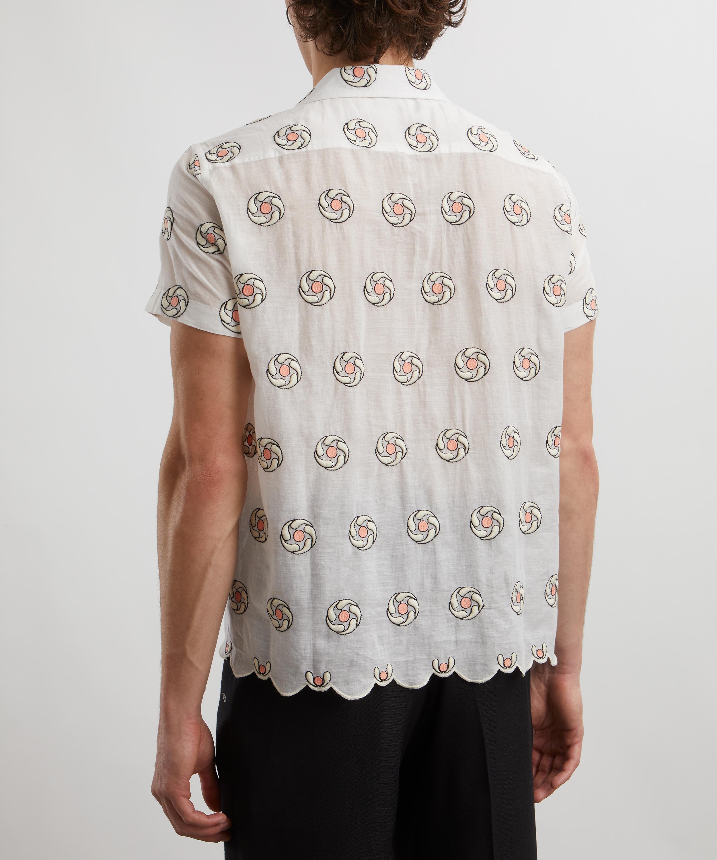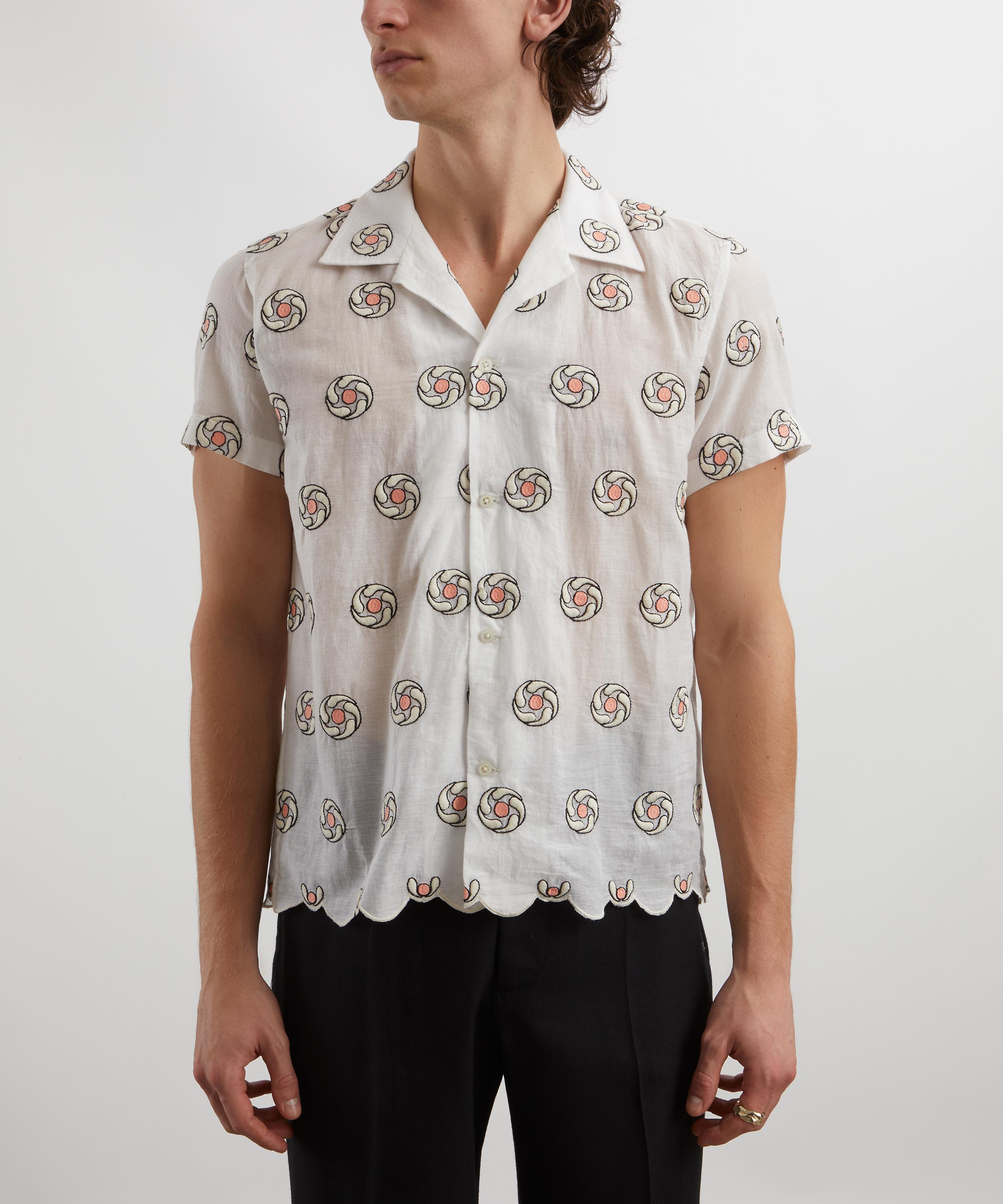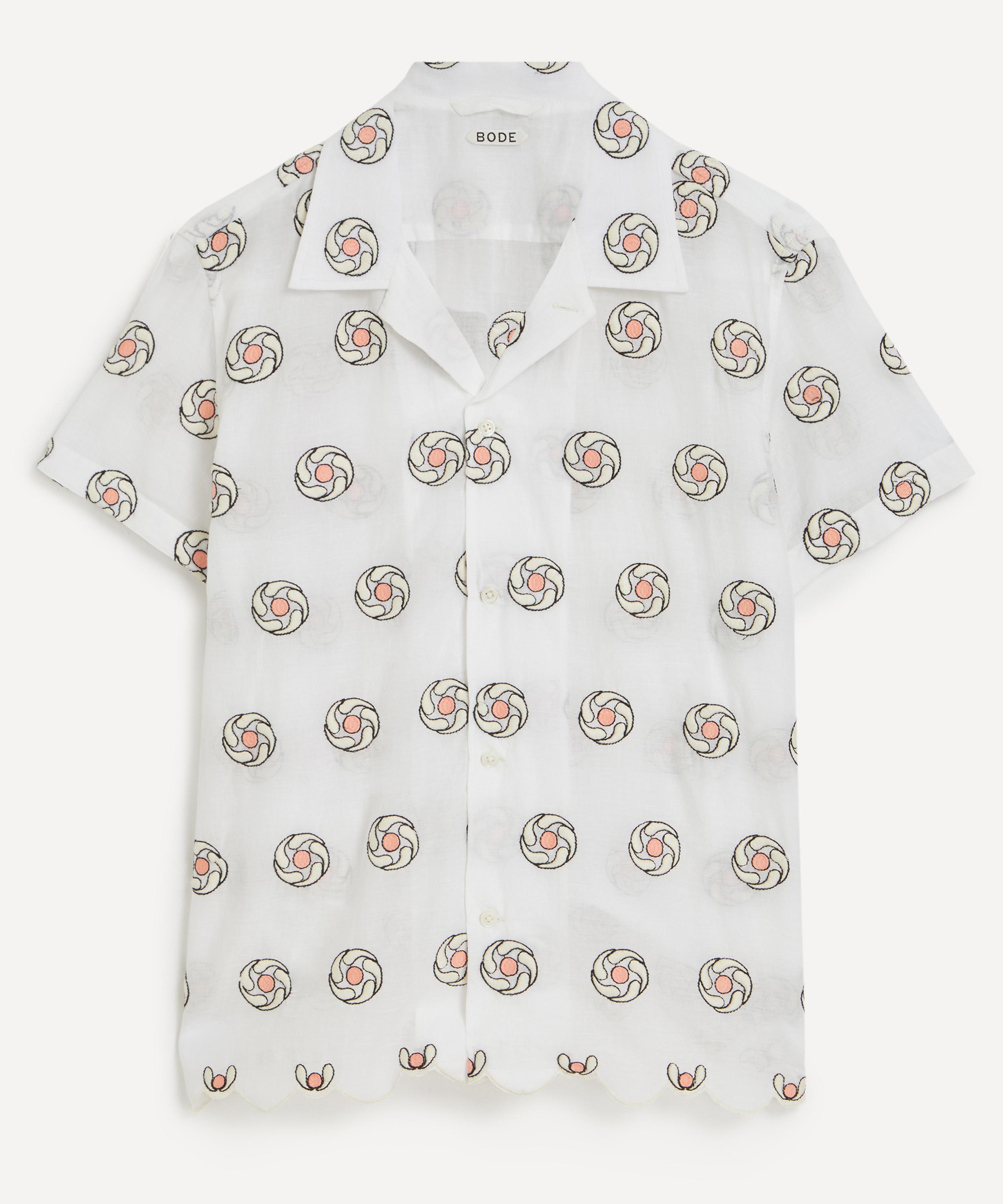 BODE’s ongoing celebration of craft techniques underpins this Floral Aperture short-sleeve shirt. Inspired by a tablecloth from the 1920s, the shirt is expertly cut from soft cotton and decorated with an embroidered geometric floral pattern. It’s finished with a scalloped hem that emphasises the label’s approach to breathing new life into workwear staples using artisanal flourishes.