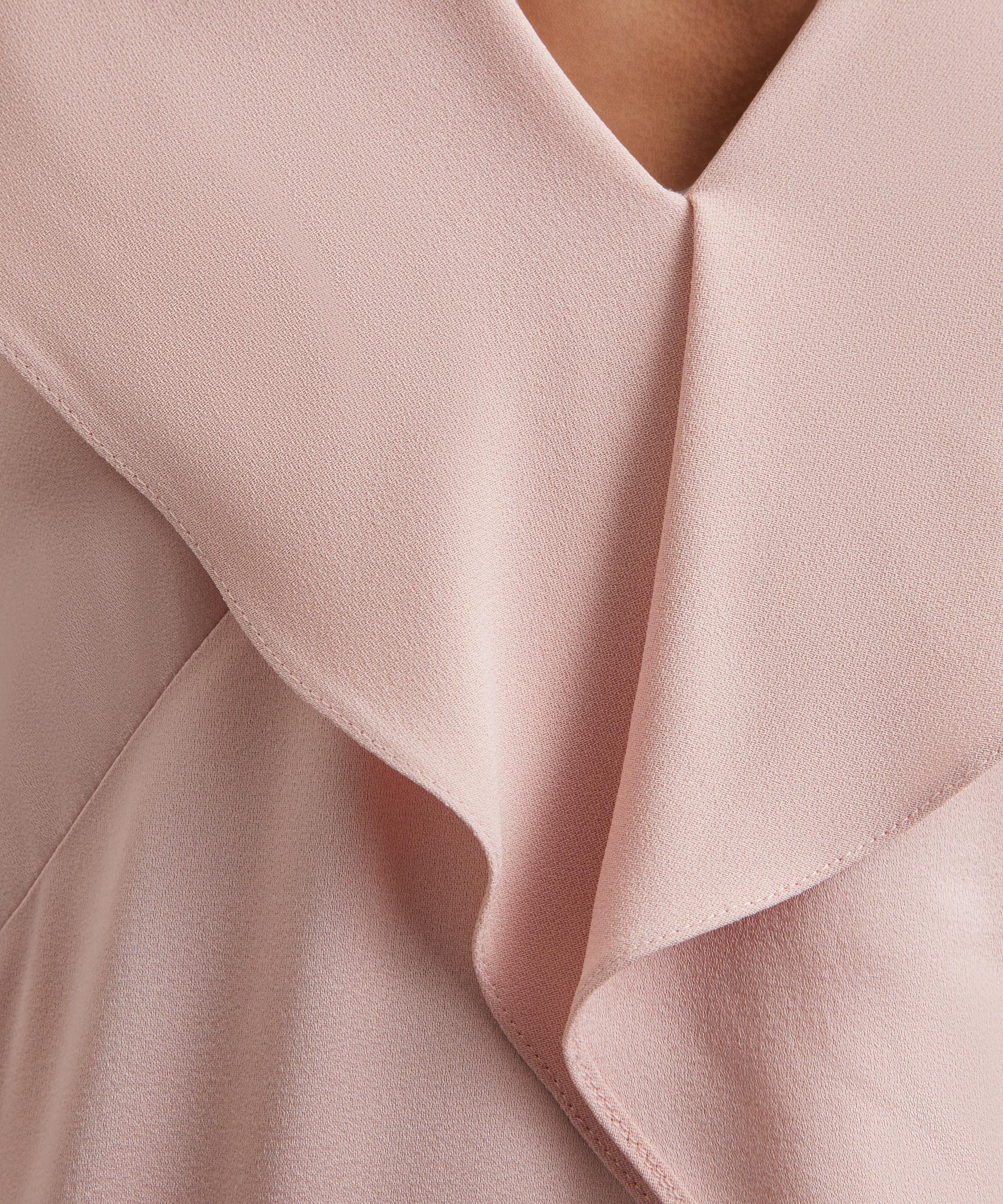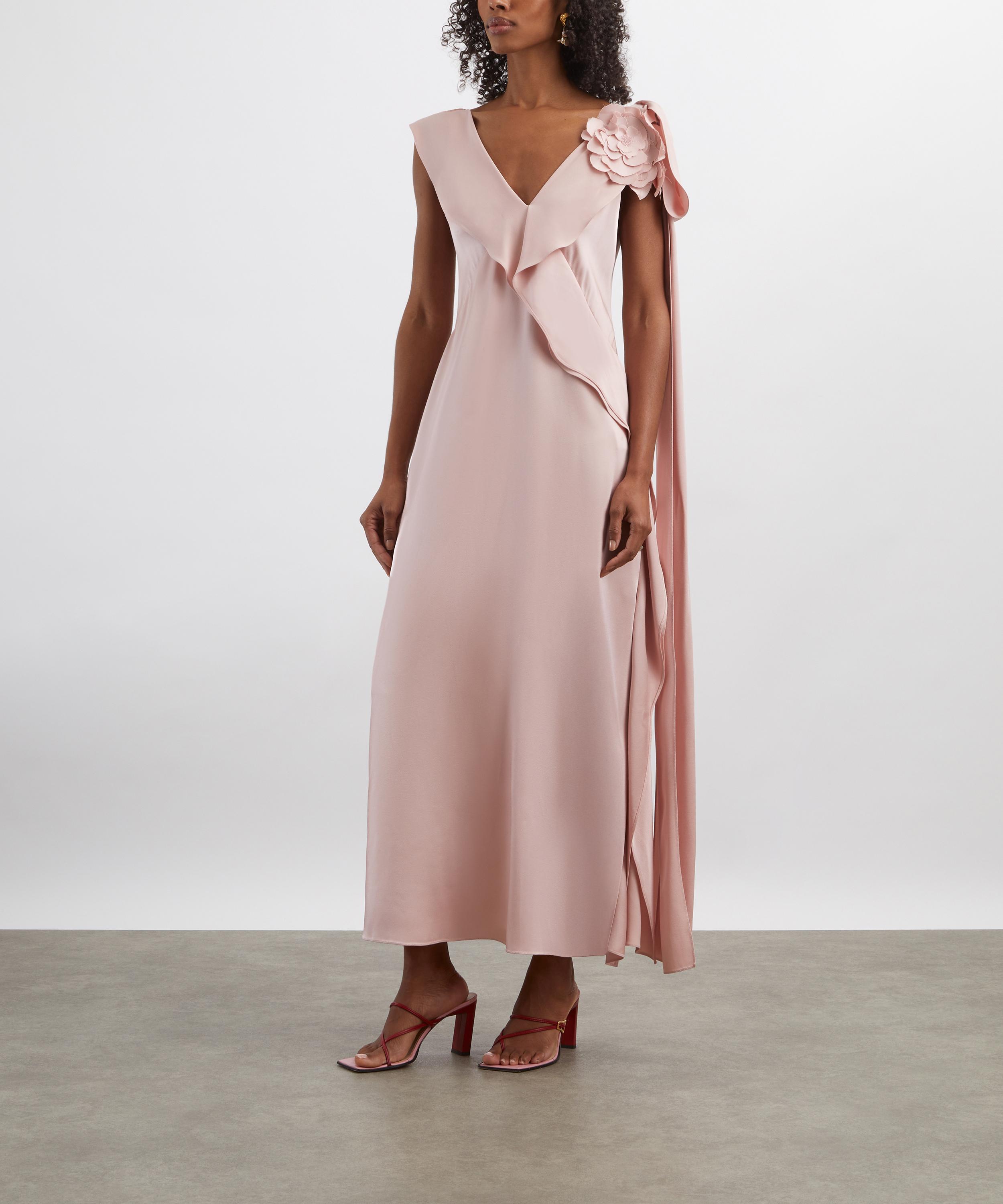 Crafted from sumptuous pink satin, this slip dress embodies contemporary elegance. The sleeveless, relaxed silhouette cascades into a graceful waterfall drape, while the deep V-neckline is adorned with soft ruffles and a tonal 3D floral appliqué for an effect of understated allure.