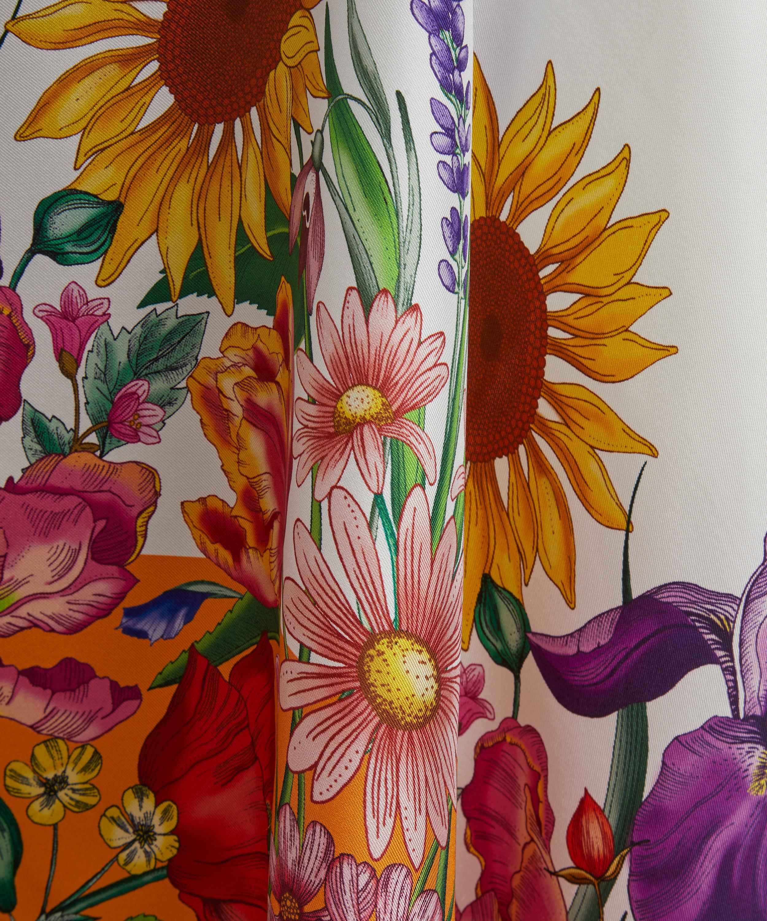 Meticulously crafted in Italy from a luxurious and ultra-soft silk fabric, it’s characterised by our showstopping Floral Muse print – featuring a hand drawn design overflowing with botanical splendour with a variety of colourful blooms including poppies, daisies, sunflowers, irises, tulips and lavender. Designed to stand the test of time, this versatile accessory staple will breathe new life into your wardrobe with its rich colouration and texture, perfect for layering.