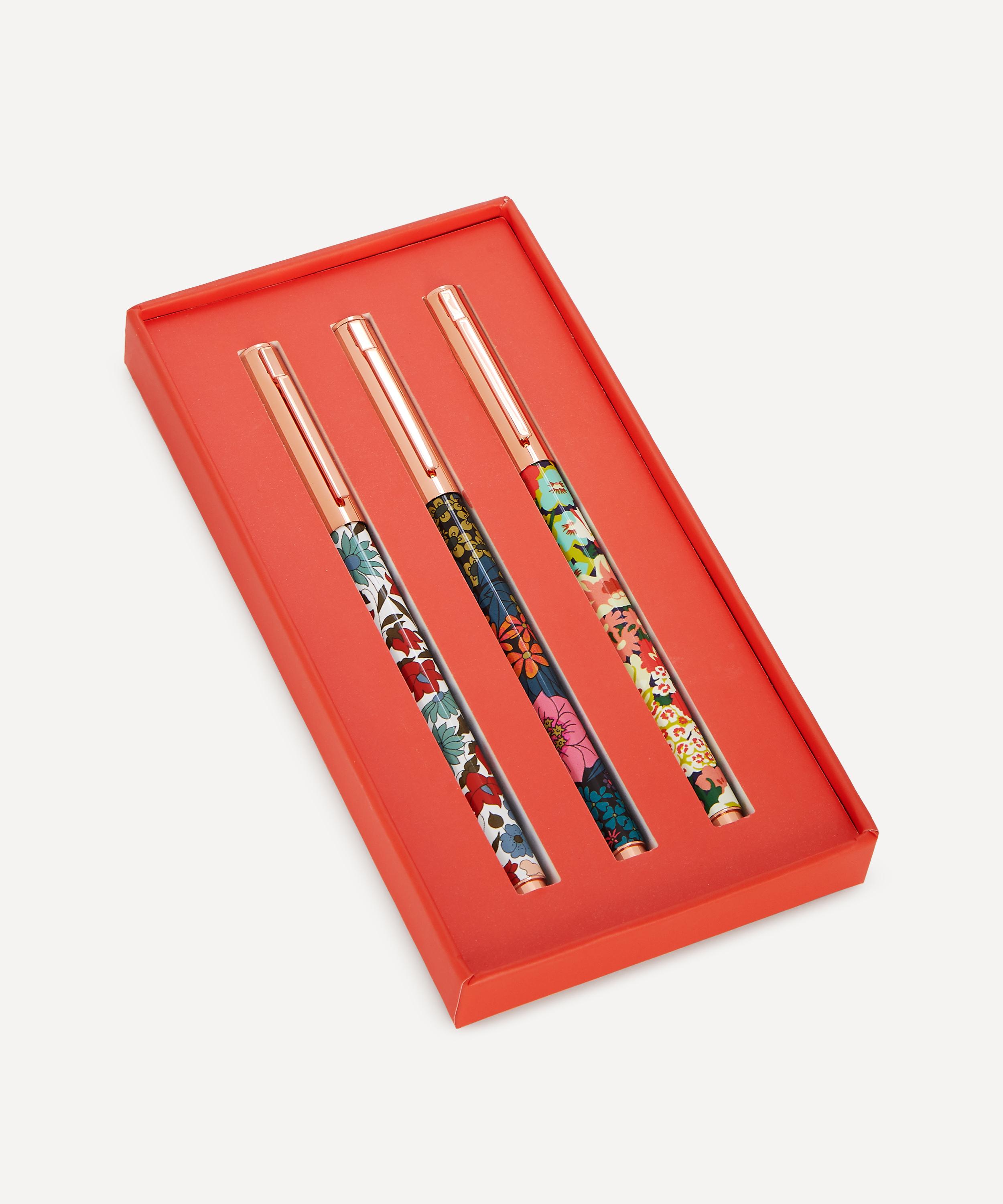 Each of these three ballpoint pens features black ink and a handy cap, presented together in a matching box. The pens are printed with three different iconic Liberty florals, alluding to our brand’s long and unique history of print design. Keep them handy in a pot or pencil case, and practice for perfect penmanship.