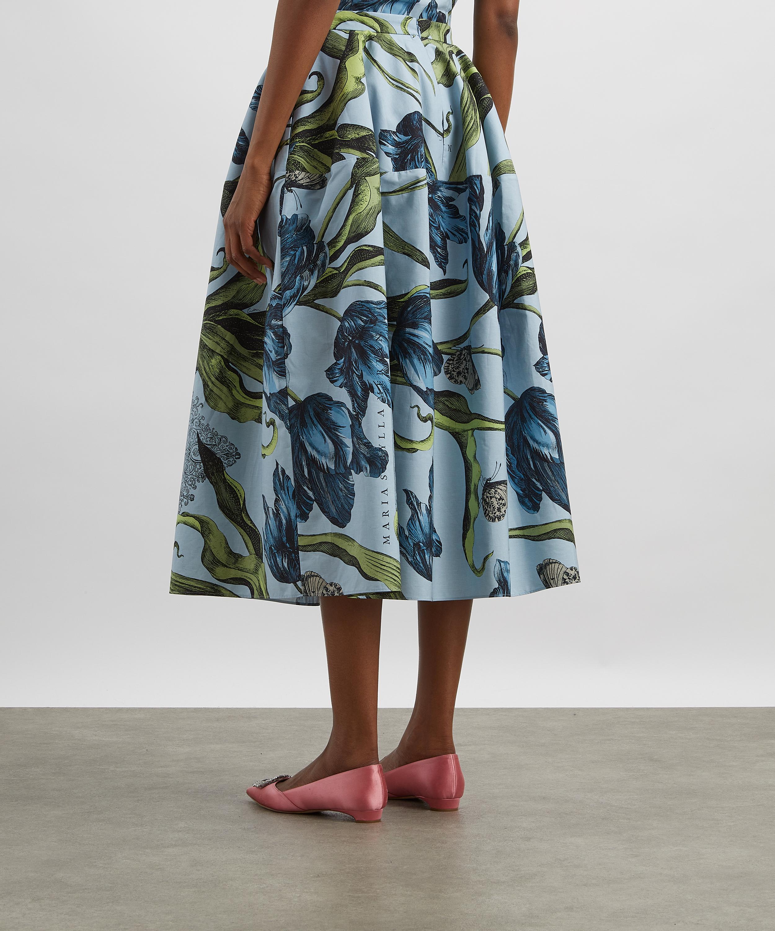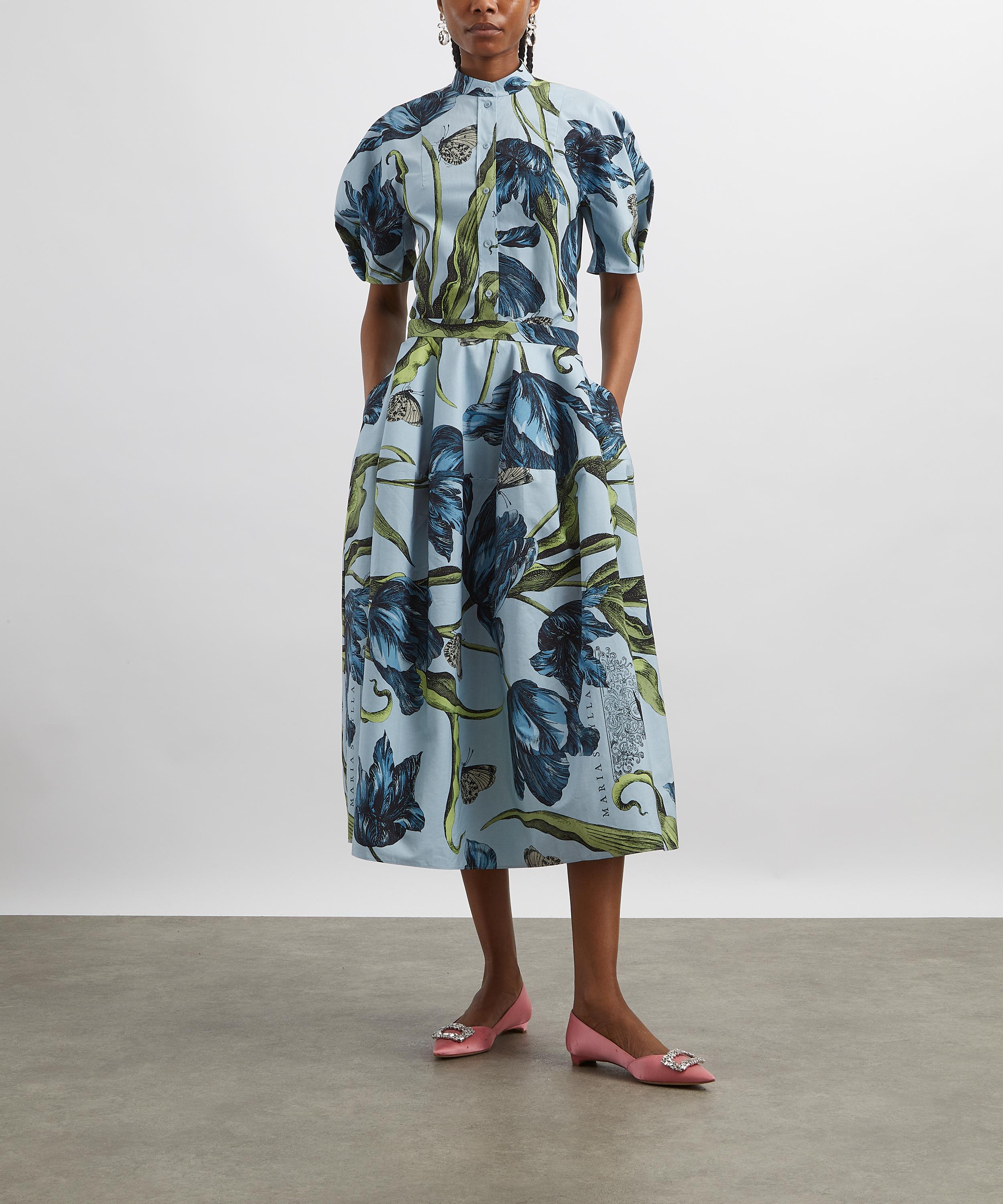 Crafted from structured cotton poplin in a soft powder blue hue, this elegant midi skirt is adorned with large tulips and butterflies, inspired by drawings by Maria Sibylla Merian. Featuring a flattering full silhouette, it is complete with a concealed zip closure, hidden side seam pockets and an ankle-length hem for a timeless and refined finish.