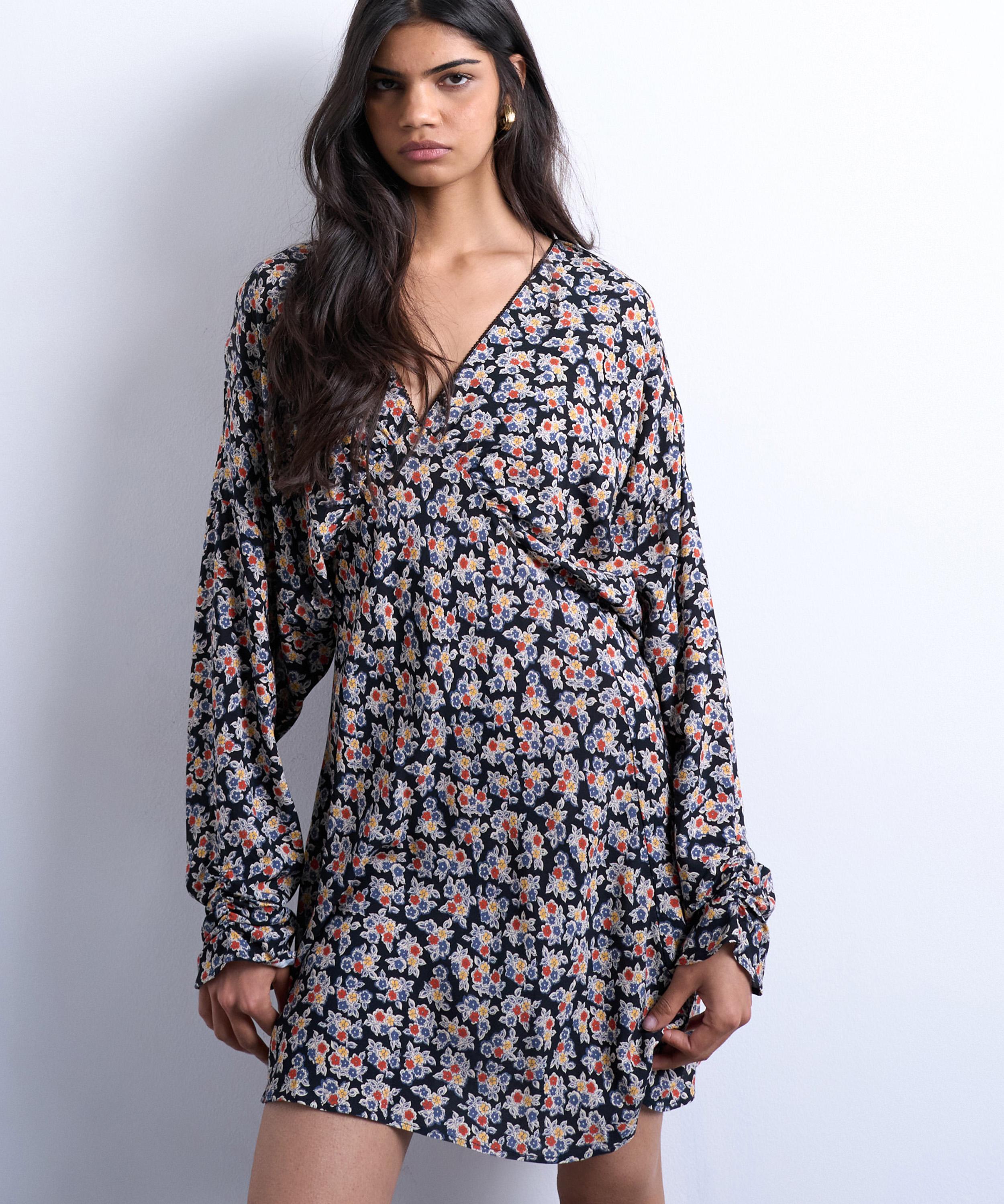 Crafted from a woven fabric adorned with an all-over floral print in contrasting hues, this charming dress features a fitted waist, a V-neckline, long sleeves with softly ruched cuffs, and a floaty, mini-length hem, creating an effortlessly flattering and feminine finish.