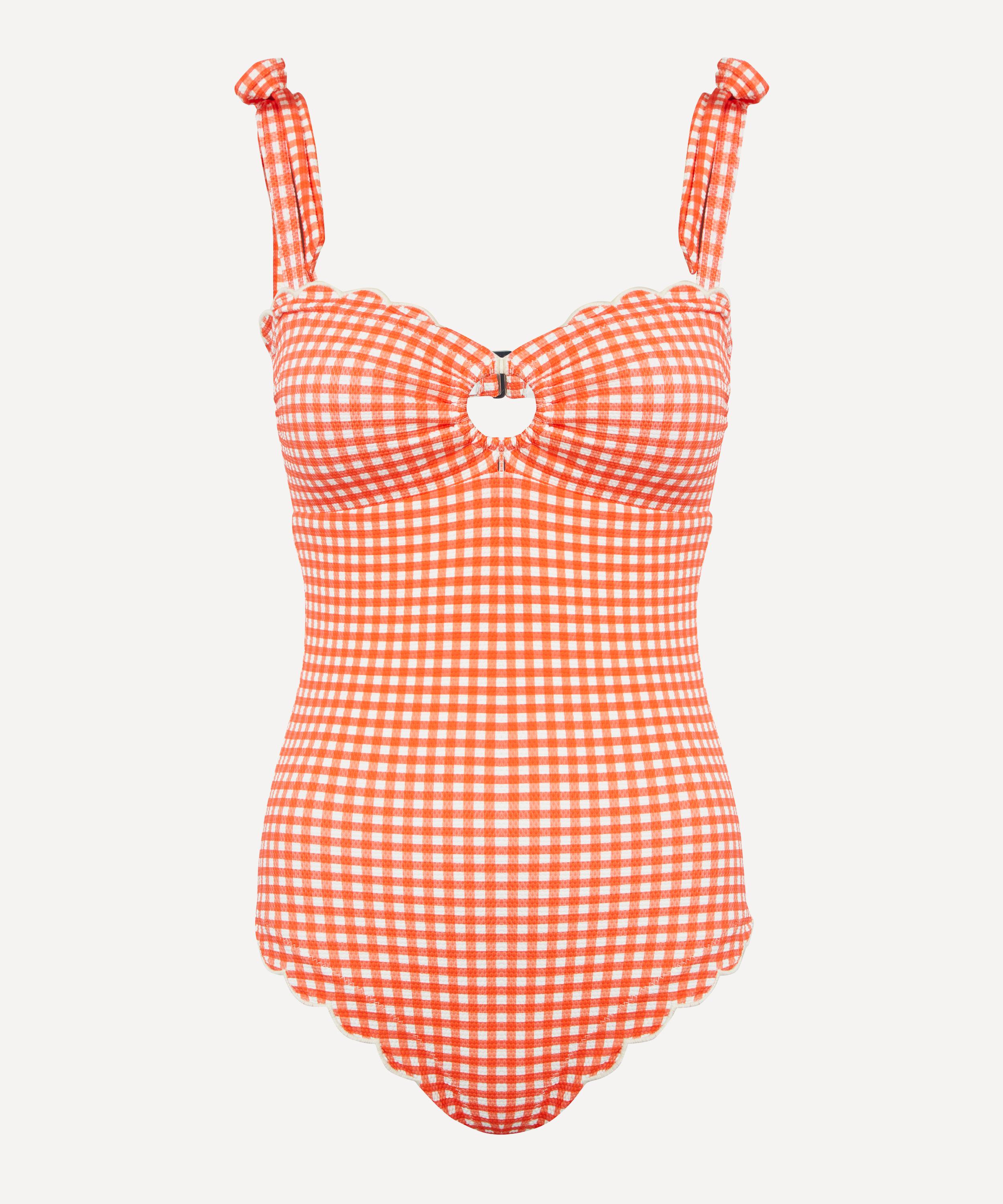 Effortlessly flattering, this one-piece swimsuit is crafted with a double-lined construction to gently sculpt the body while offering full bottom coverage. Featuring a vibrant orange gingham check, it’s finished with a circular cut-out at the bust for a chic, retro-inspired touch.