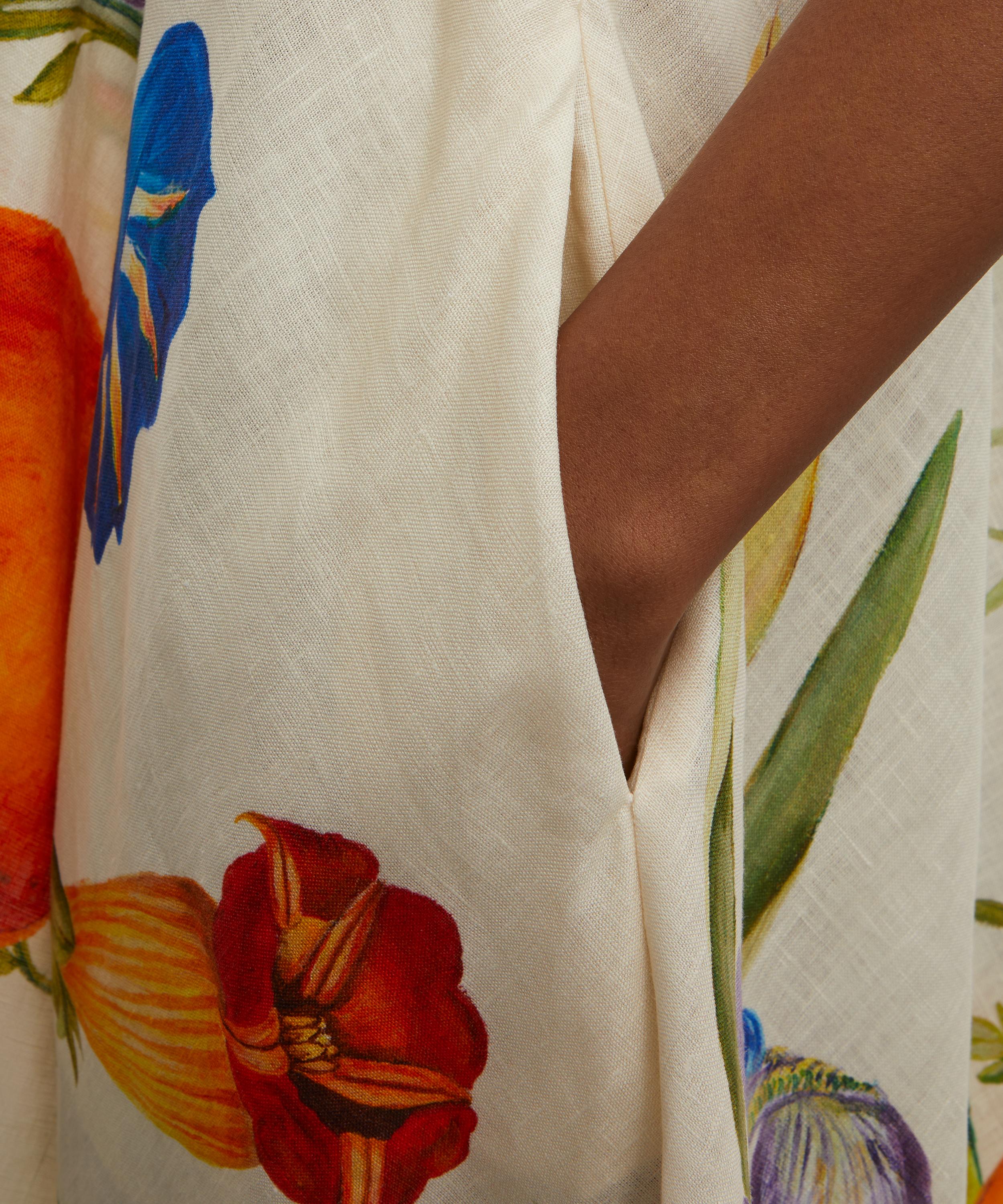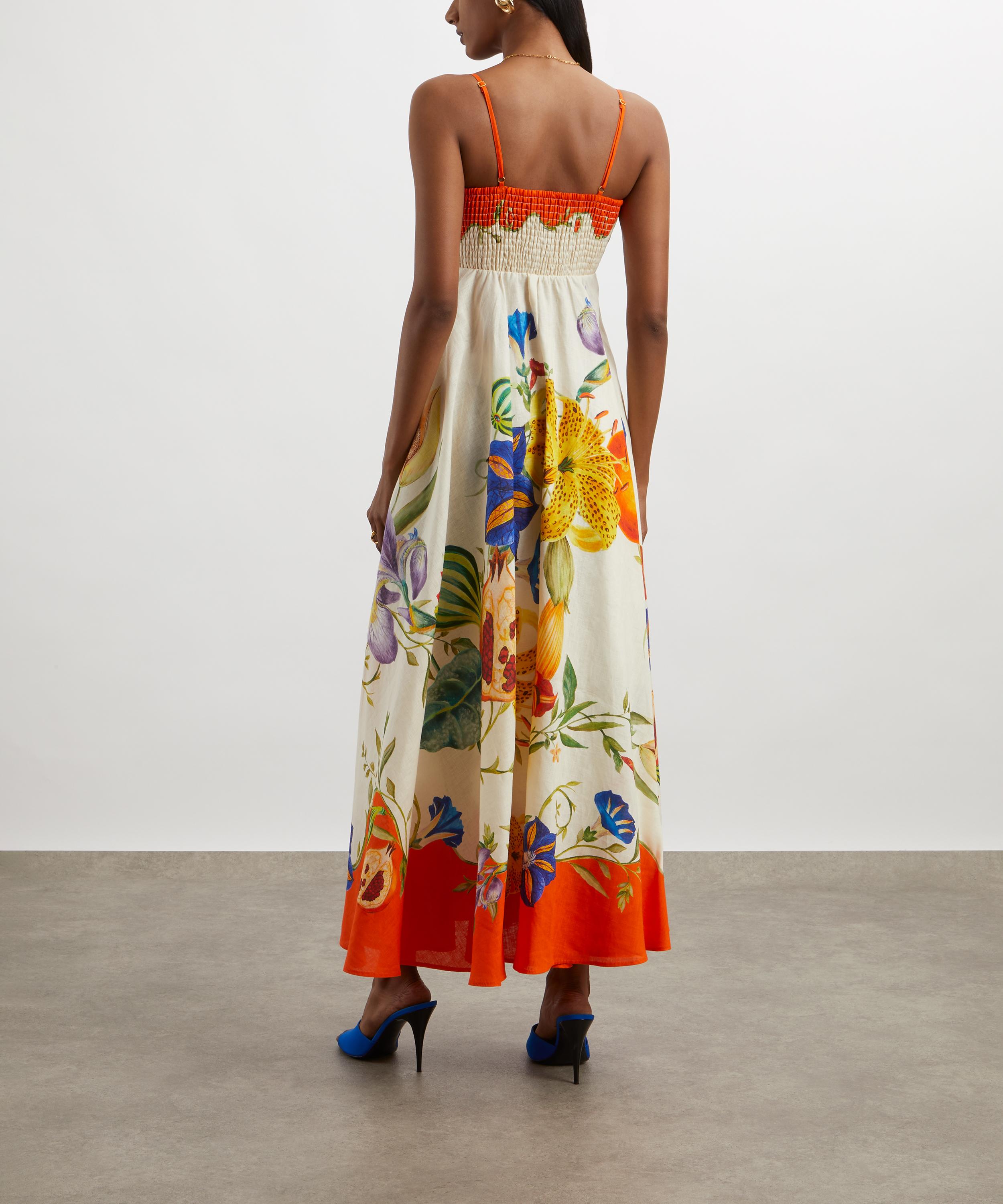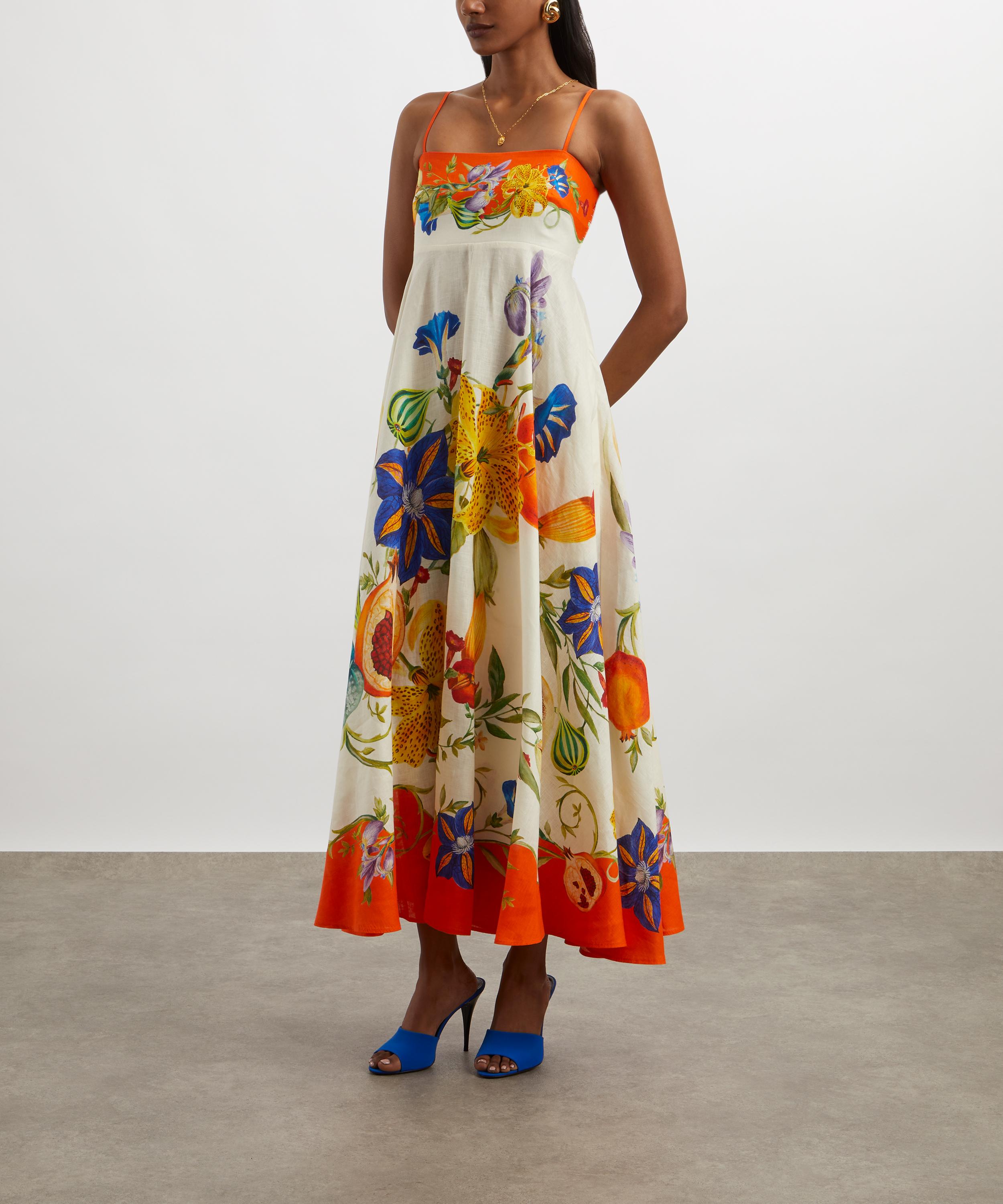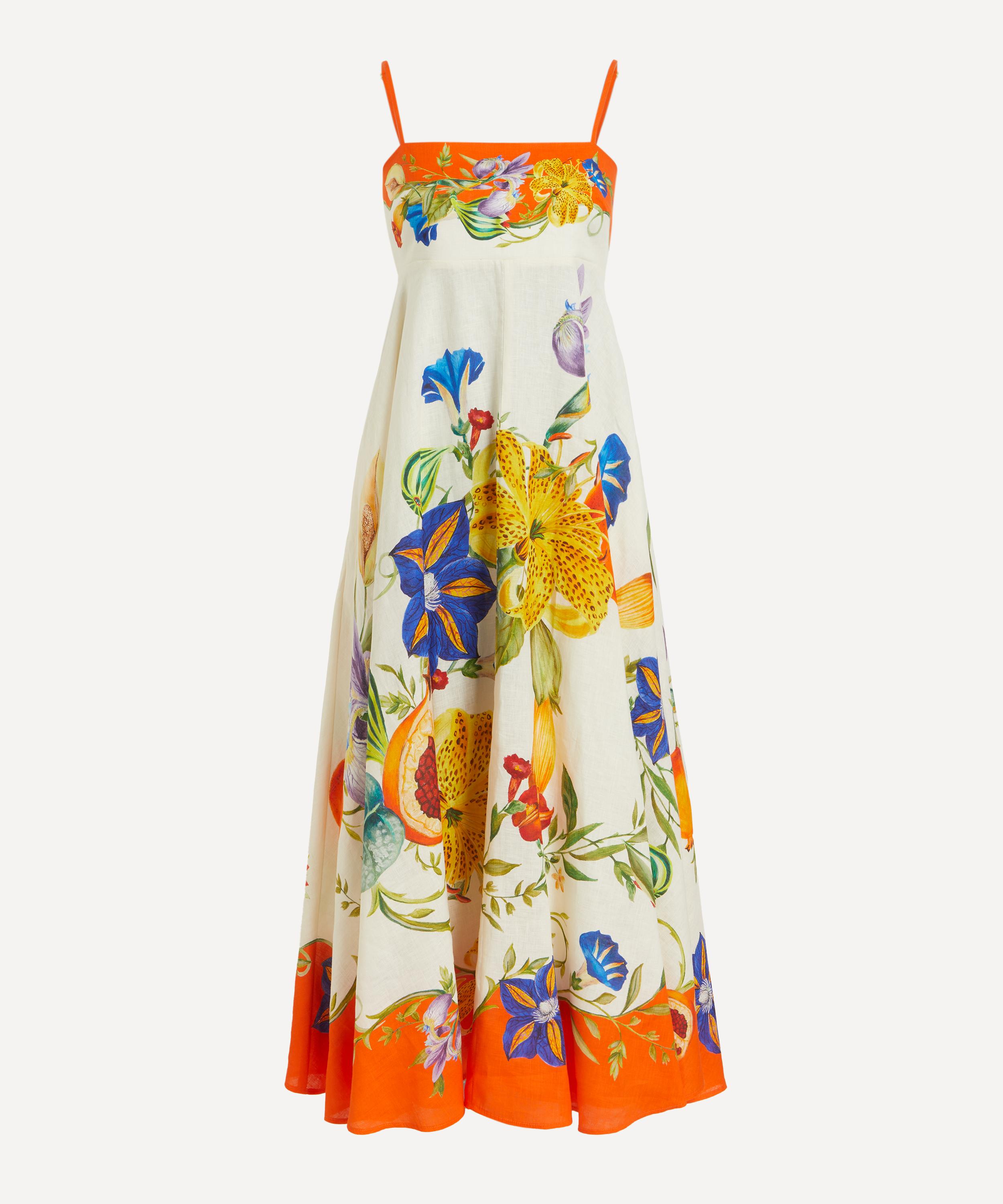 Crafted from breathable flax linen, this elegant day dress is designed for a fitted bust and features a square collar, adjustable straps, and a shirred panel to the back bodice, and is complete with a brightly-hued artistic fruit and flower print.