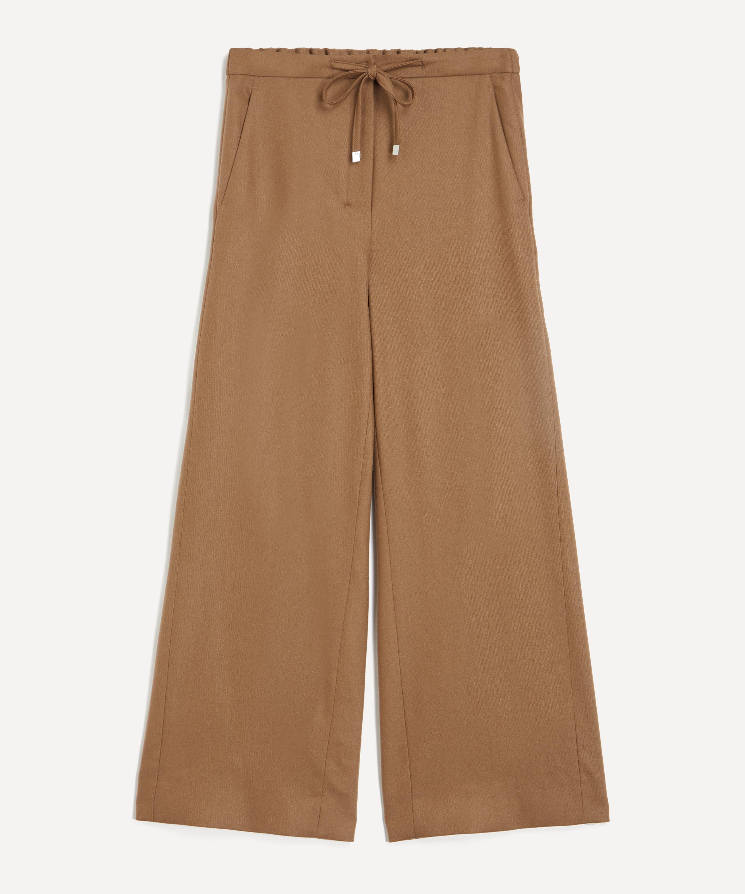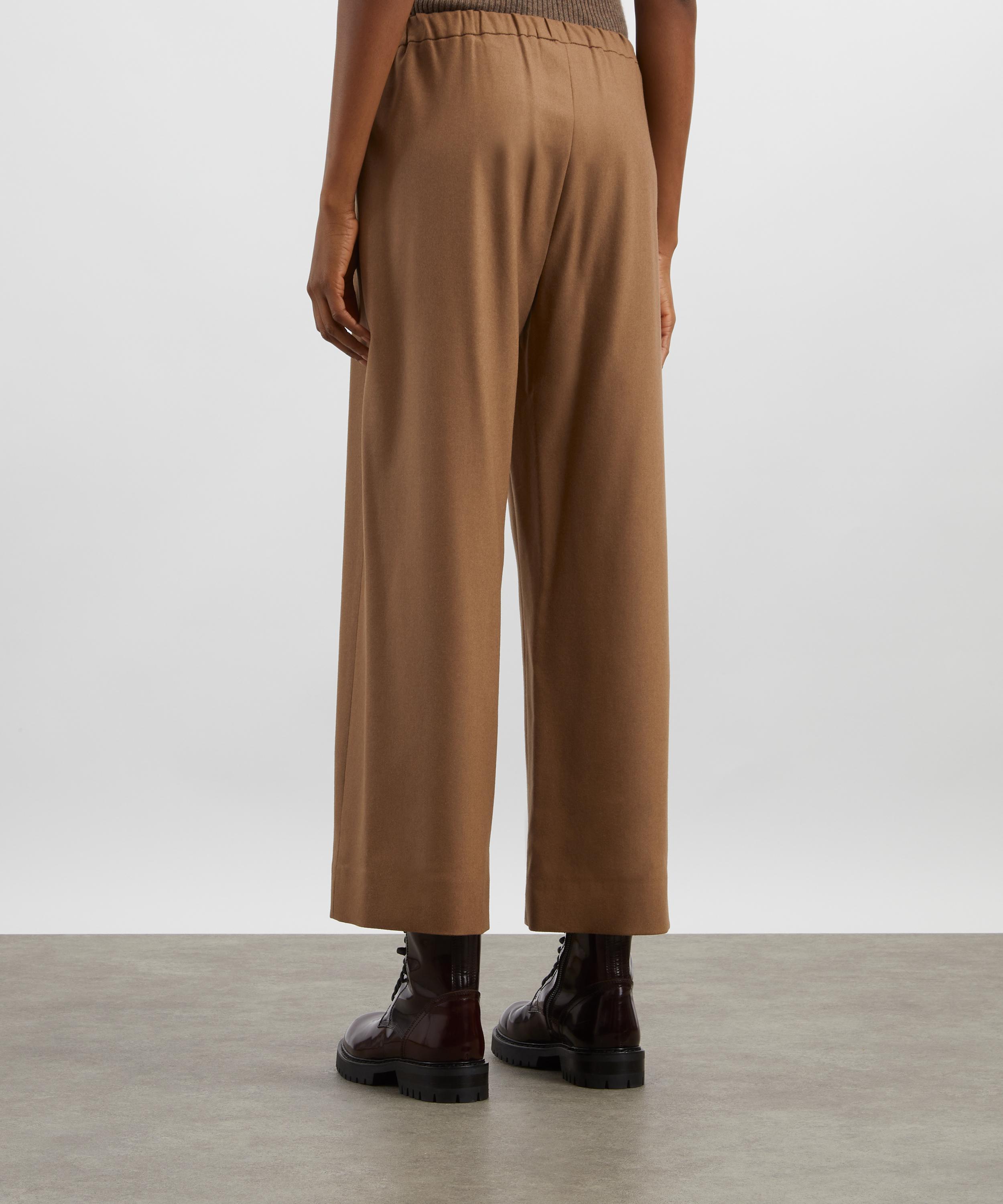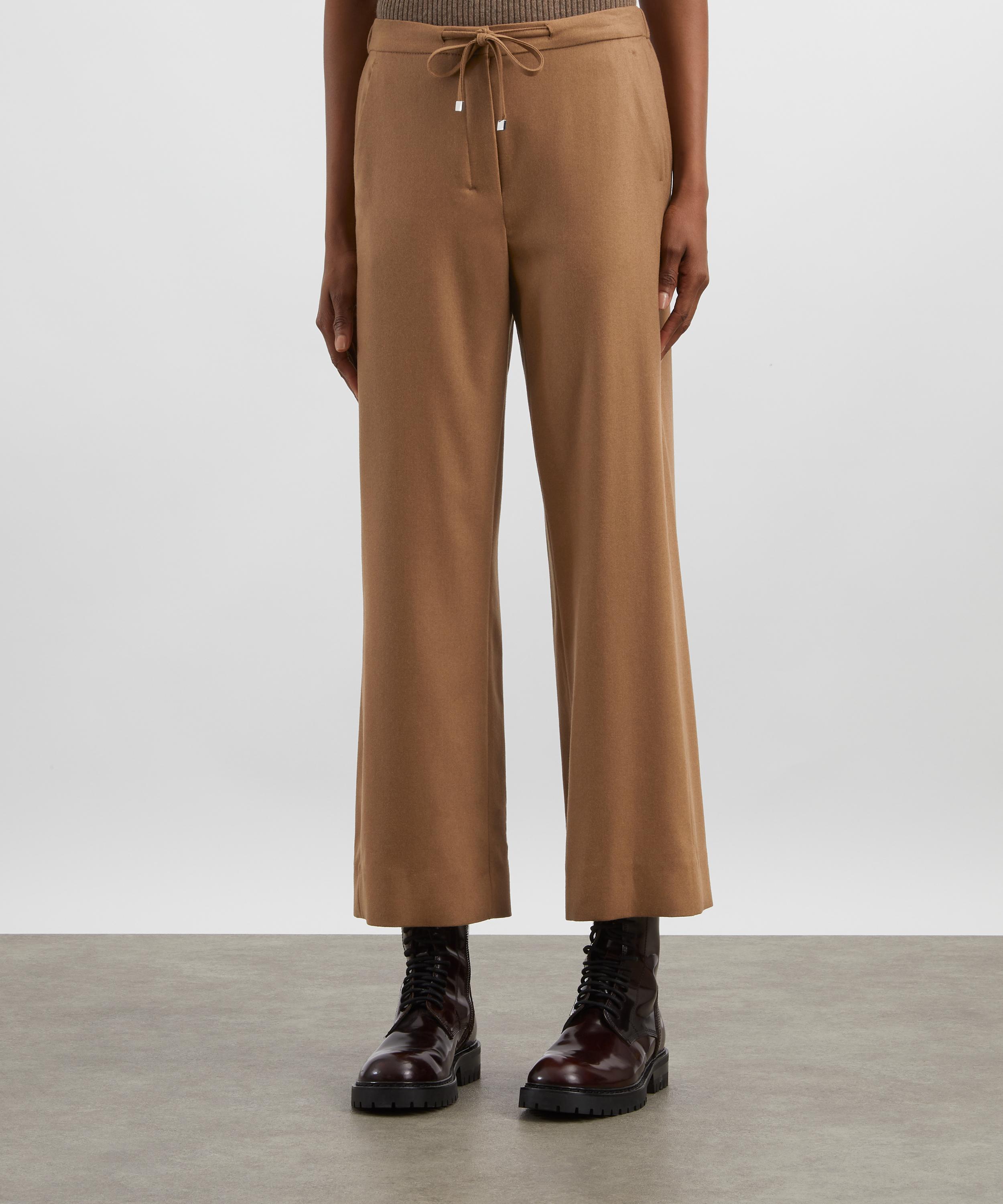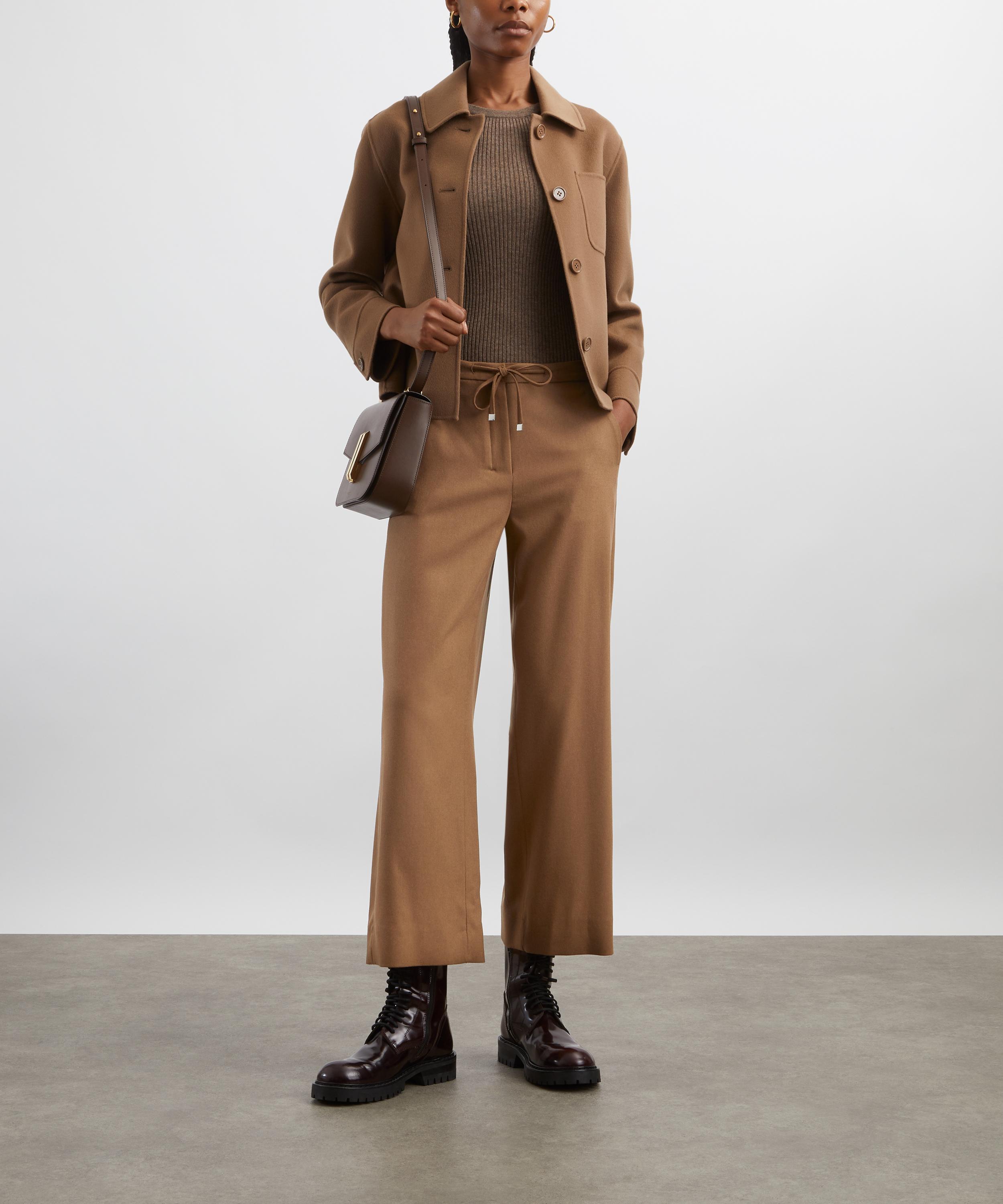 Crafted from stretch wool flannel in a classic camel hue, these joggers offer understated elegance with a relaxed, cropped silhouette. Finished with an elasticated drawstring waist, they blend refined style with everyday comfort.