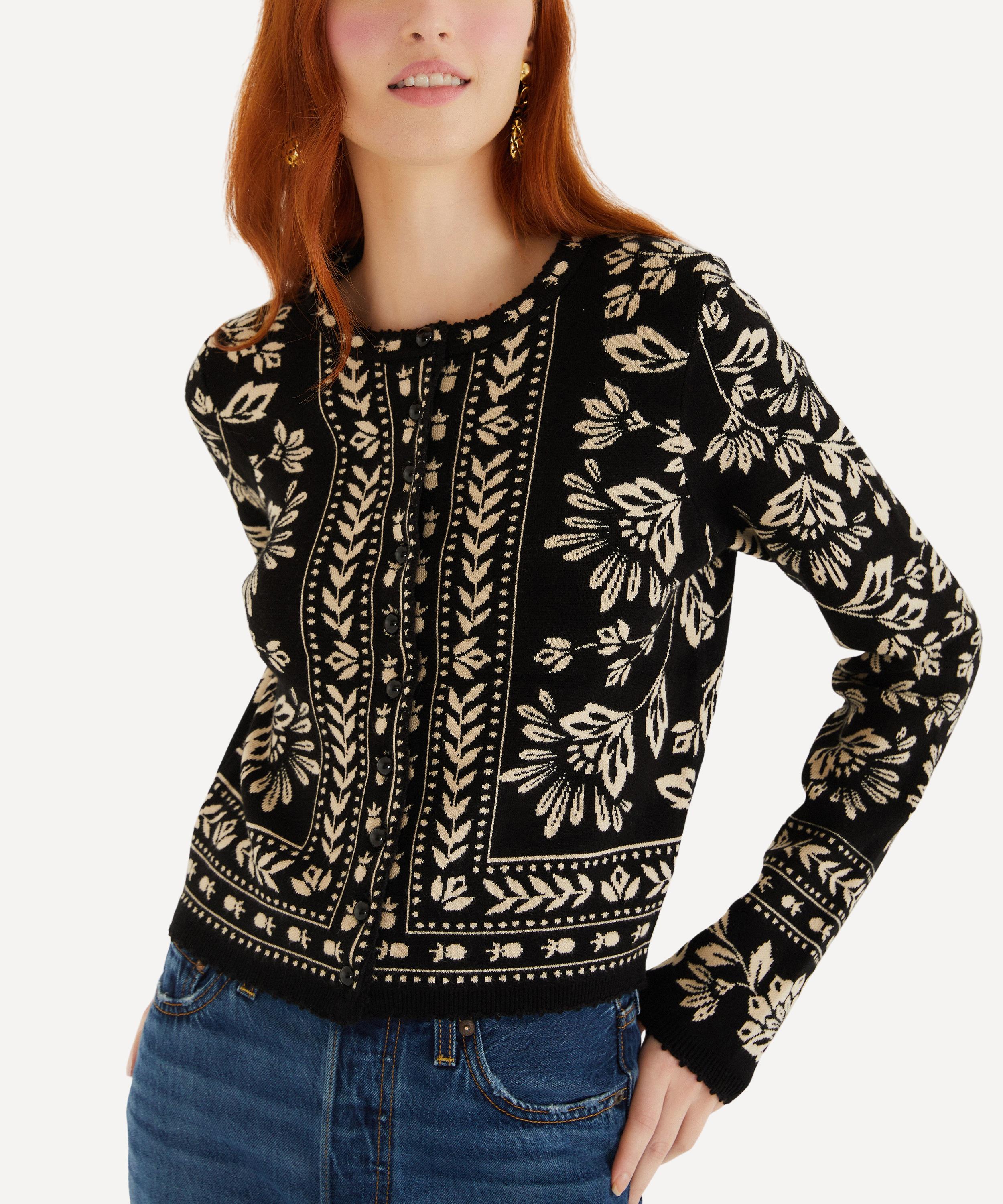 The Flower Bloom Knit Cardigan charms with the monochrome Flower Bloom print for an eye-catching look. Its long sleeves, crew neck, button closure, and ribbed trims create a cosy, playful statement - making it the perfect seasonal layer.