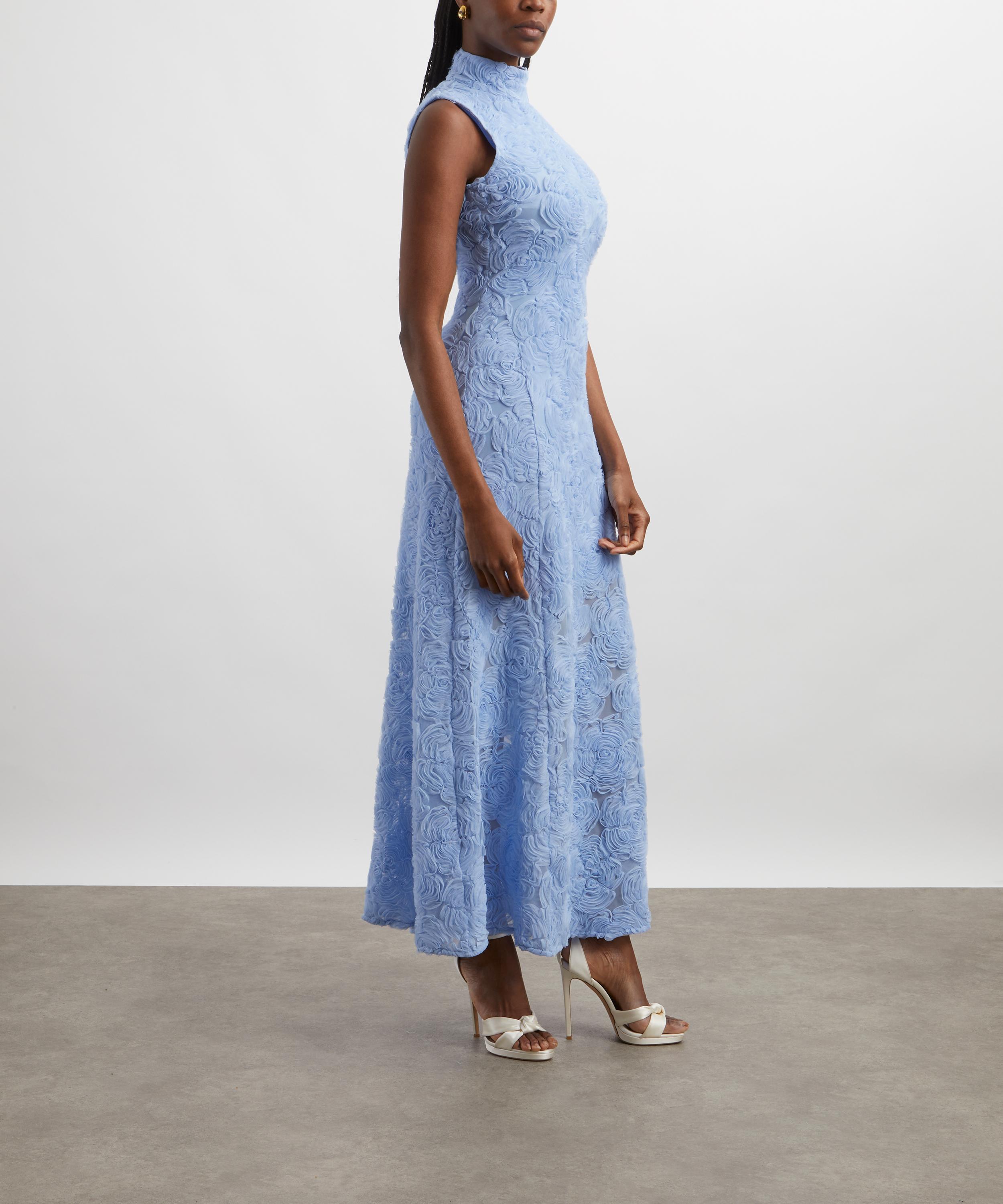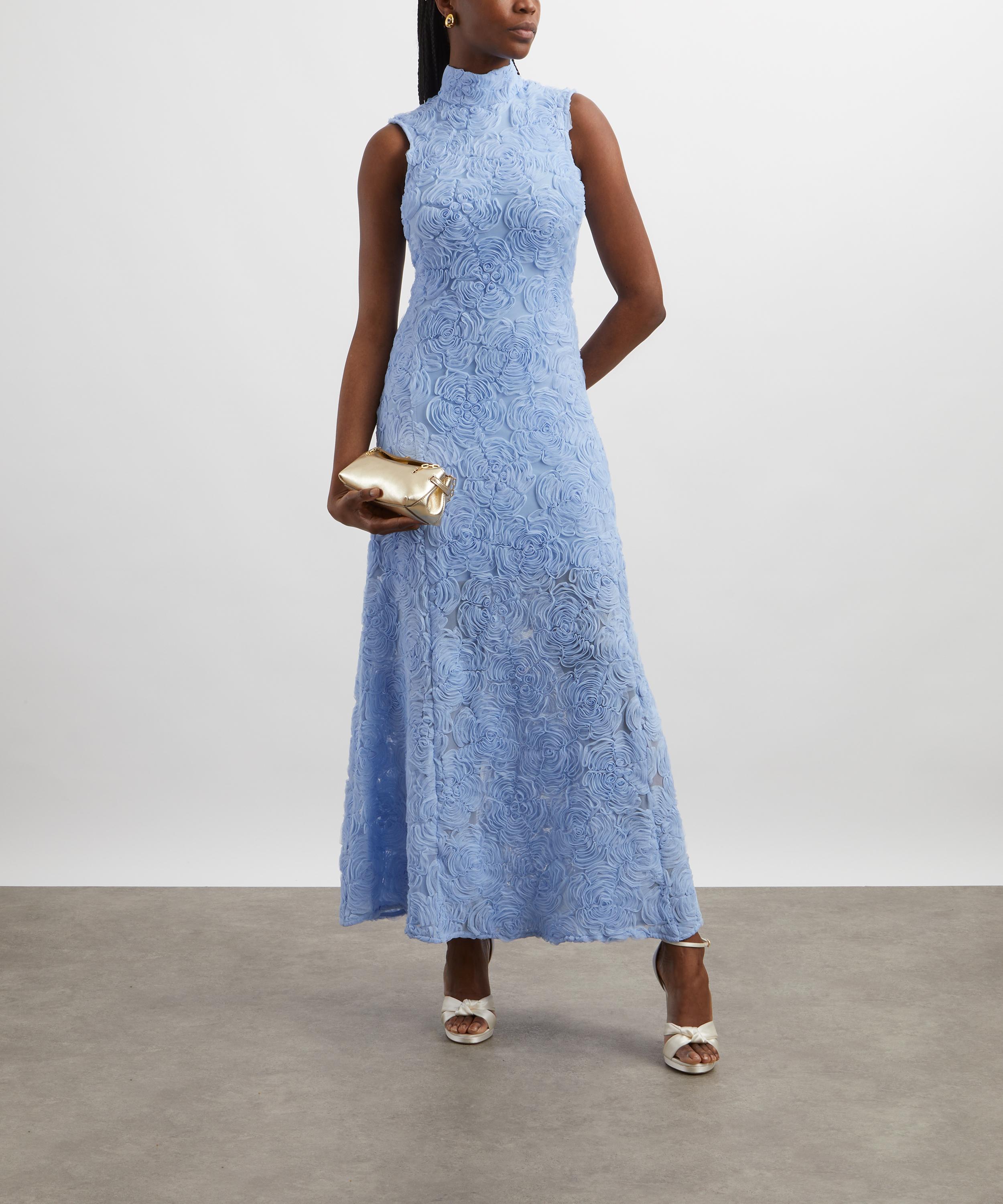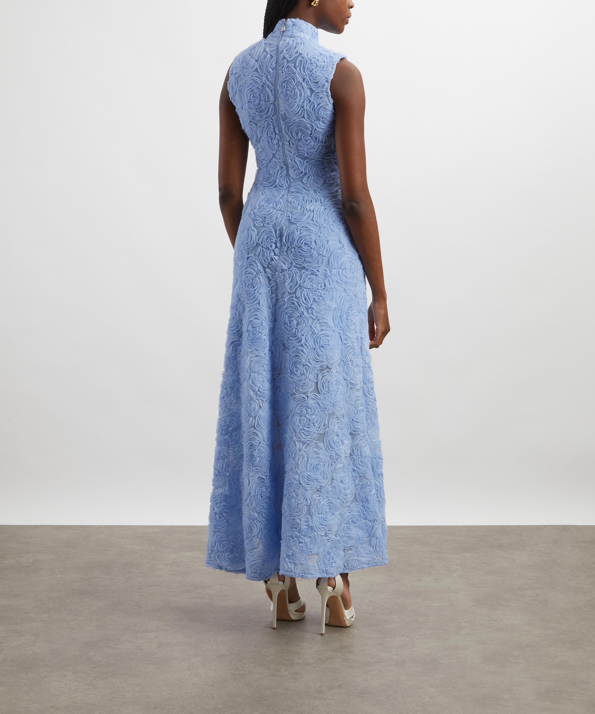 With its floor length hem and high collar, this dress offers a captivating look and ease of wear thanks to its concealed back zip closure. Adorned with 3D floral mesh embroidery, it’s perfect for making a glamorous entrance at any event.