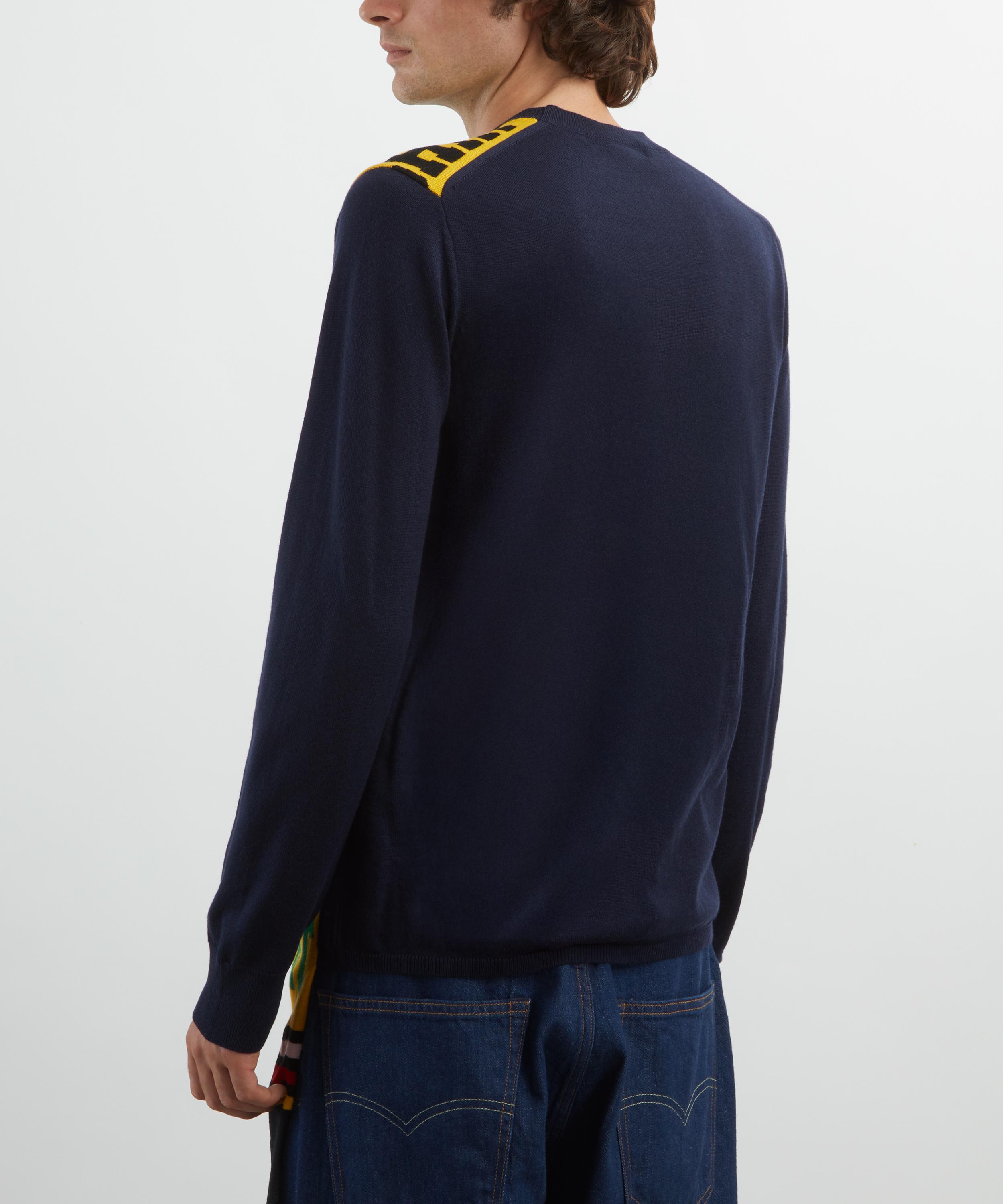 Featuring a round neckline, long sleeves, and rib-knit trims, this navy wool-blend jumper is boldly finished with an extended football scarf panel at the front for a striking, athletic-inspired touch.