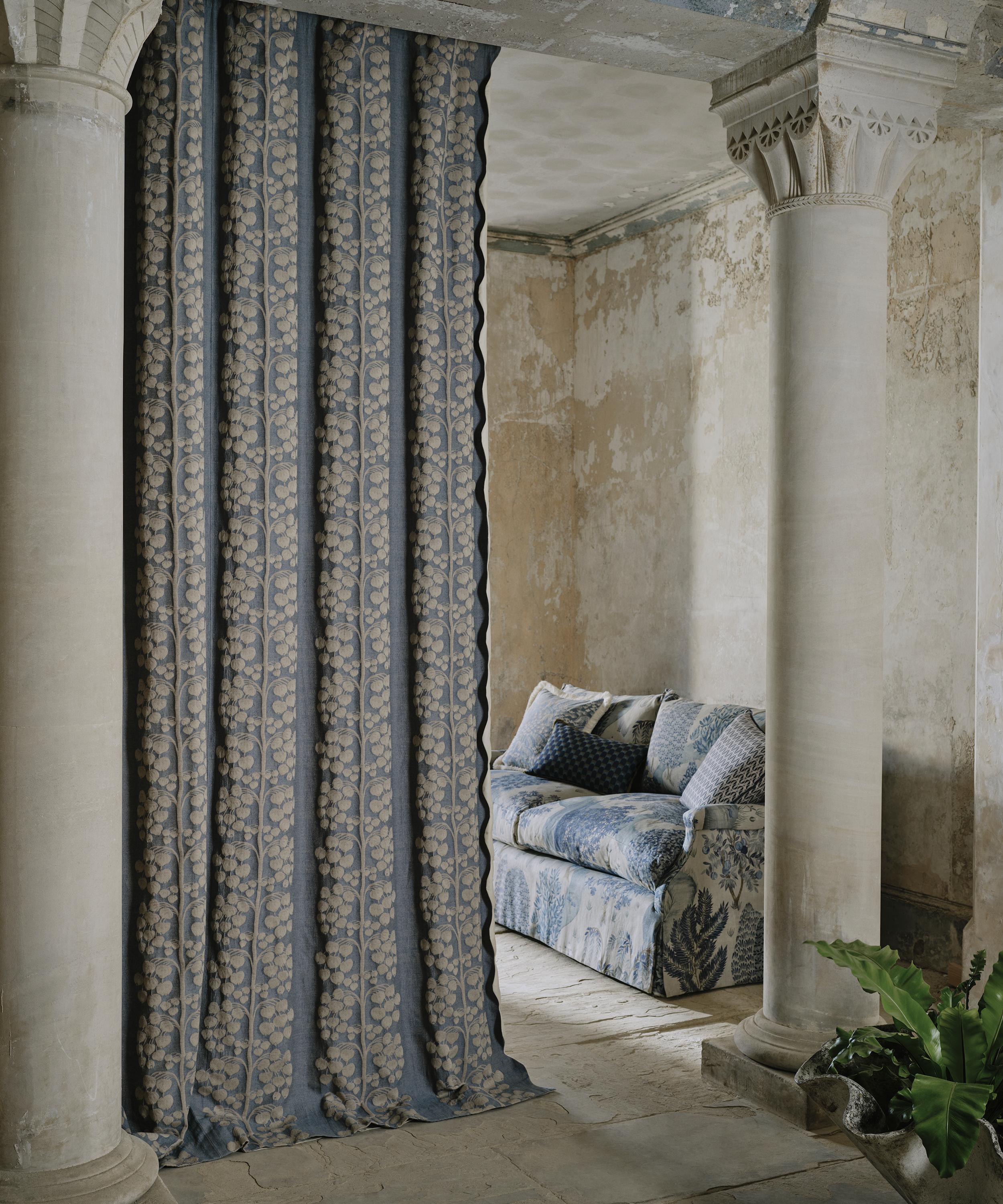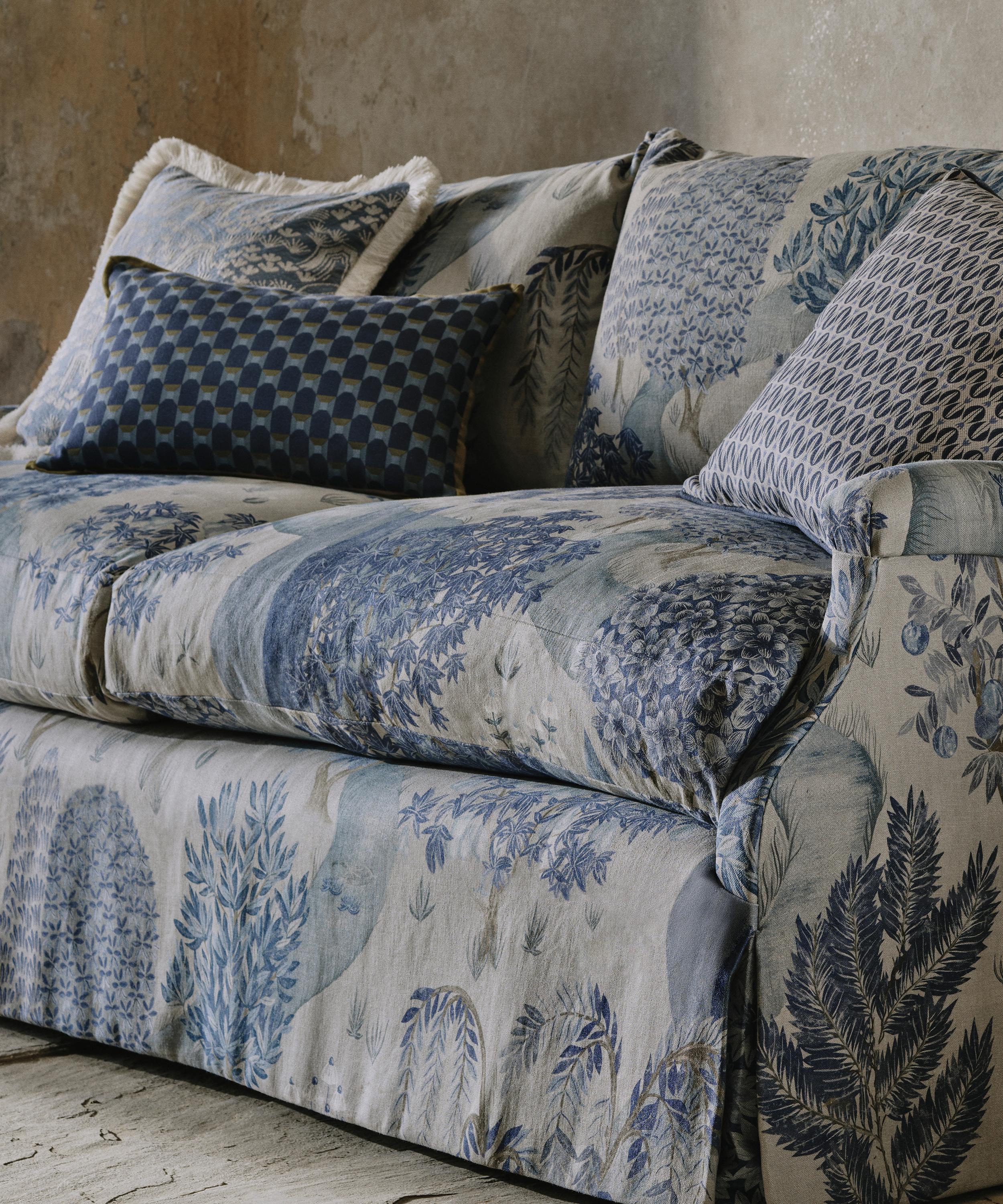 The Botanical Atlas fabric collection celebrates our historic lineage of craftsmanship and design through a cross-pollination of styles and visual narratives. Richly layered embroideries, opulent textured weaves, and contemporary printed velvets and linens are juxtaposed with a selection of elegant stripes and mesmerising geometrics - expertly crafted using traditional and cutting-edge techniques in Italy, Belgium, and India. Based on a fabric swatch found in the Liberty archive, Forest Hills is reminiscent of traditional Japanese woodblock prints and embraces the aesthetic and characteristics of a Zen Garden.