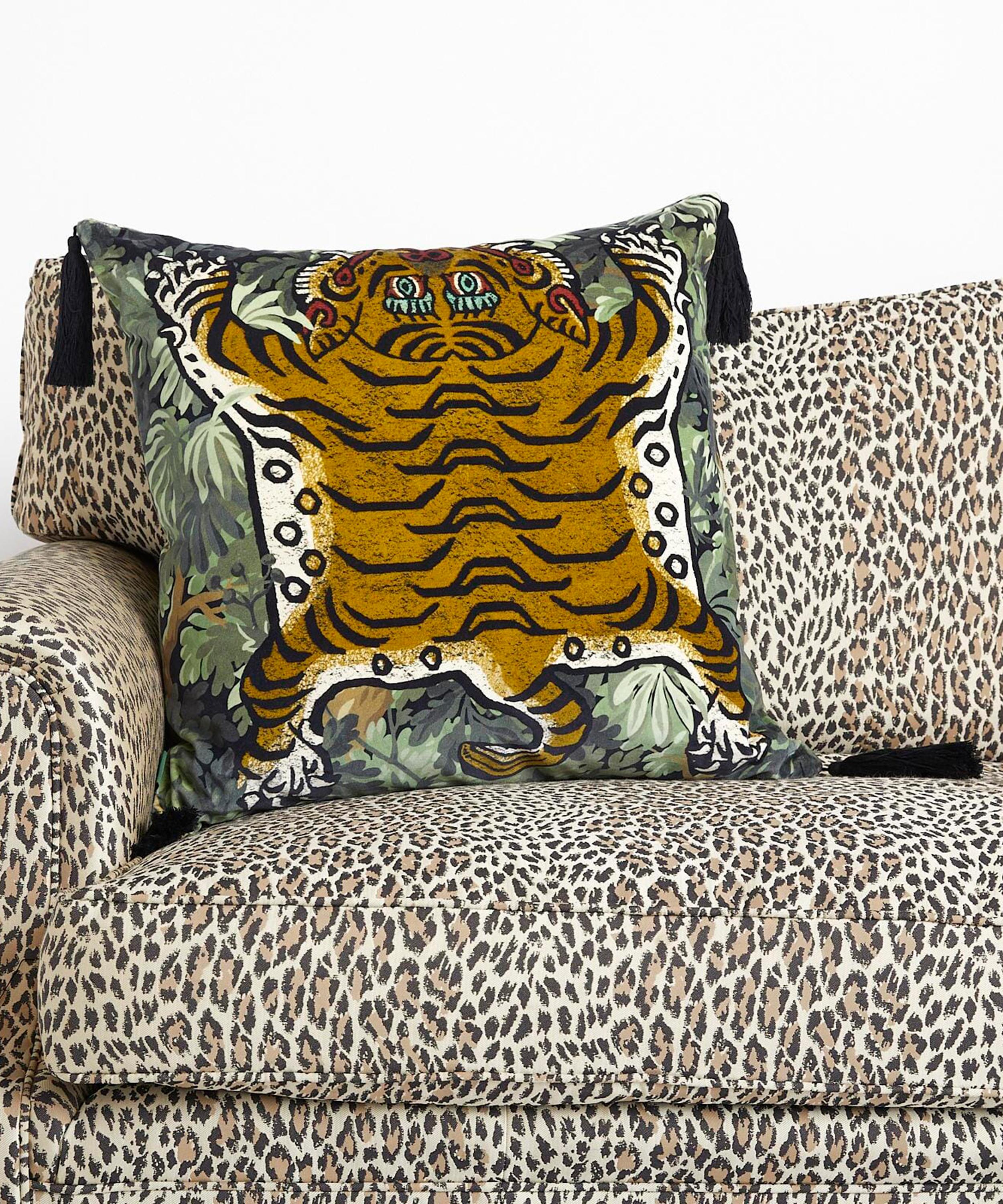 Cloaked in a meadow of moody botanicals, this plump throw pillow is embroidered with a Tibetan-inspired tiger motif for statement safari style. Made in Britain using time-honoured manufacturing techniques, the distinctive design will breathe life into love-worn sofas and chairs, beautifully enhancing any room to opulent new heights.