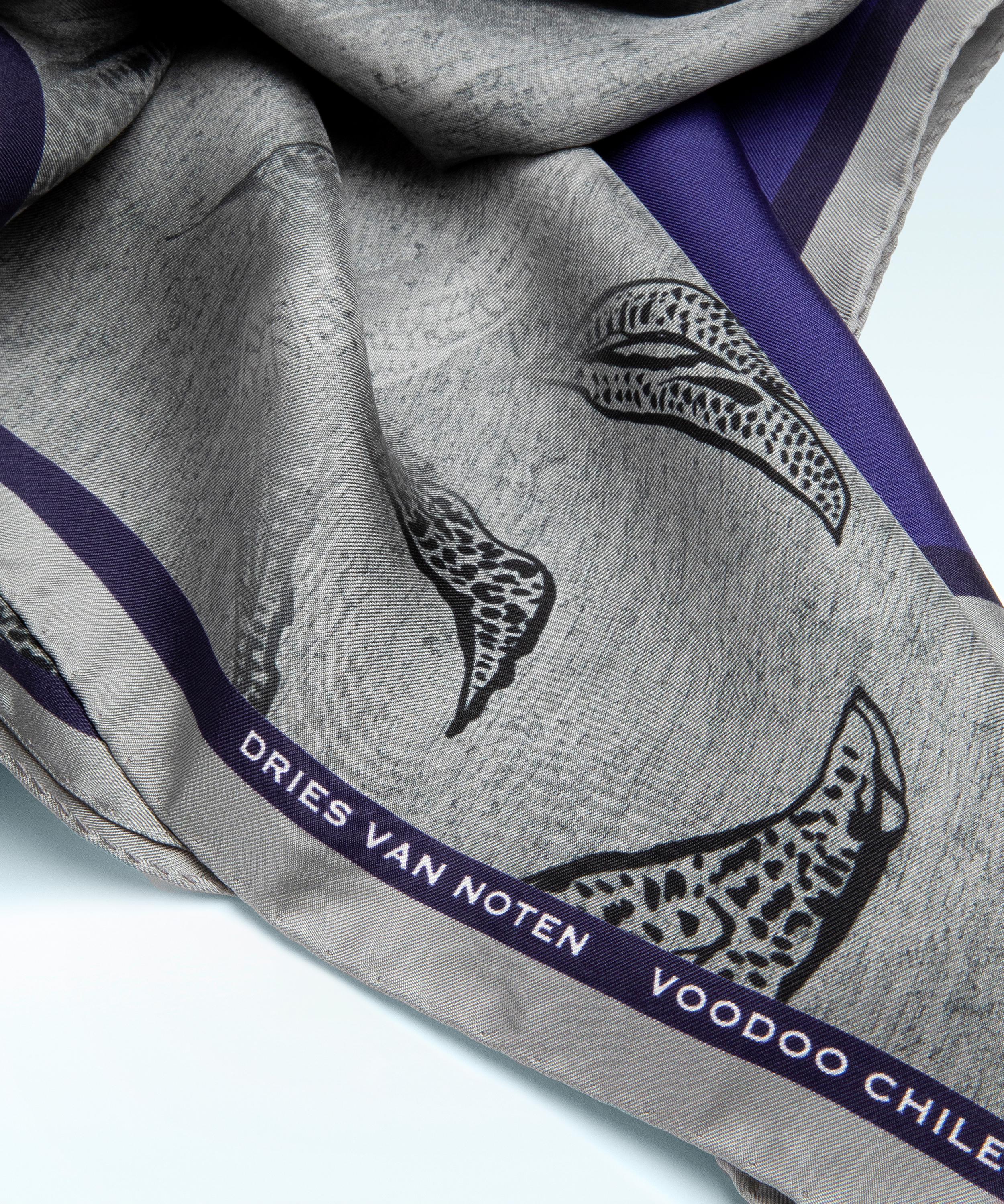 A captivating addition to your repertoire, Dries Van Noten’s Foulard Voodoo Chile Silk Scarf is inspired by the label's Eau de Parfum collection, reimagining its essence in a dreamy palette of royal blue and a monochrome leaf pattern.