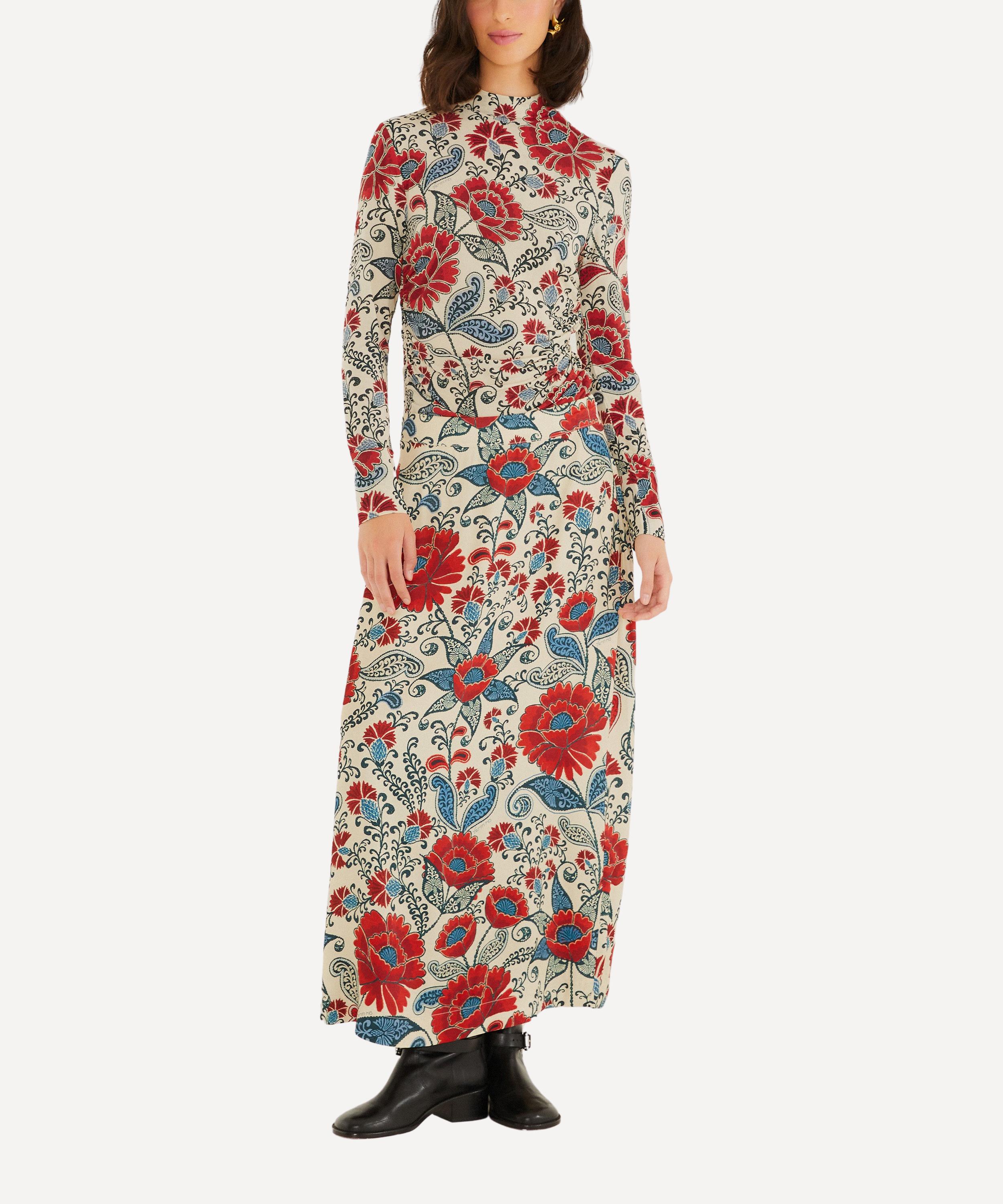 Embrace understated elegance with this soft jersey blouse, featuring a chic high neckline, subtle side ruching, and long sleeves. Adorned with a playful, vibrant floral print in bold reds and soothing blues, its smooth silhouette offers timeless comfort and a flattering fit - perfect as a versatile base for vibrant accessories and effortless styling.