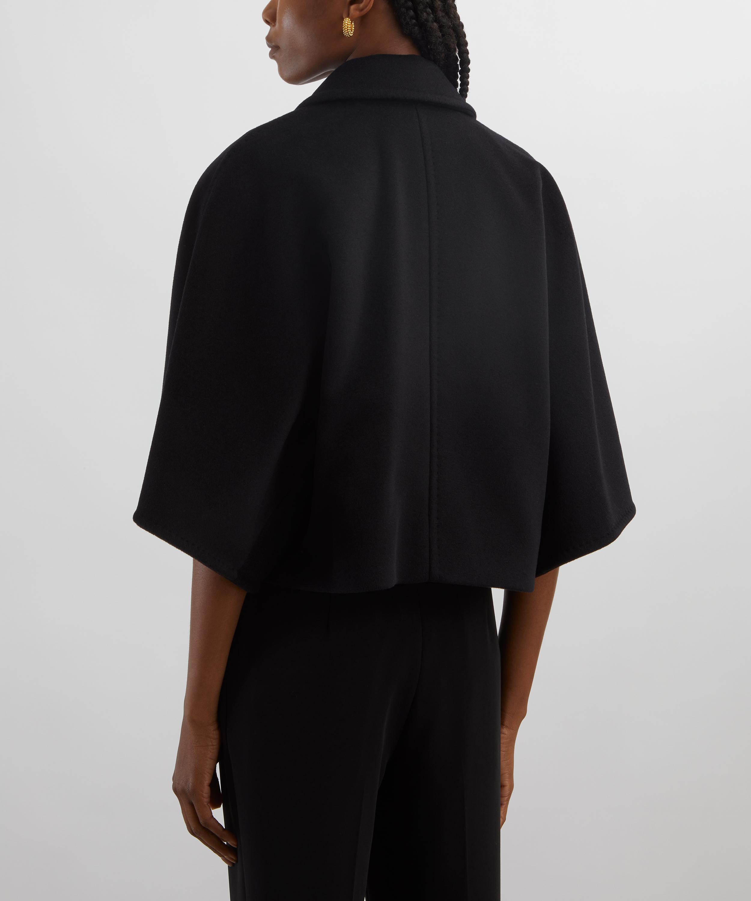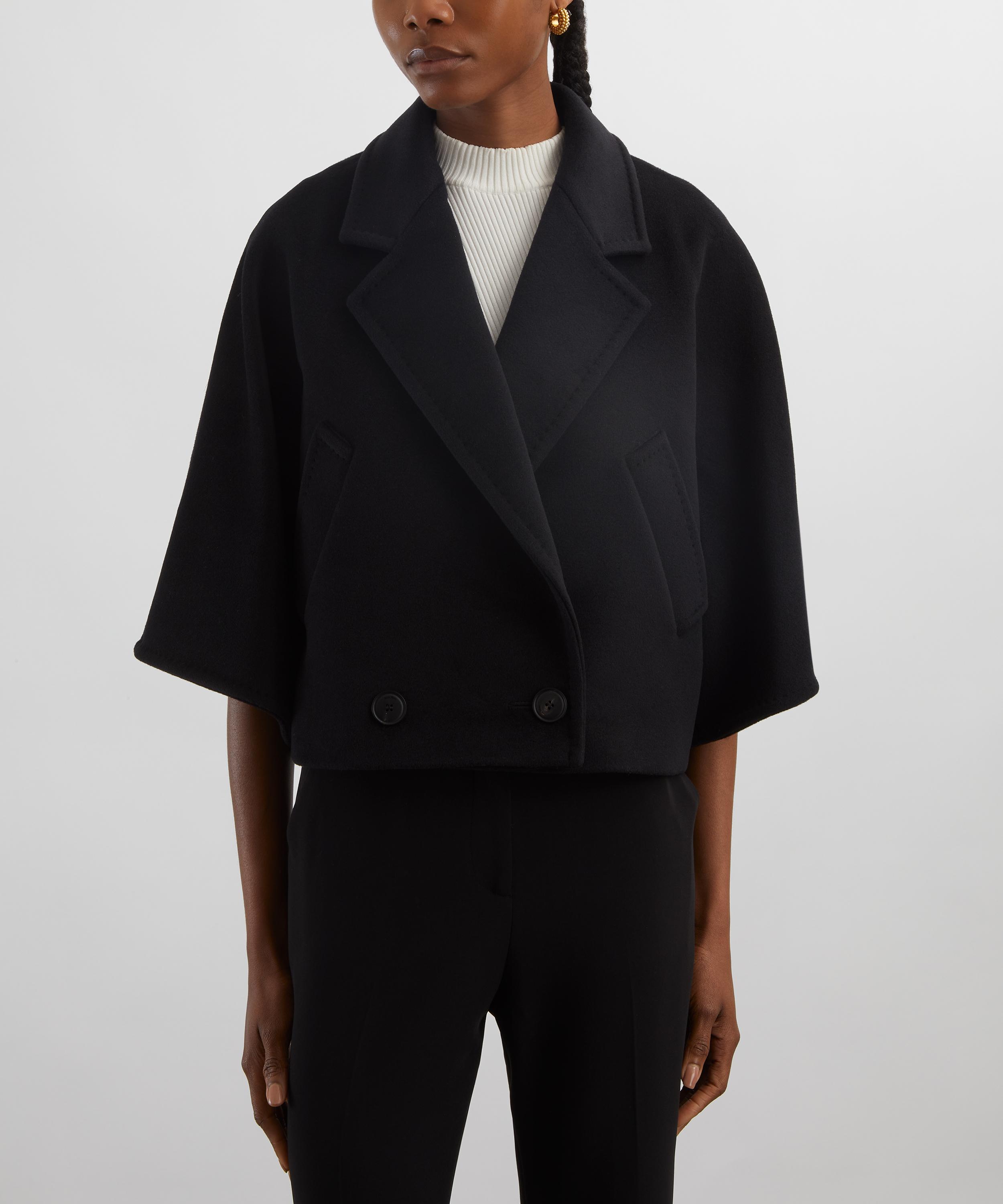 Crafted from a luxurious wool-cashmere blend, this cropped jacket puts a modern twist on classic tailoring. Cut for an oversized fit, it features a lapel collar, short kimono sleeves, and a double-breasted front with a clean two-button closure - balancing structure with effortless elegance.