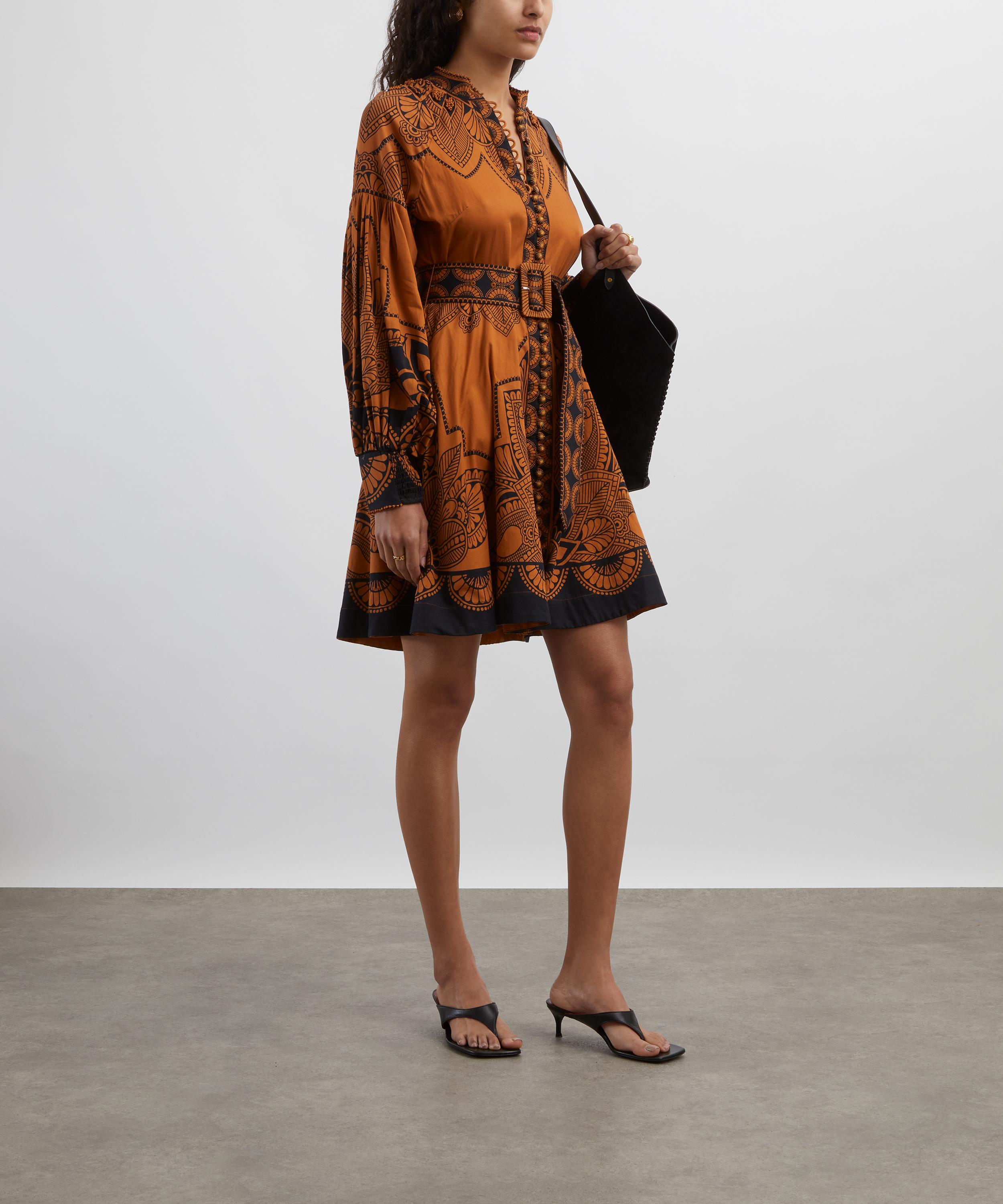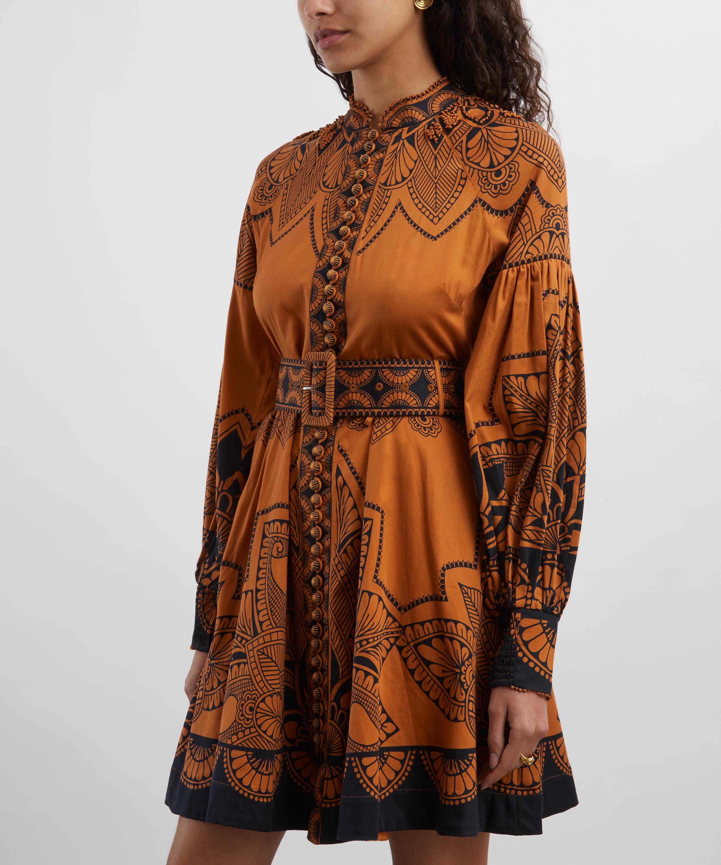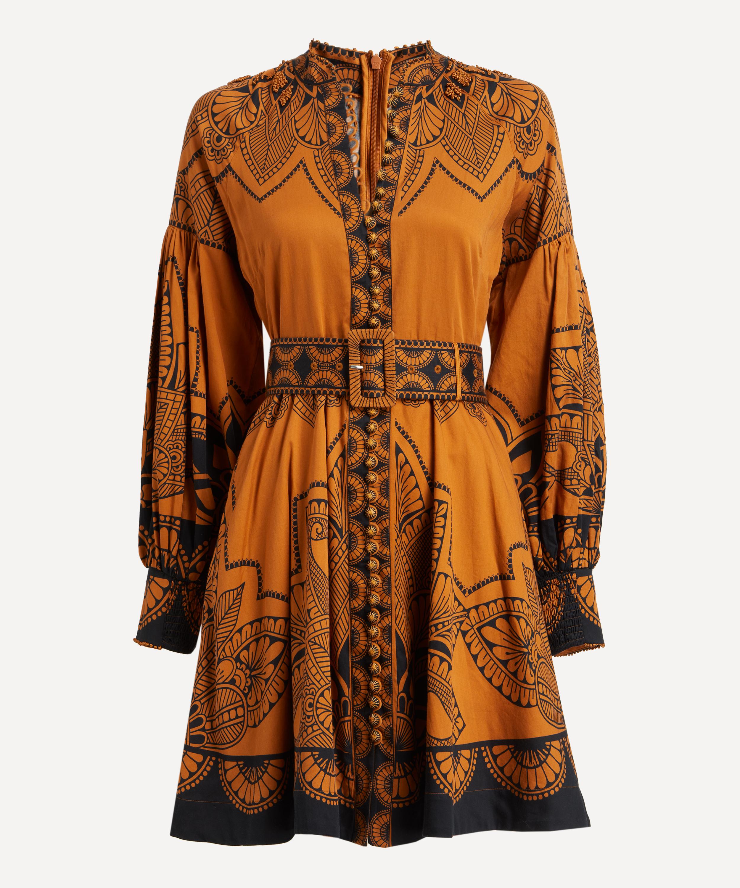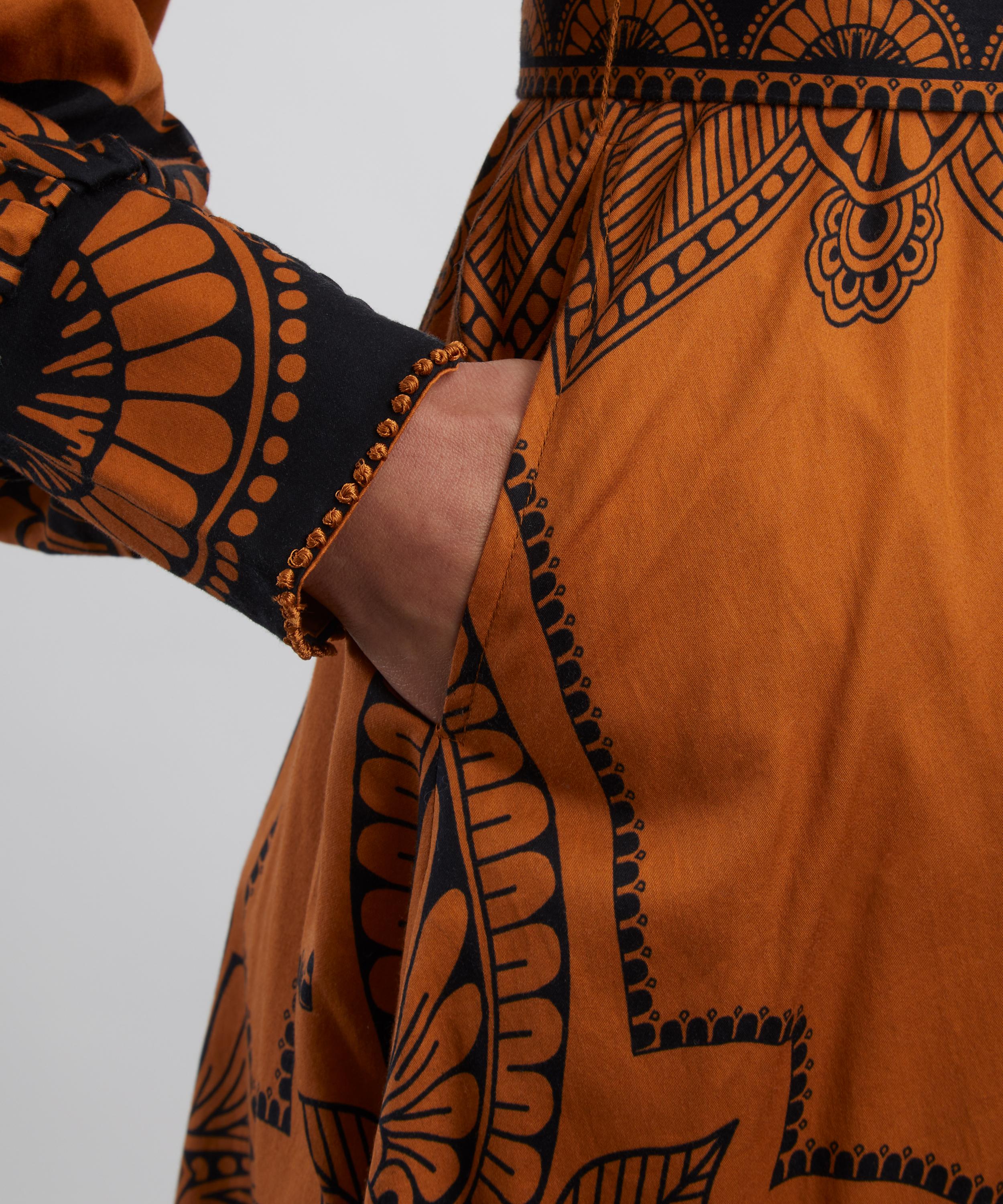 Crafted from luxurious cotton satin, the Sophia Dress embodies timeless elegance with its feminine silhouette and bold Mandala print. Featuring a band collar, smocked long sleeves, and hand-embroidered French knots, it's finished with a detachable buckle belt for a beautifully cinched waist.