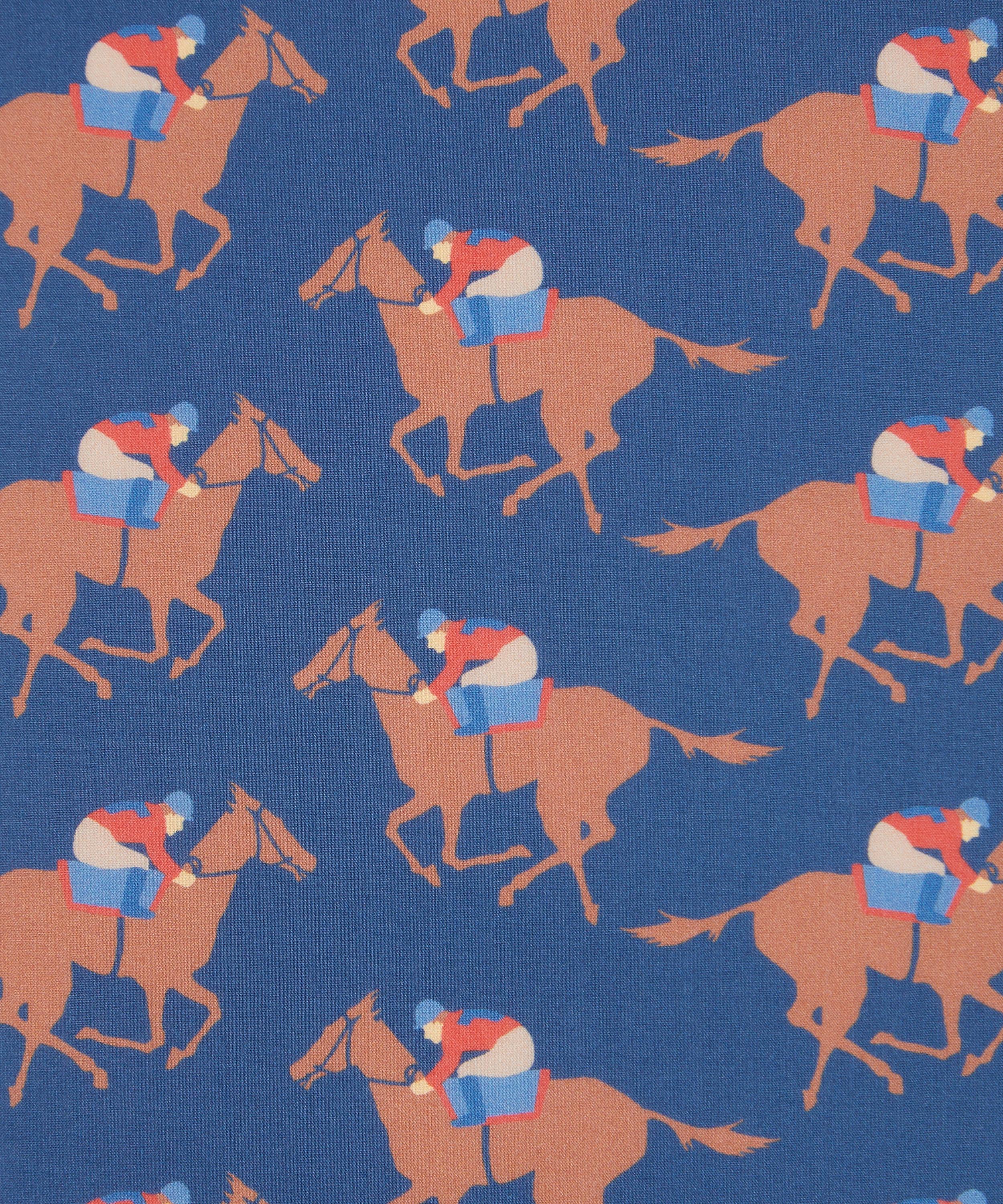 Initially created as part of a printed scarf in 1972, galloping racehorses with focused jockeys dash across this archival design. Blocks of bold colour form the shapes within this design, creating a contemporary look.