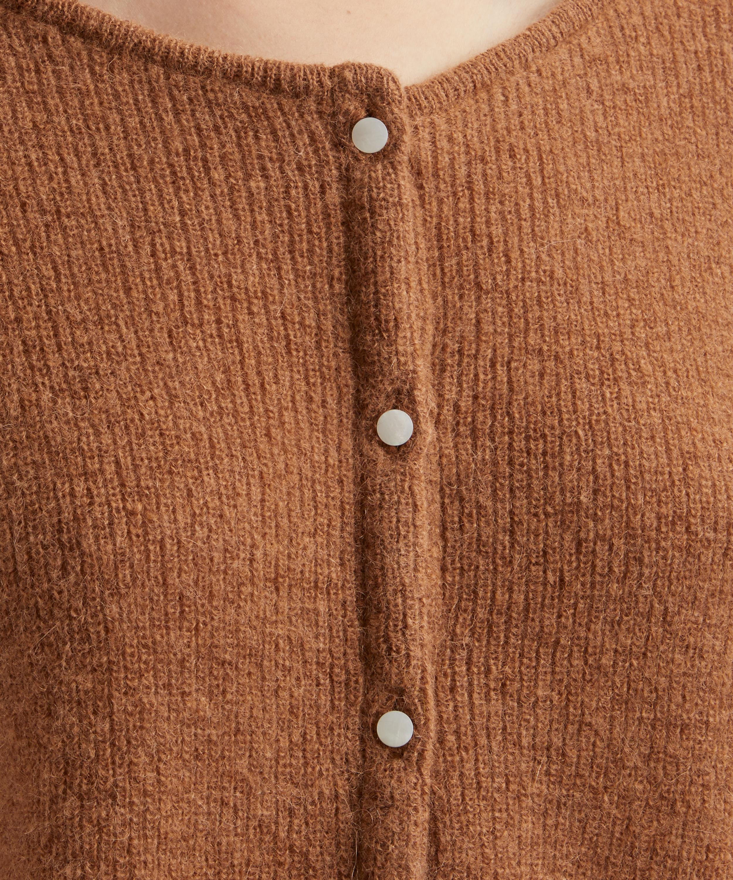 Effortlessly chic in camel, this rib-knit cardigan is crafted from an ultra-soft super kid mohair and baby alpaca blend. Designed for a relaxed fit with dropped shoulders, long sleeves, and a round neckline, its front button closure is secured with mother-of-pearl effect buttons.