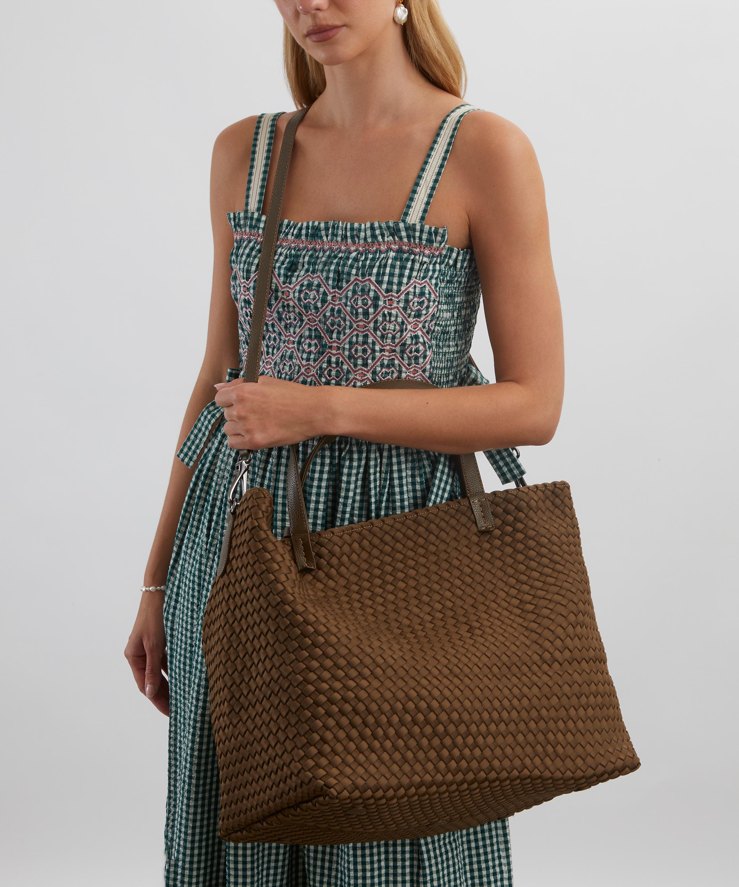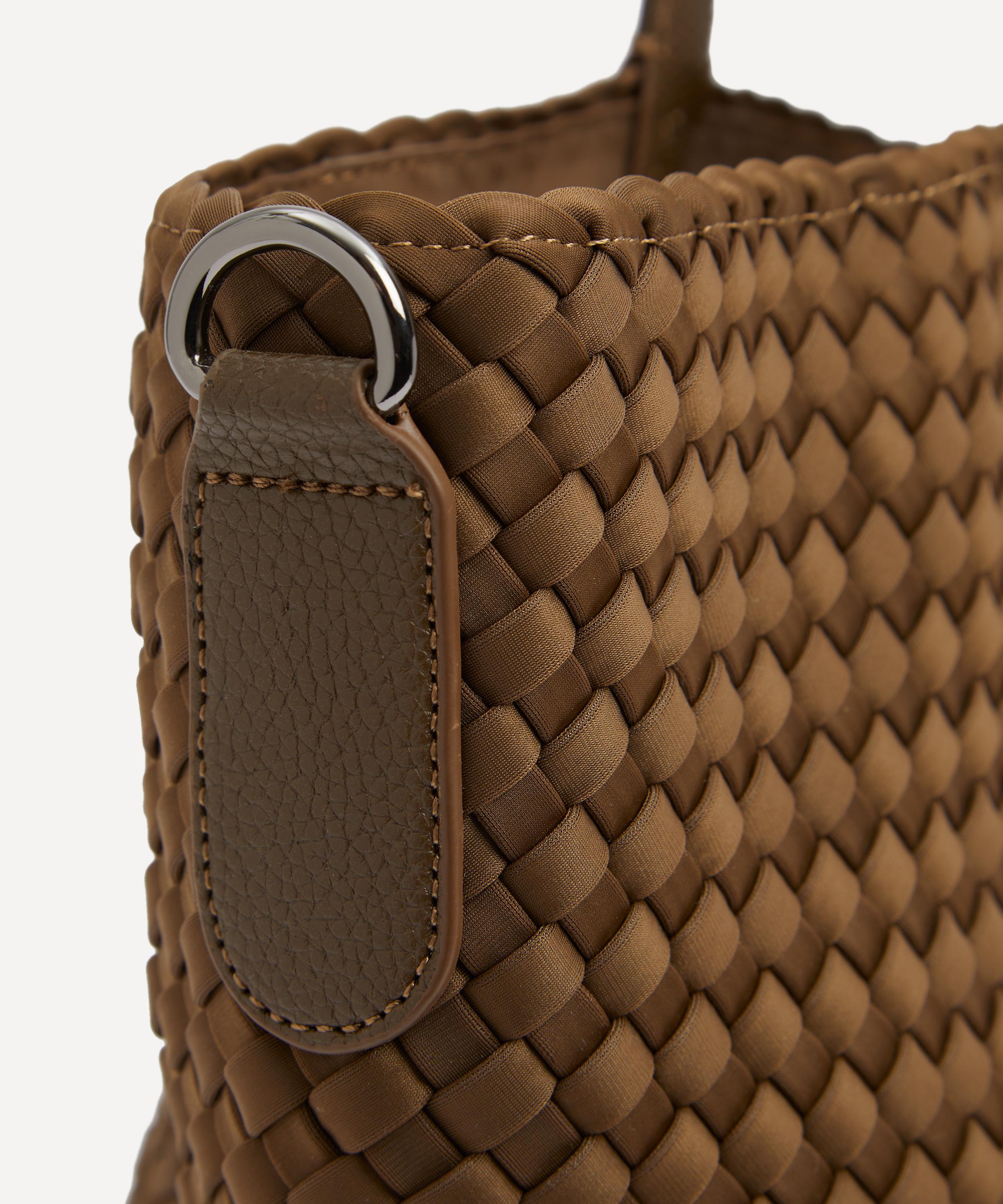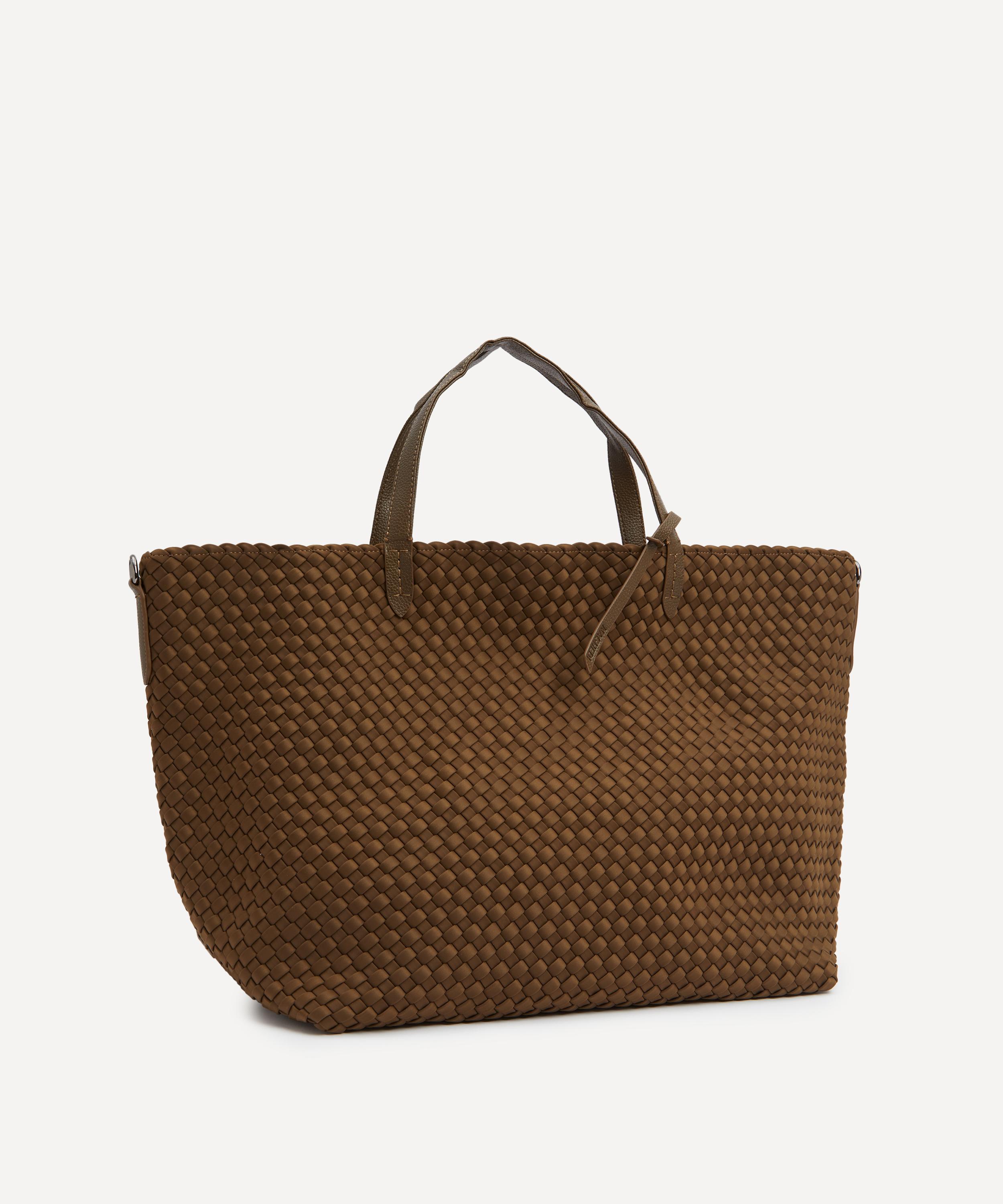 Elevate your off-duty line-up with the Geneva Weekender bag, a spacious design hand-woven from durable neoprene fabric by New York-based accessories brand Naghedi.