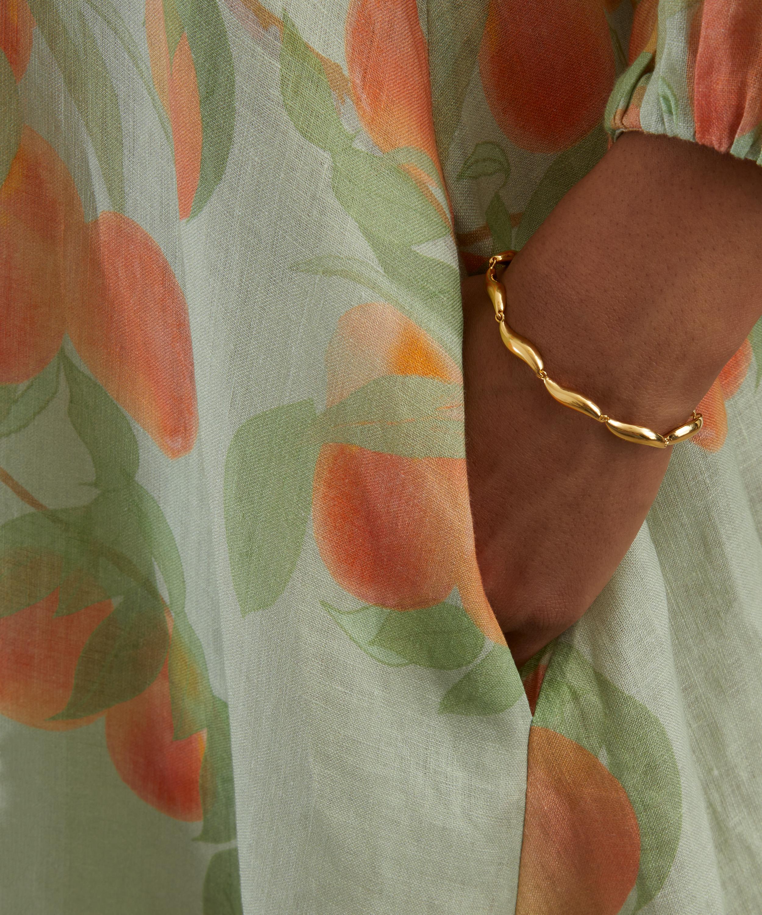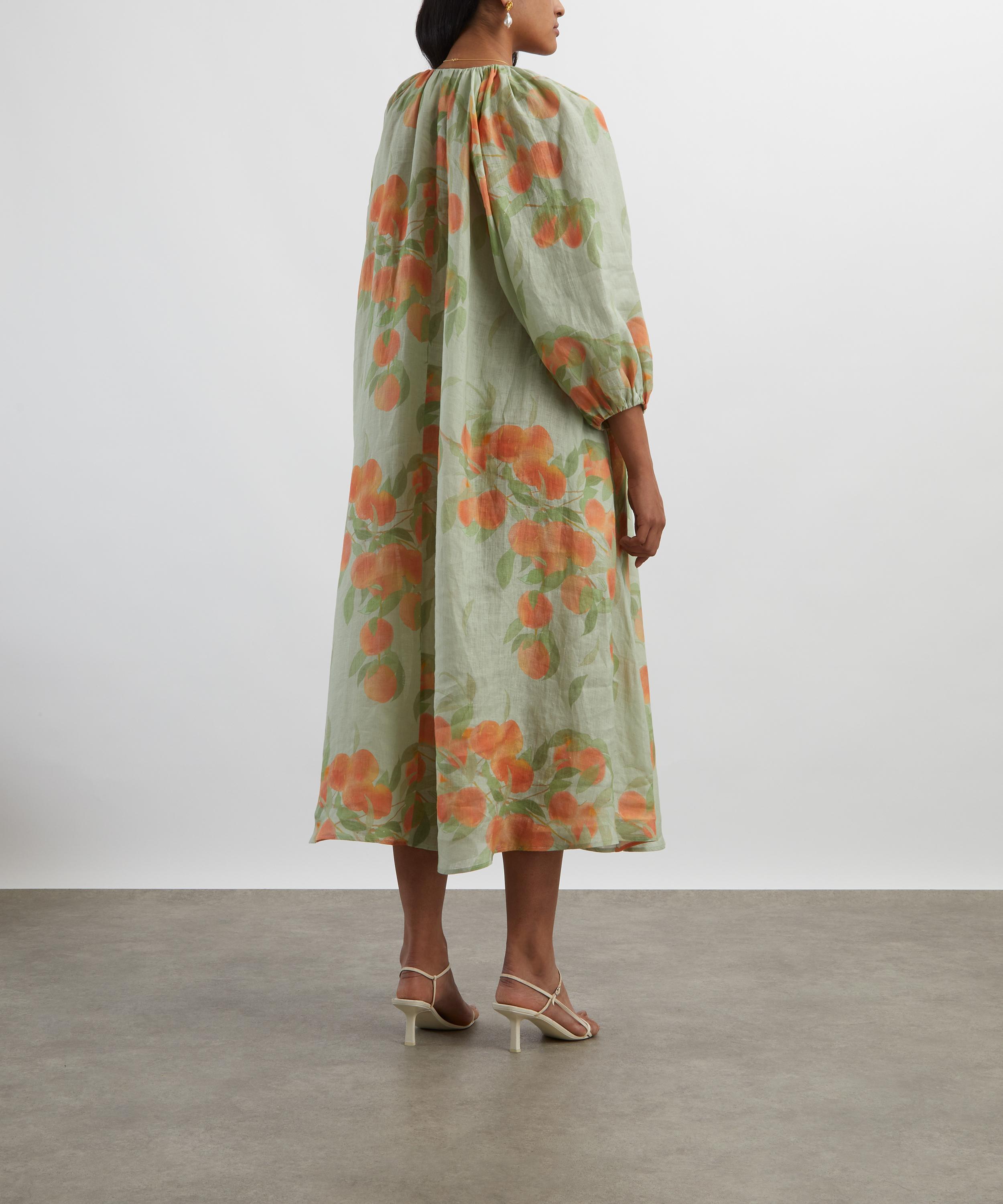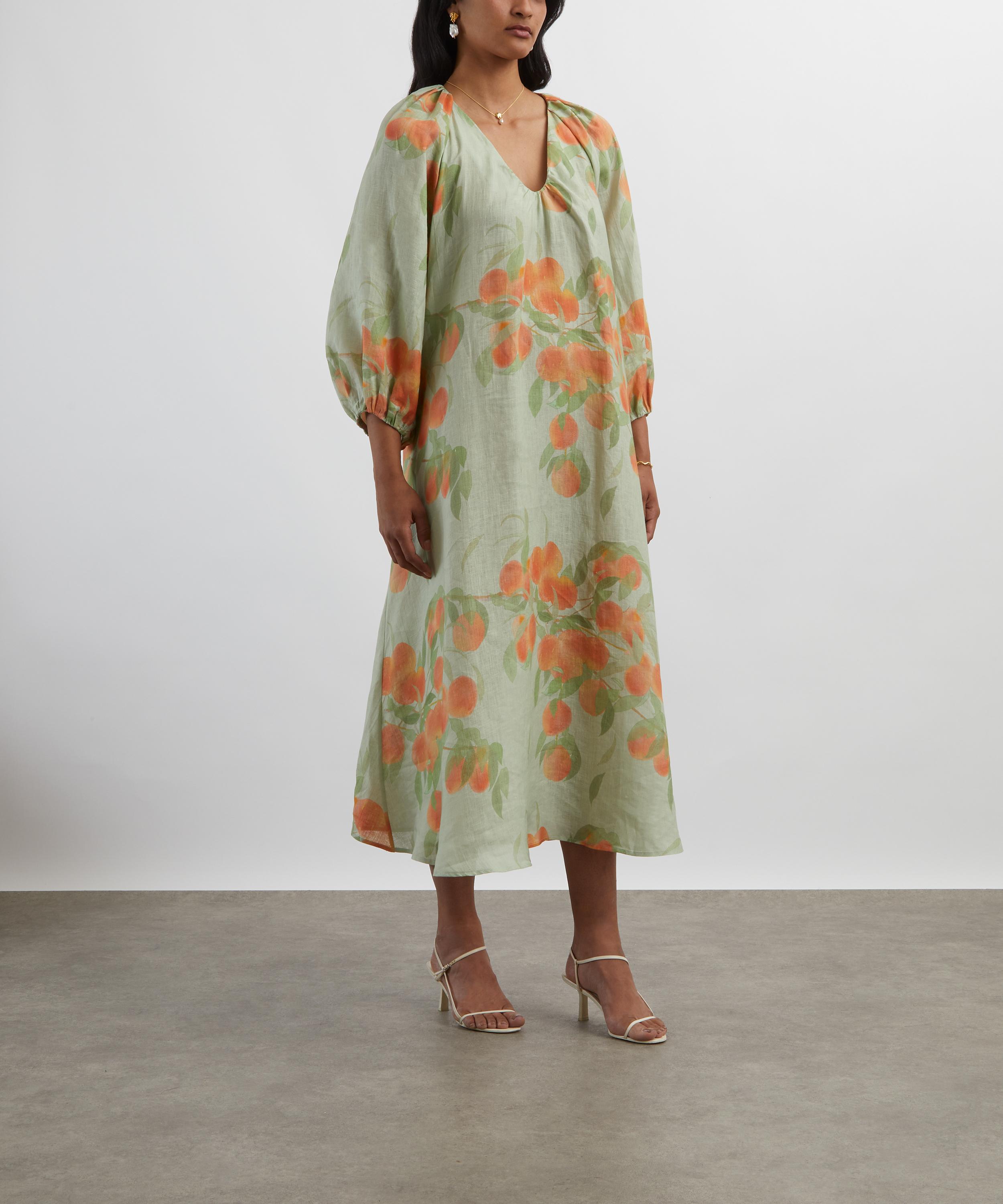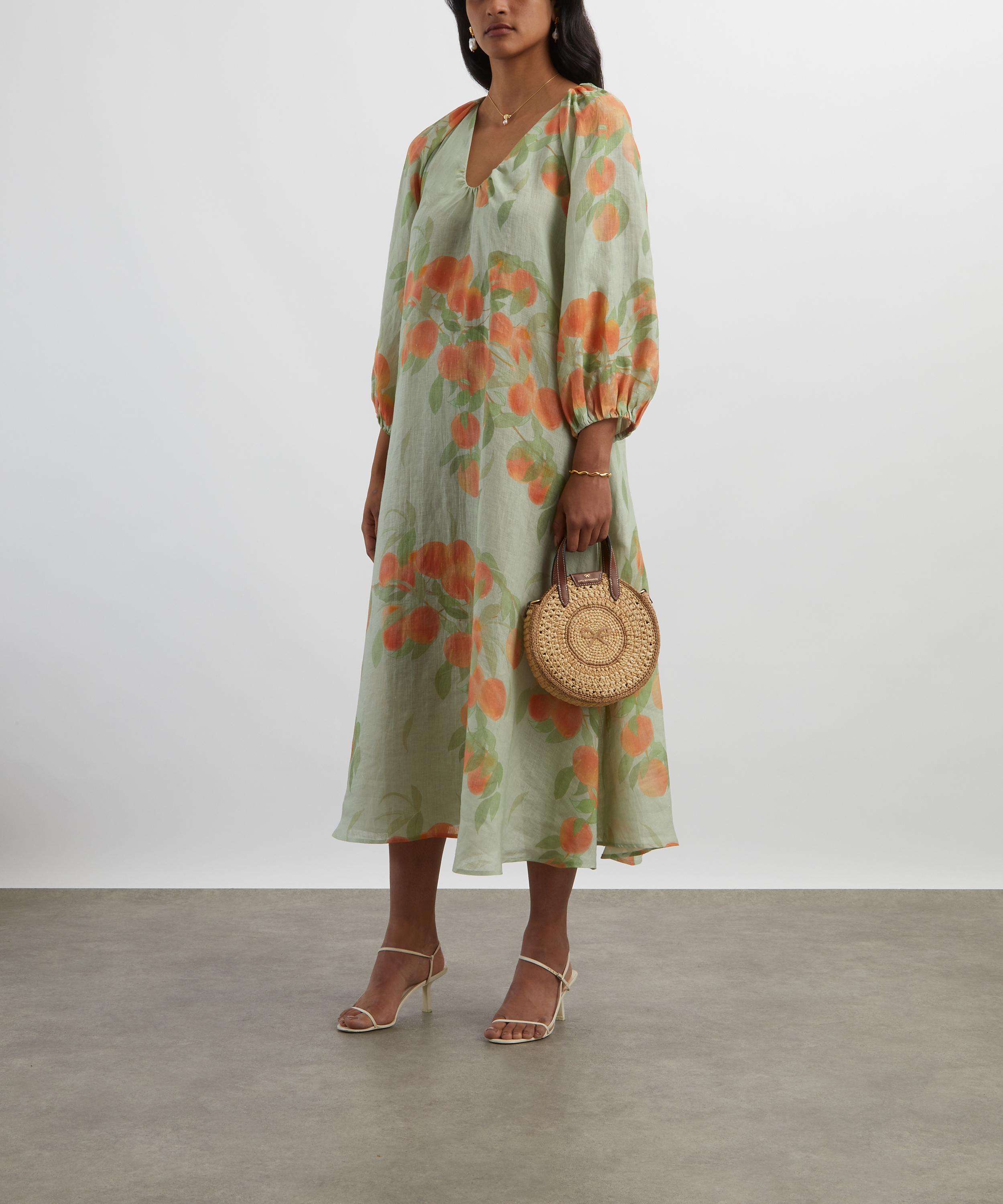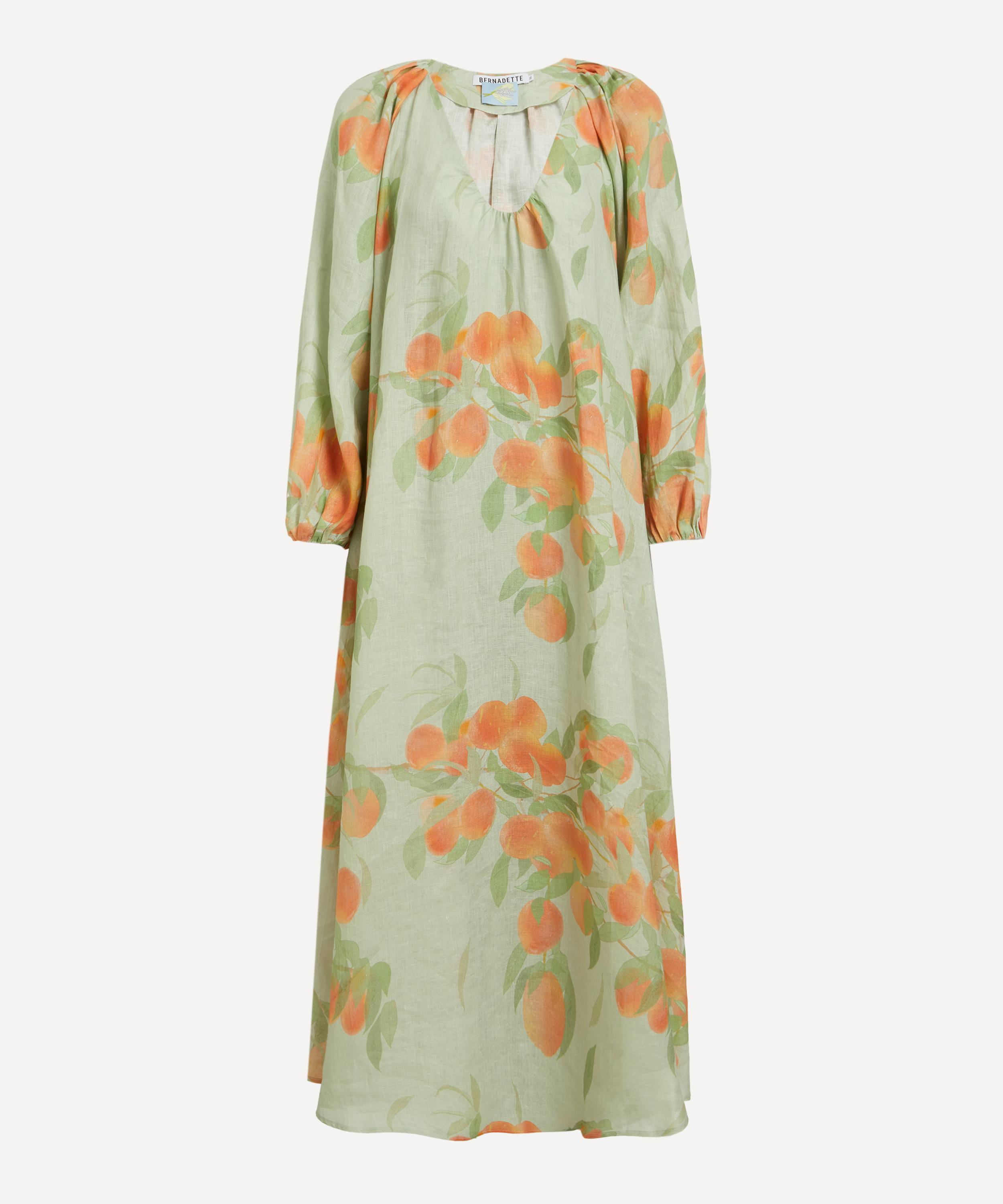 Bold and breezy in lightweight linen, the Georgette Maxi-Dress from Bernadette hints at the Antwerp-based brand’s classical and botanical influences with its uplifting peach tree motif.