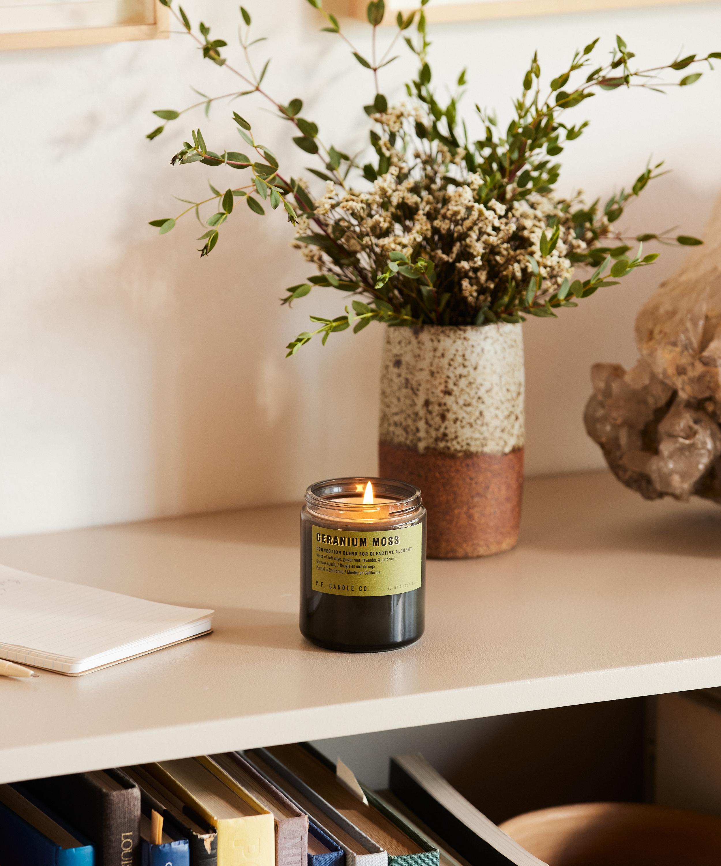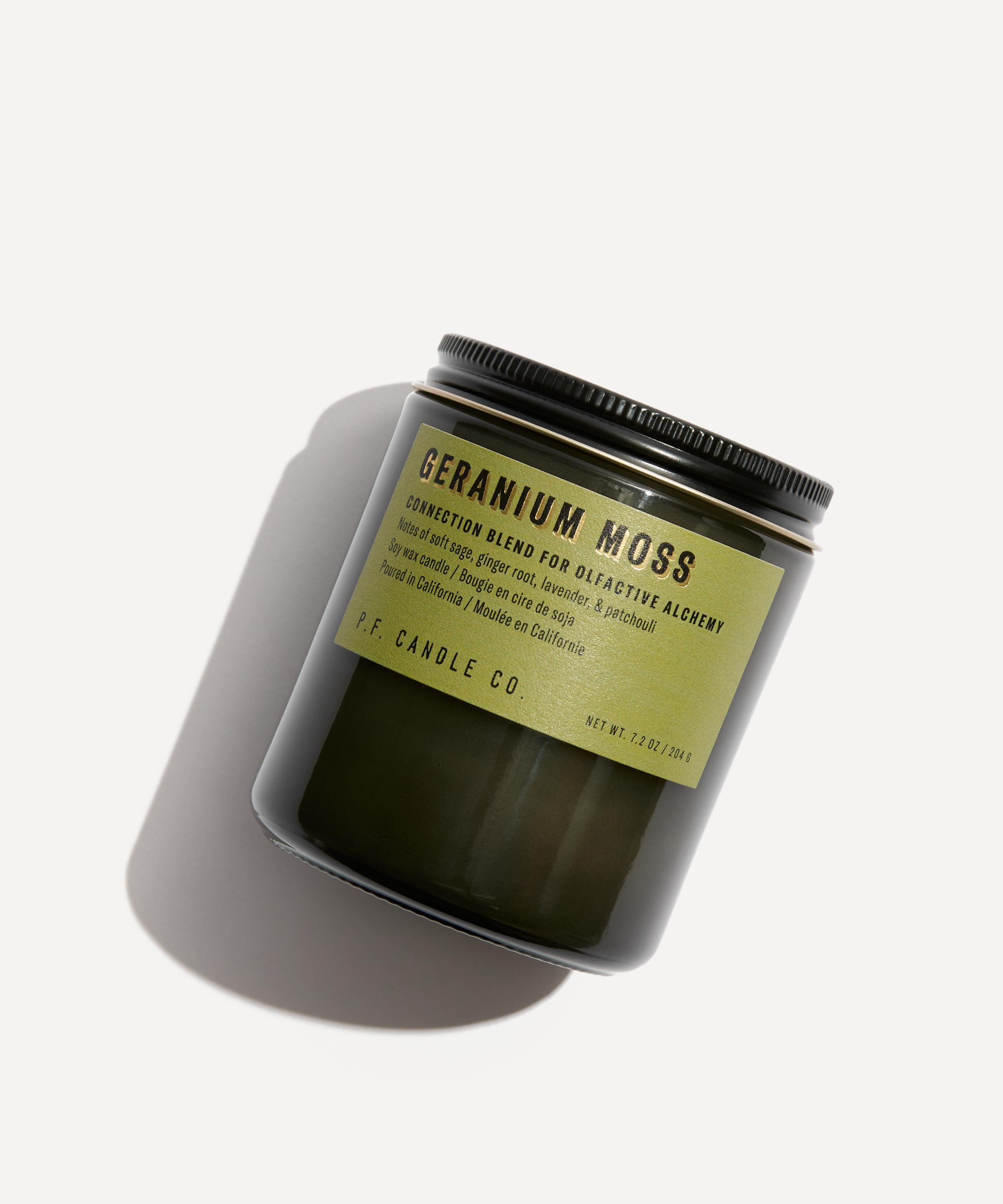 Designed to mimic the restorative effects of time spent in nature, the Geranium Moss scented candle from P.F. Candle Co. boasts a fresh, aromatic fragrance.