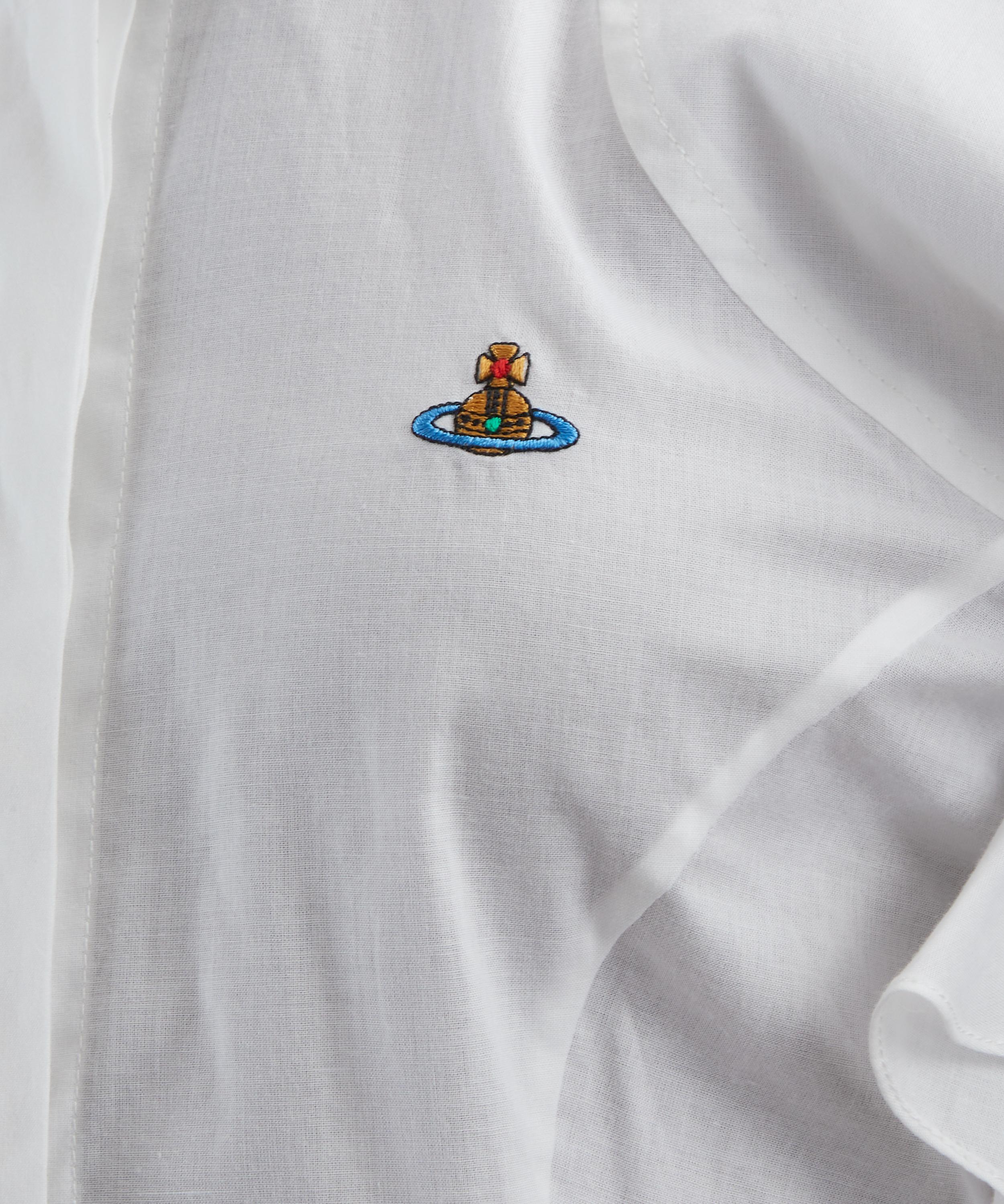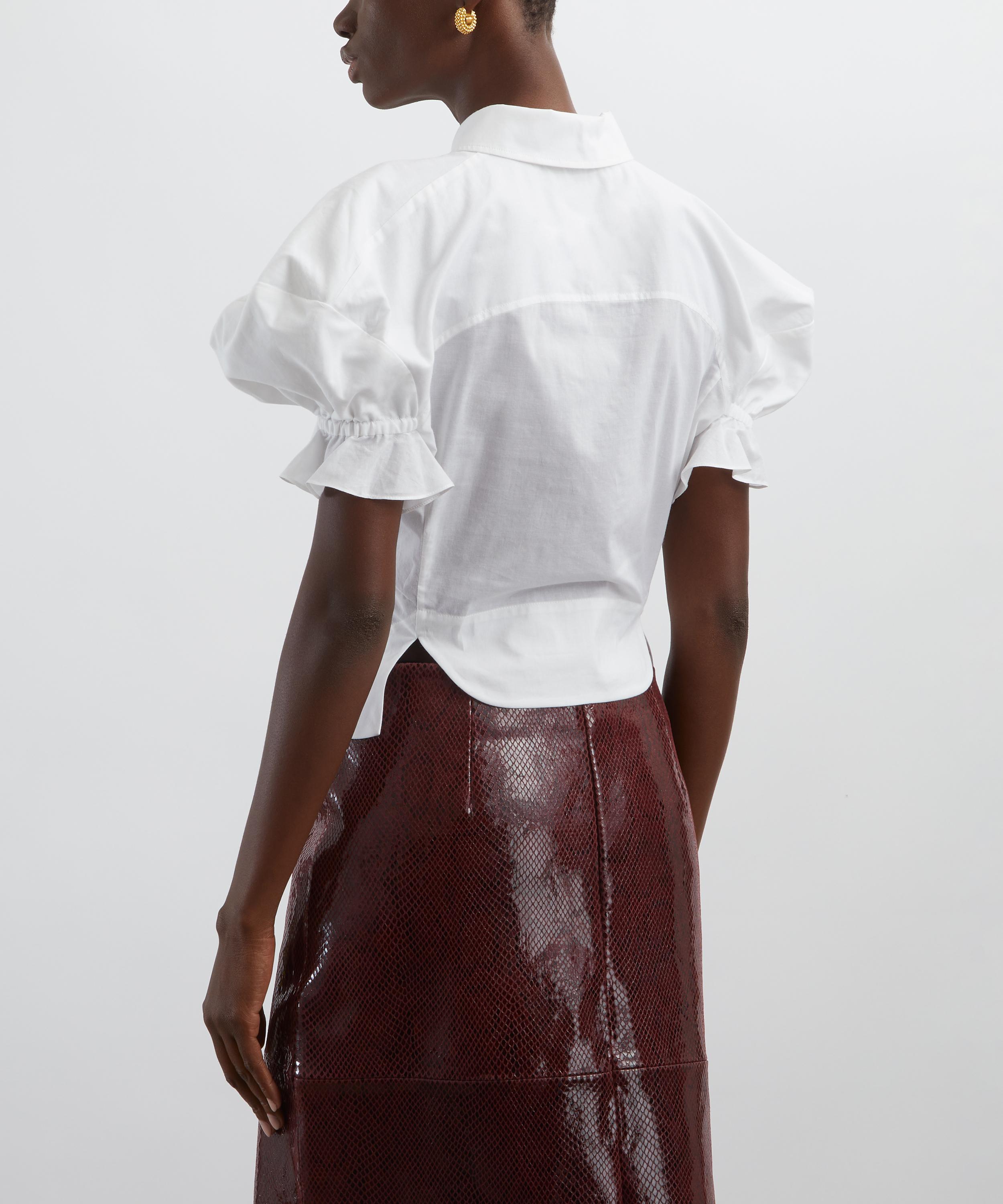 Crafted from crisp cotton poplin, this tailored shirt is elevated by voluminous puff sleeves that lend a playful, feminine edge. Finished with a sharp point collar, concealed button placket, and an embroidered orb at the chest, it balances structure with signature charm.