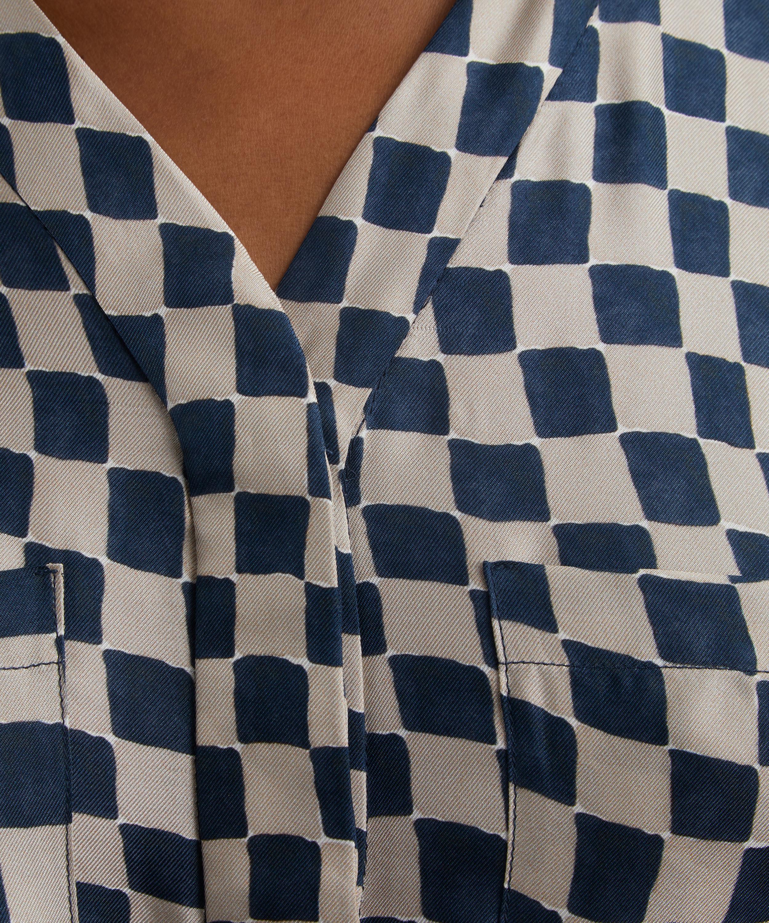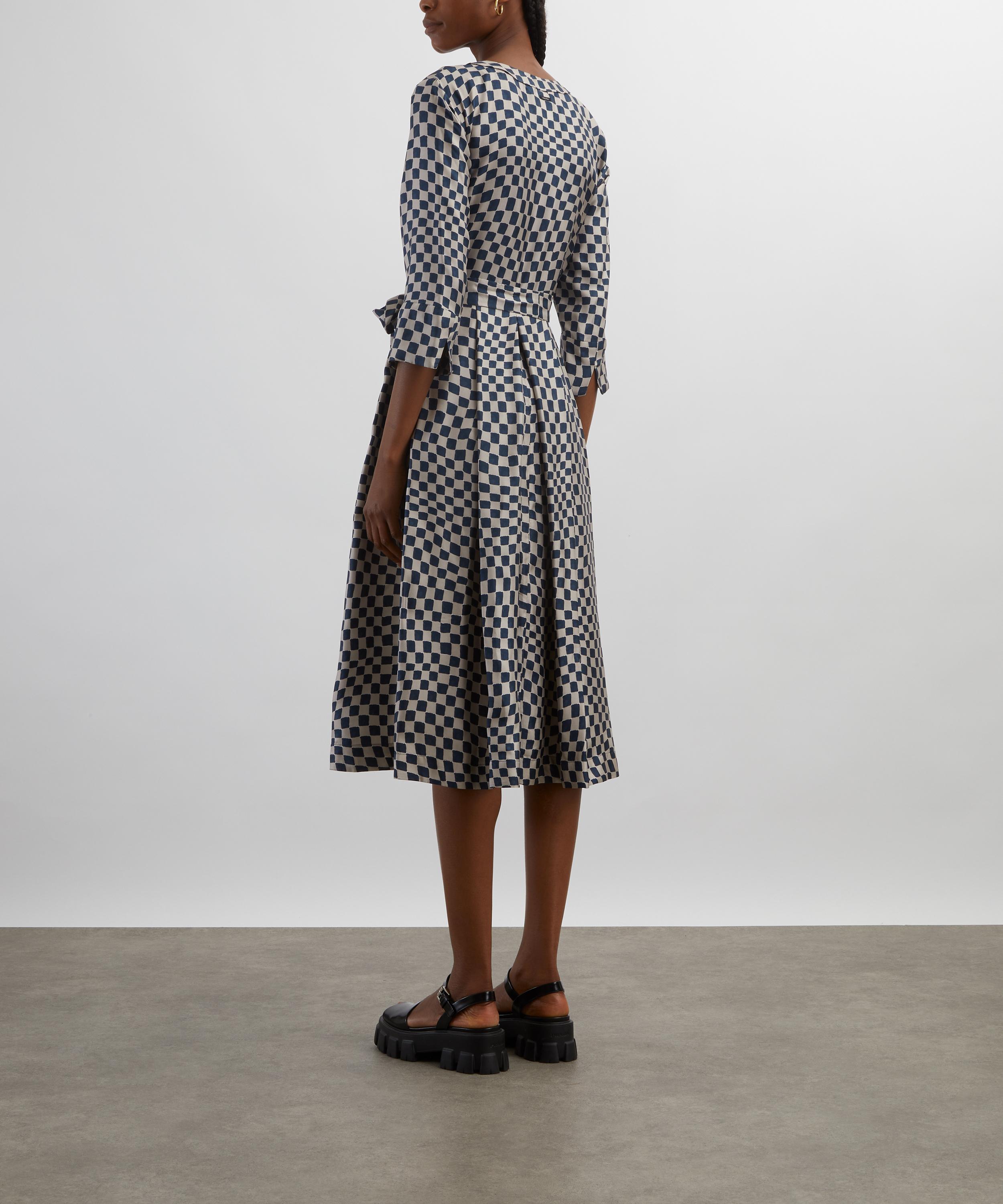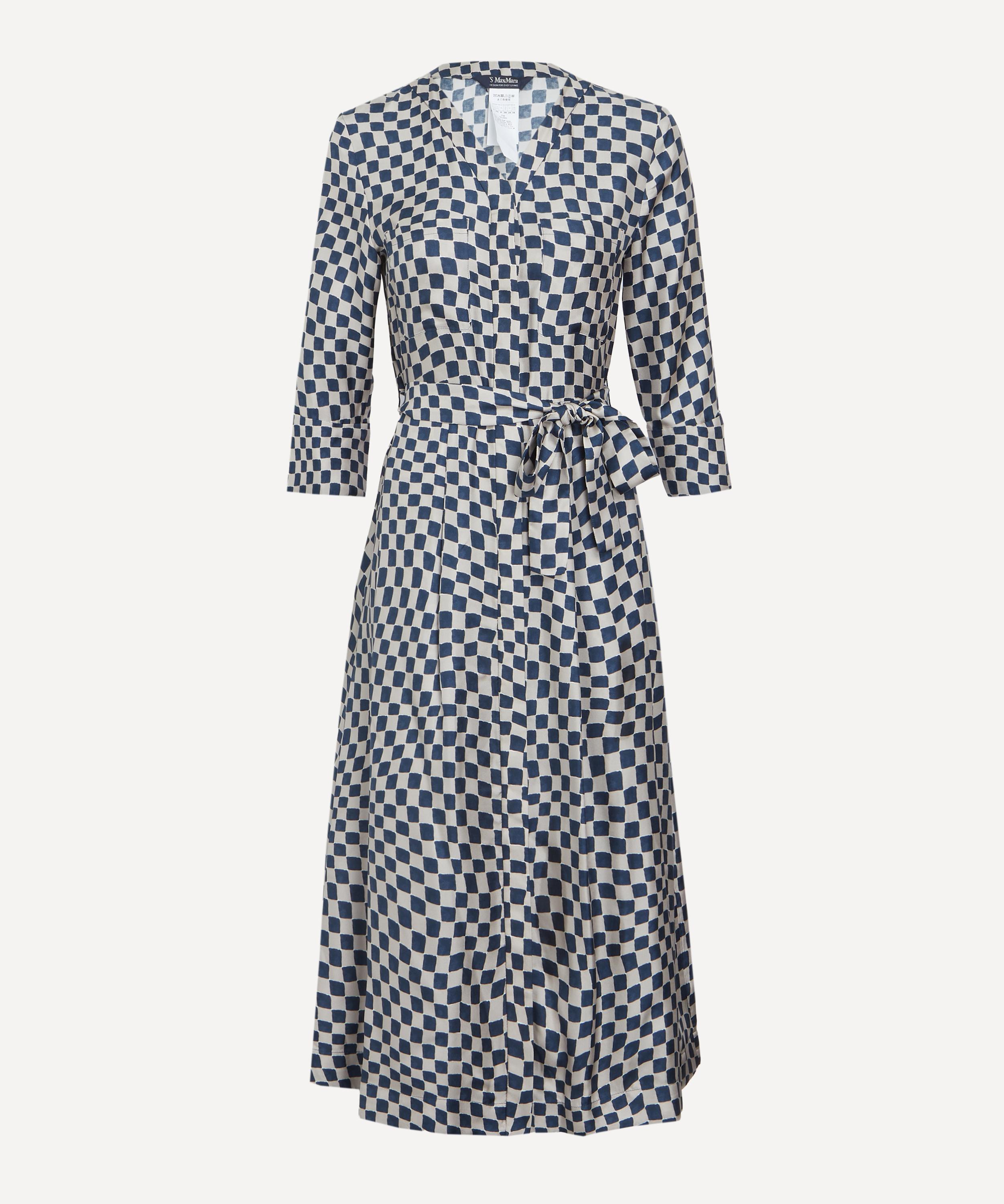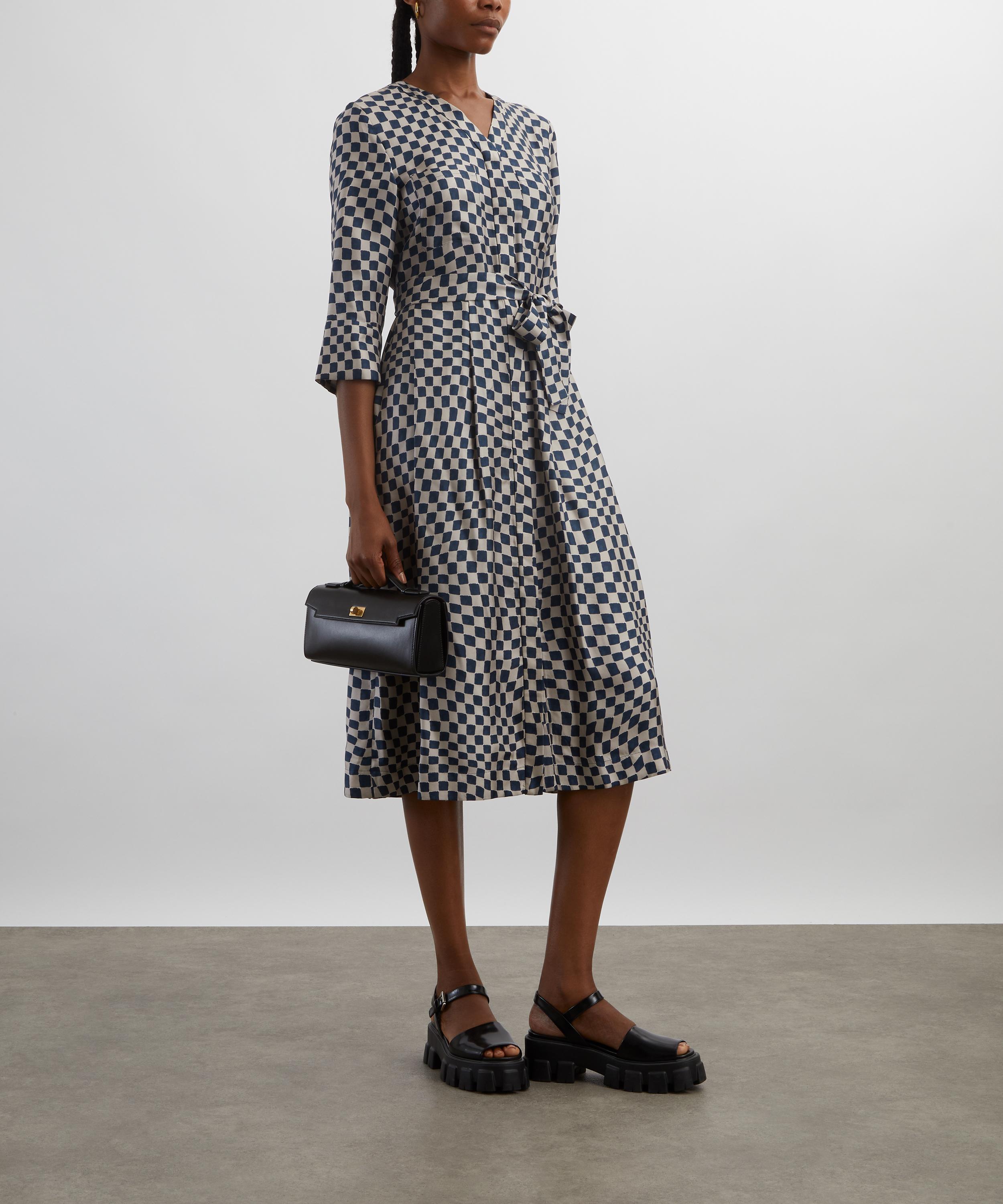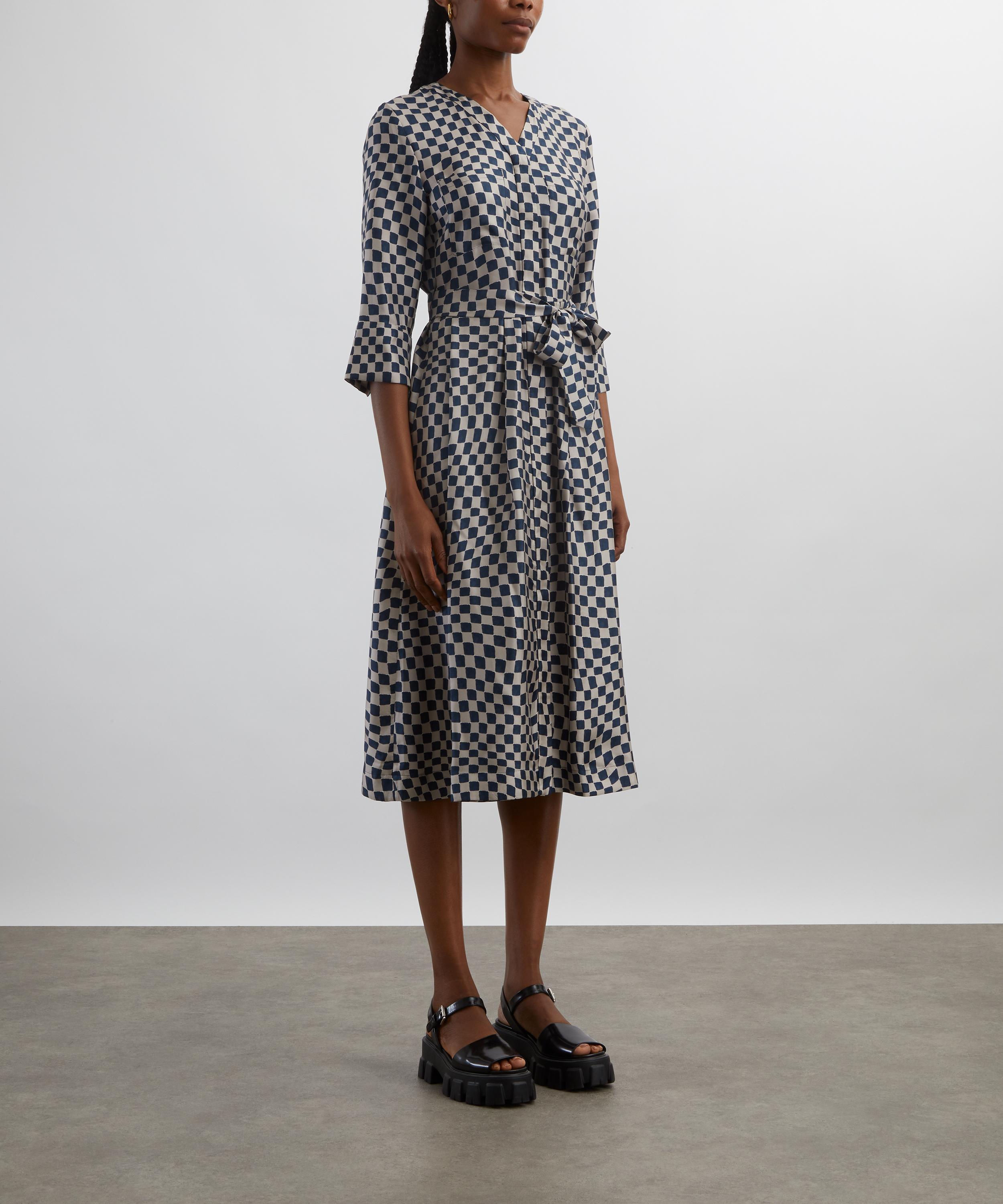 Crafted from pure silk adorned with a navy checkered pattern, the Giada shirt dress embodies understated elegance. Nipped at the waist with a matching belt and fitted with multiple pockets, its flattering A-line silhouette, V-neckline and cropped set-in sleeves create a look that’s effortlessly refined and timelessly chic.