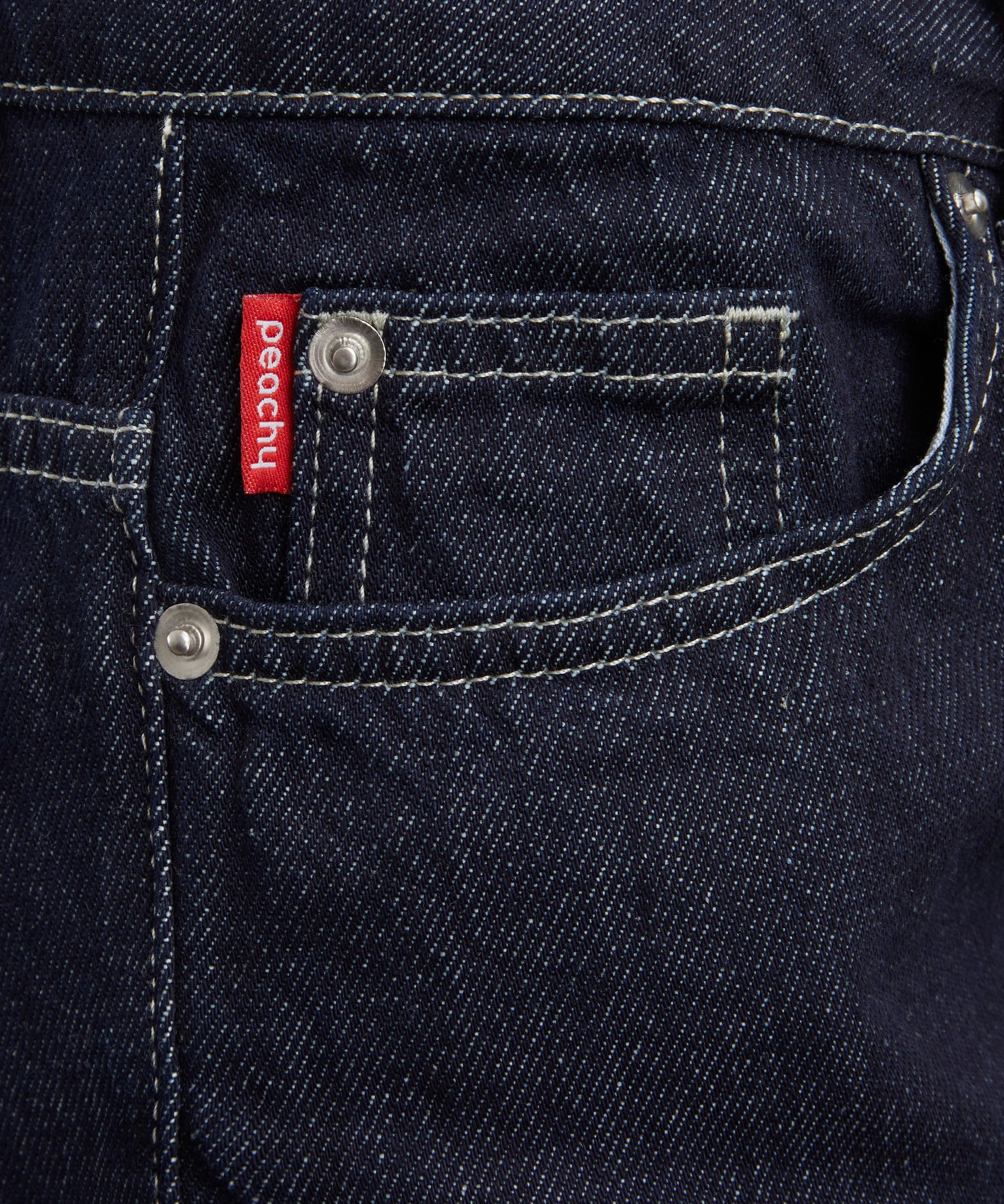 Designed for a flattering, sculpted fit, these slim-leg jeans are finished with a red embossed Peachy jacron at the back for a signature touch. Rinsed in a deep indigo hue, they feature classic five-pocket styling for timeless appeal.
