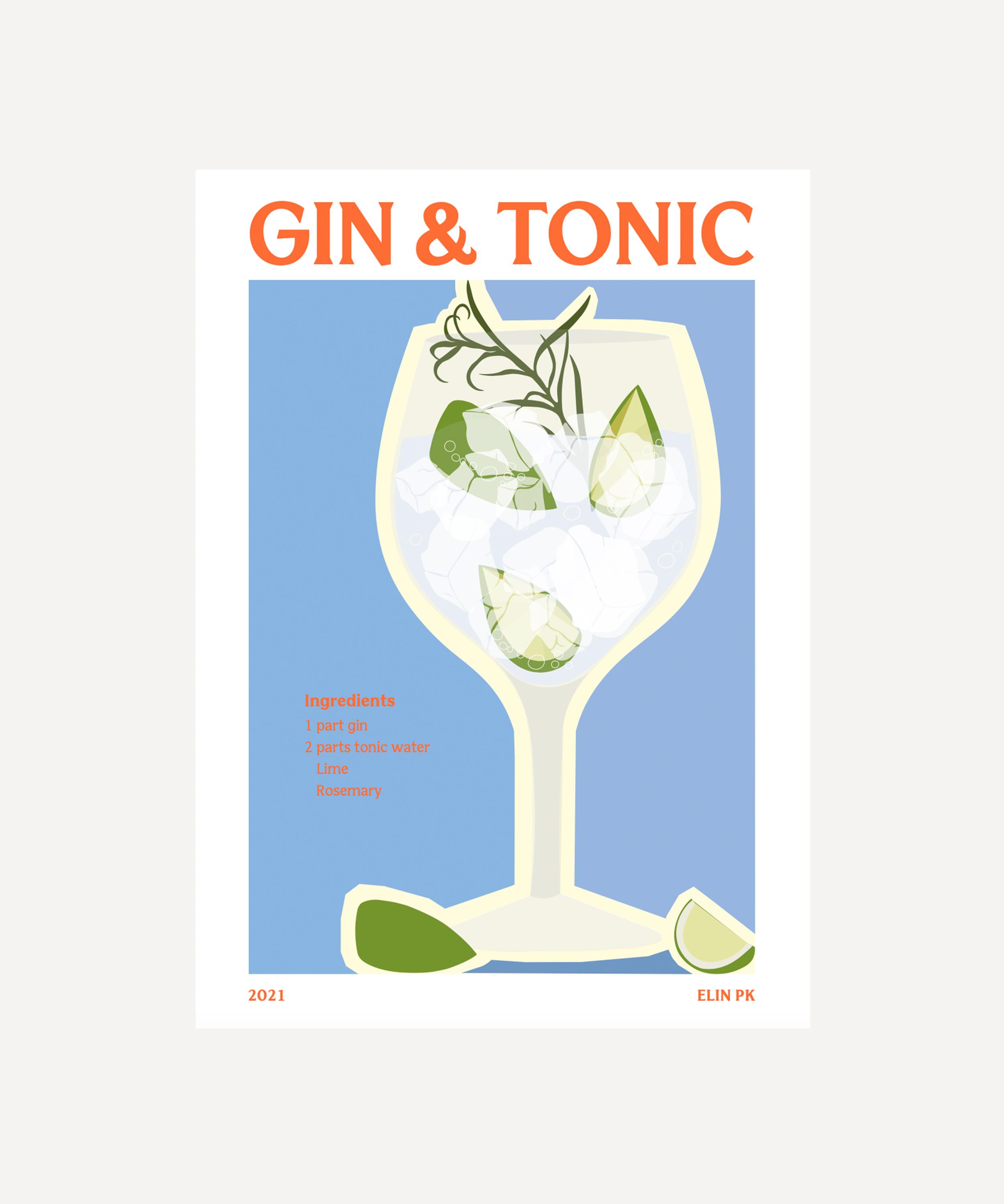 In Elin PK’s trademark playful style, this unframed poster features a graphic illustration of a traditional gin and tonic, alongside a handy recipe. Made in Sweden and printed on high-quality 180gr FSC certified matt paper, the charming design will breathe life into any setting.