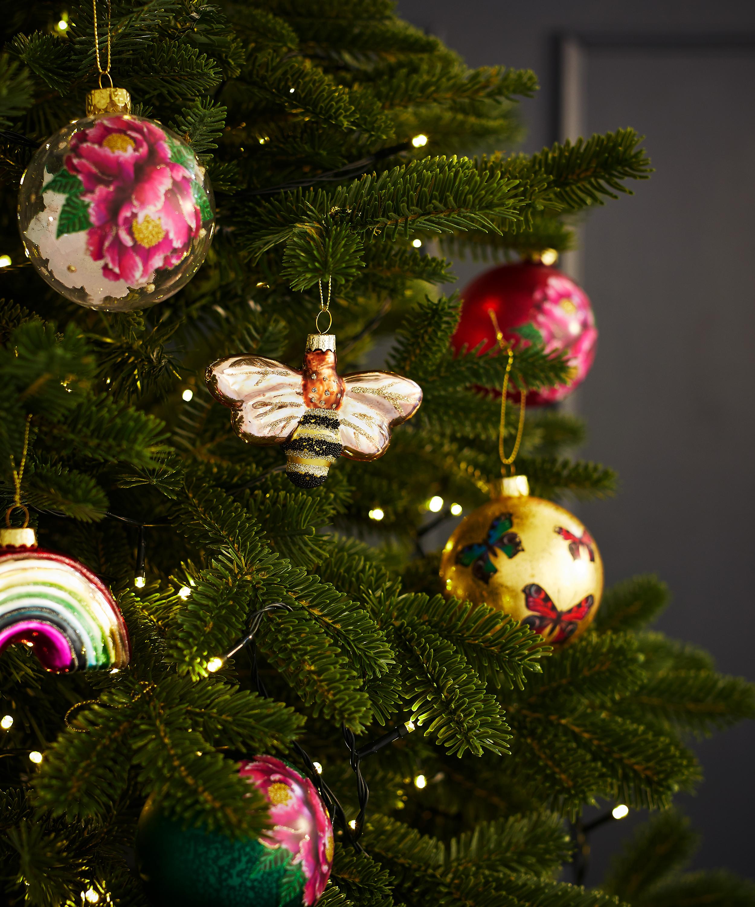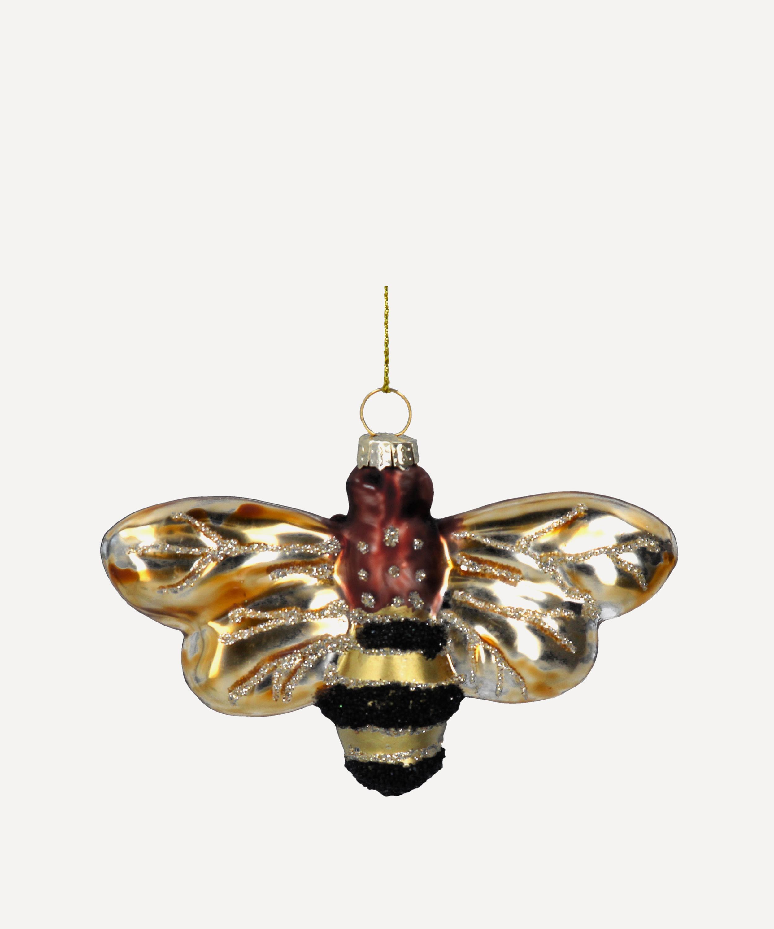This charming glass ornament takes the form of a stripy bumblebee, complete with golden wings and festive fine glitter detailing – perfect for an eclectic mix and match approach to Christmas décor.