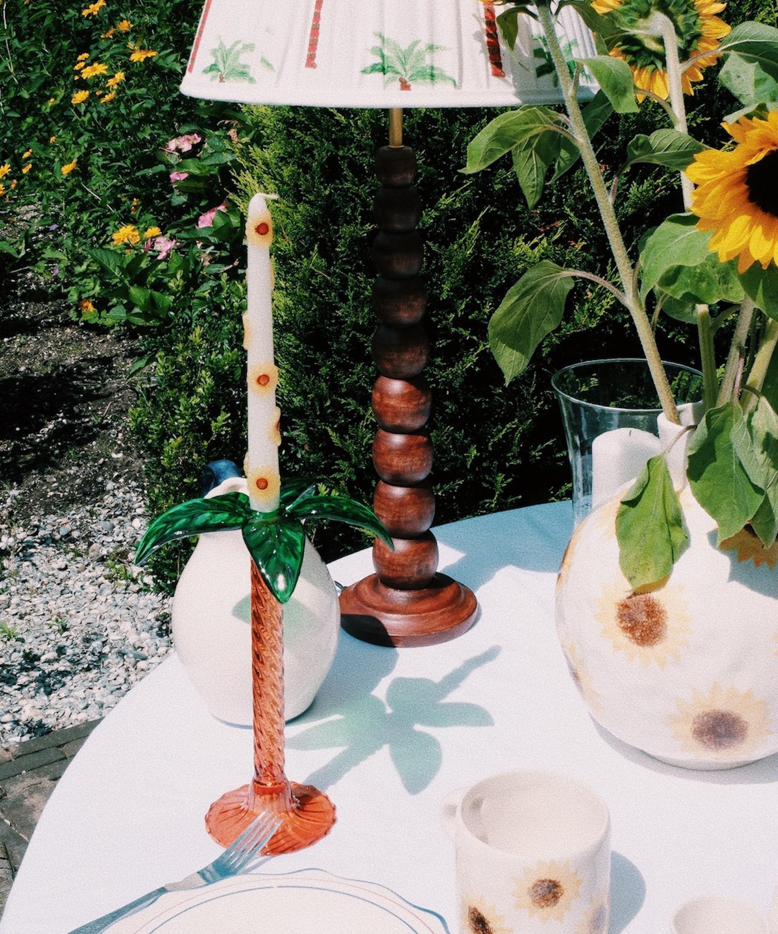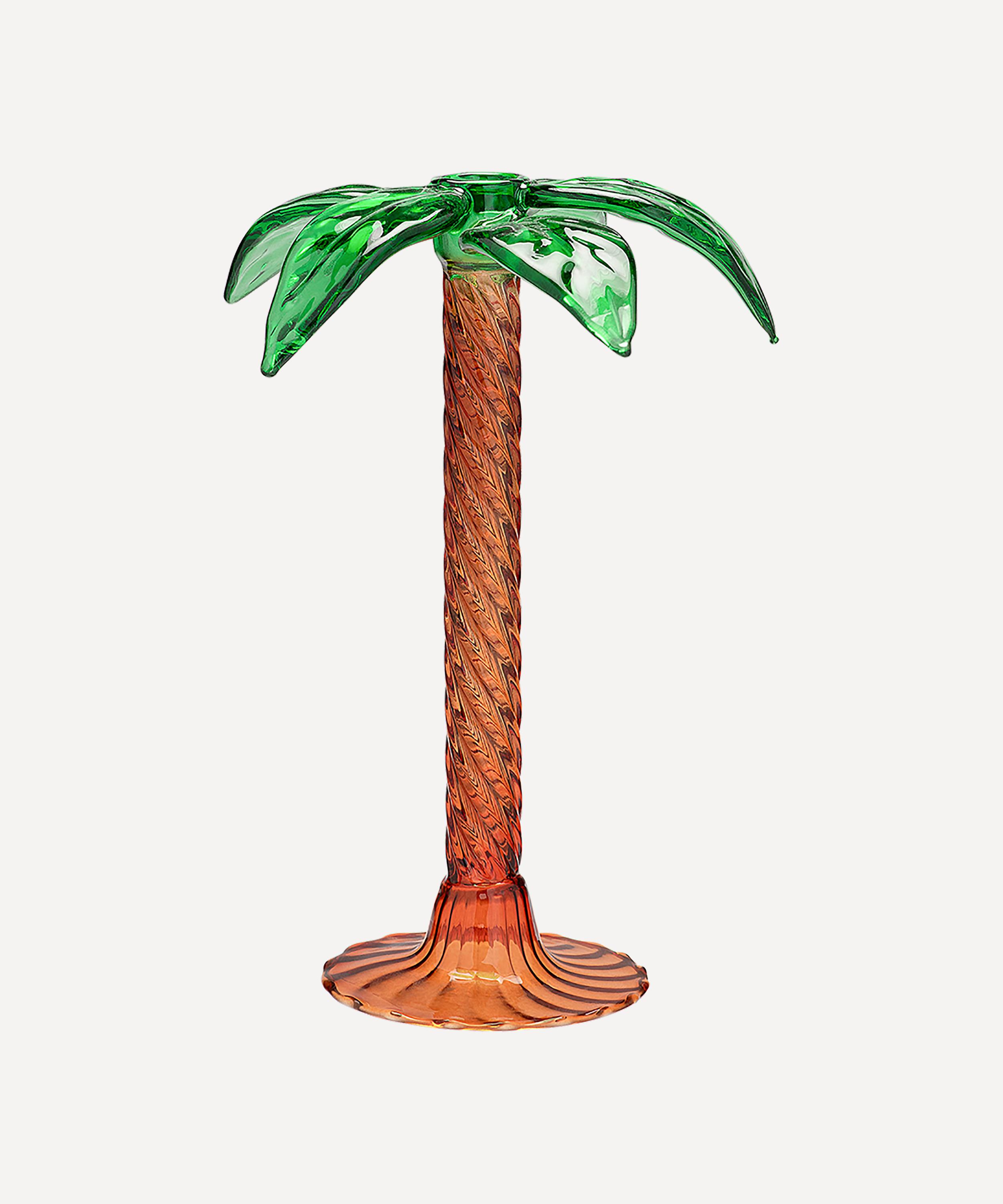 Anna + Nina’s Glass Palm Tree candle holder is a tinted, gleaming home addition.