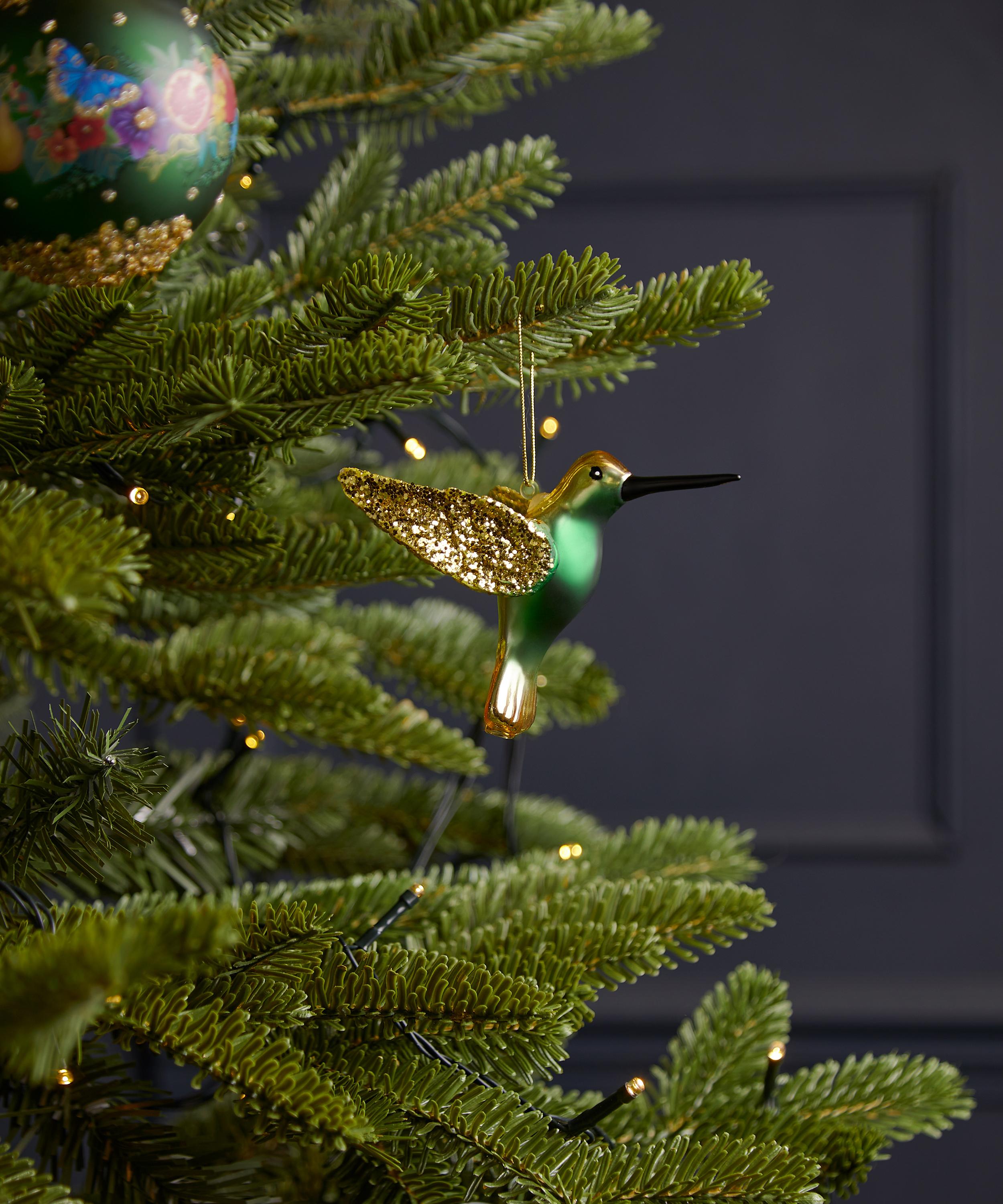 Add a flutter of wild sparkle to your evergreen pine with the Glitter Hummingbird ornament, exuding whimsical opulence through its glittering details.