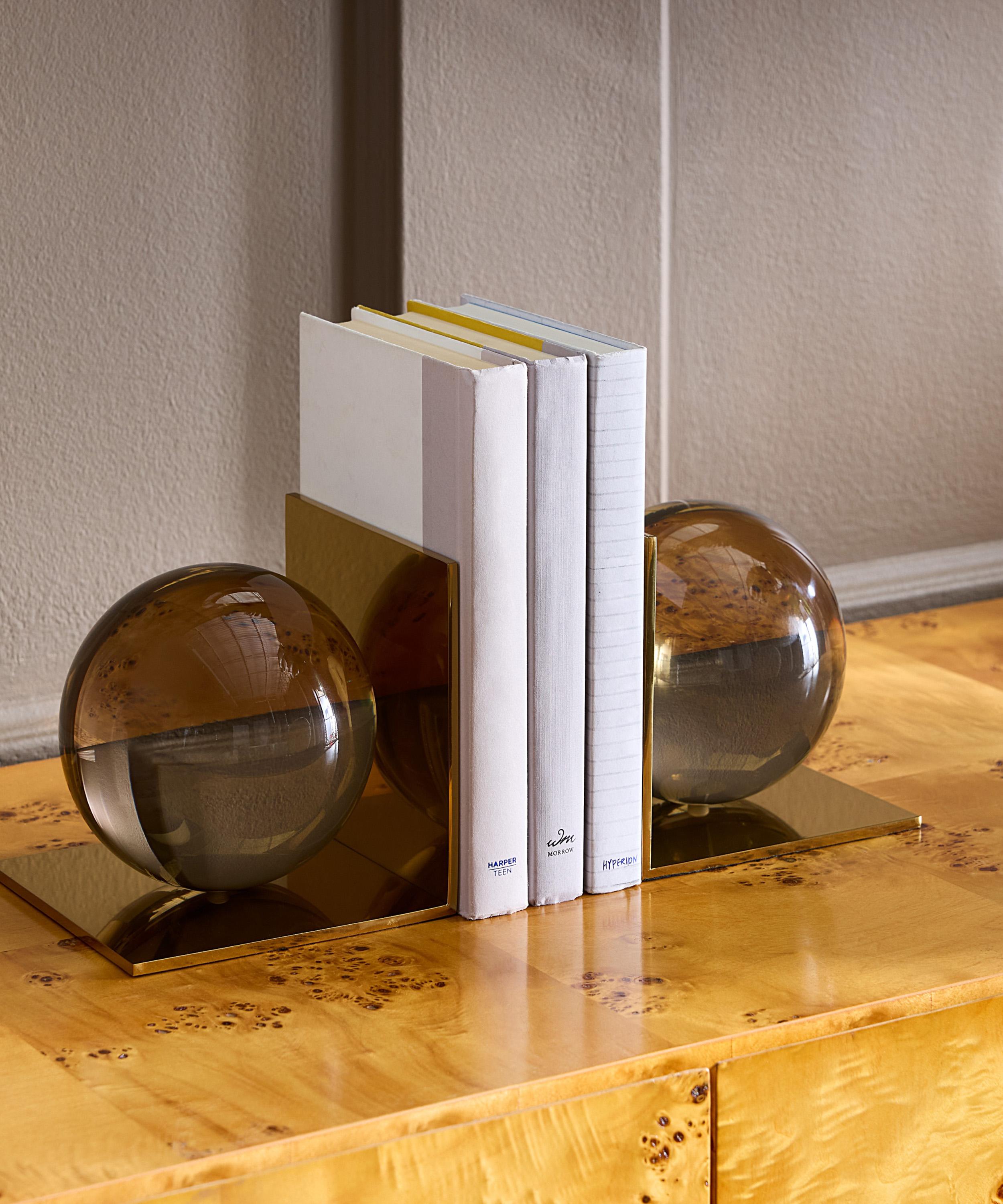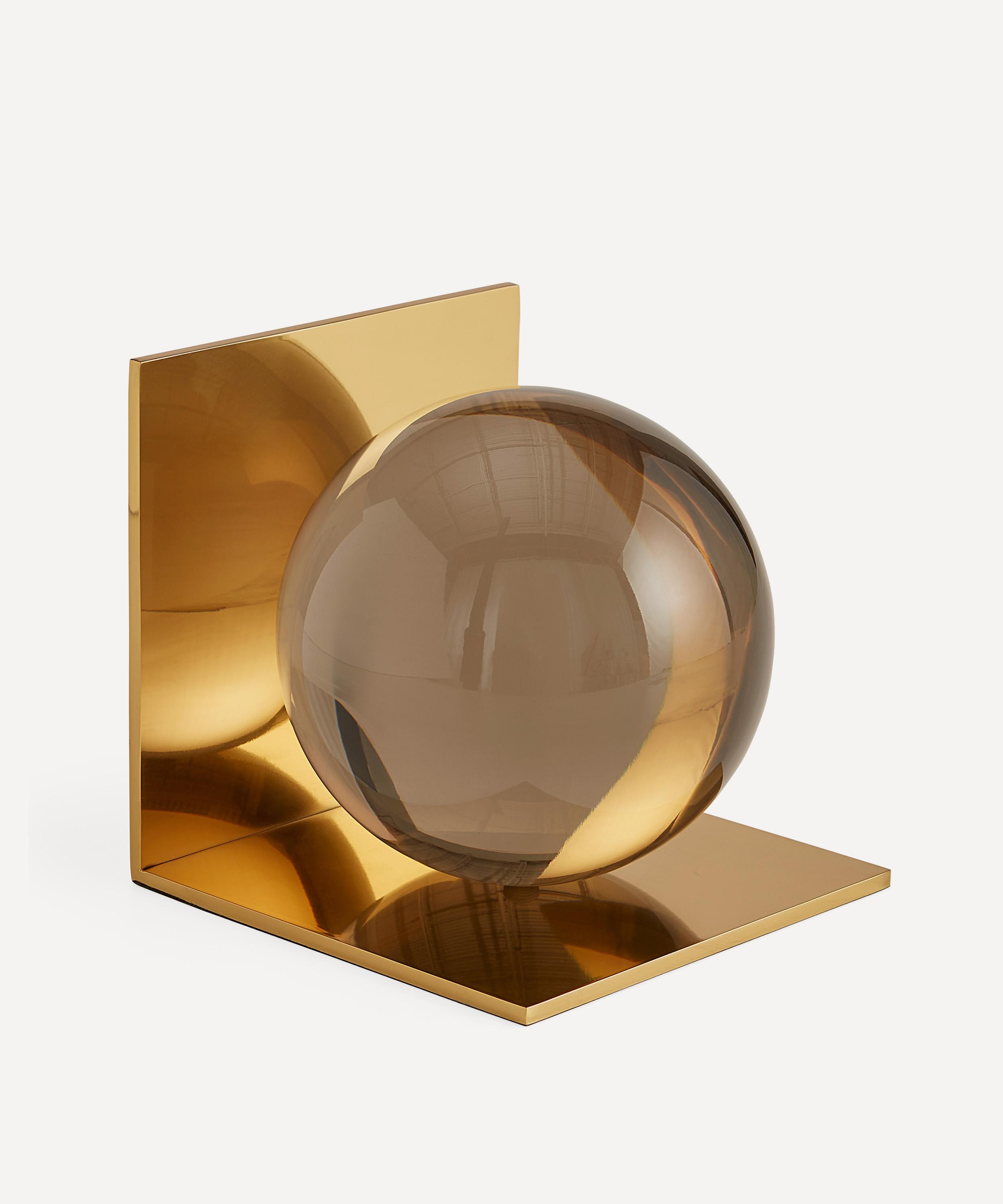Inspired by big, bold cocktail rings, each spherical bookend sits snug in an L-shaped brass base for a sleek, unique way to store well-thumbed tomes. This head-turner makes a perfect hostess gift, or arrange in a study to elevate somewhat ordinary interiors with a touch of statement styling.