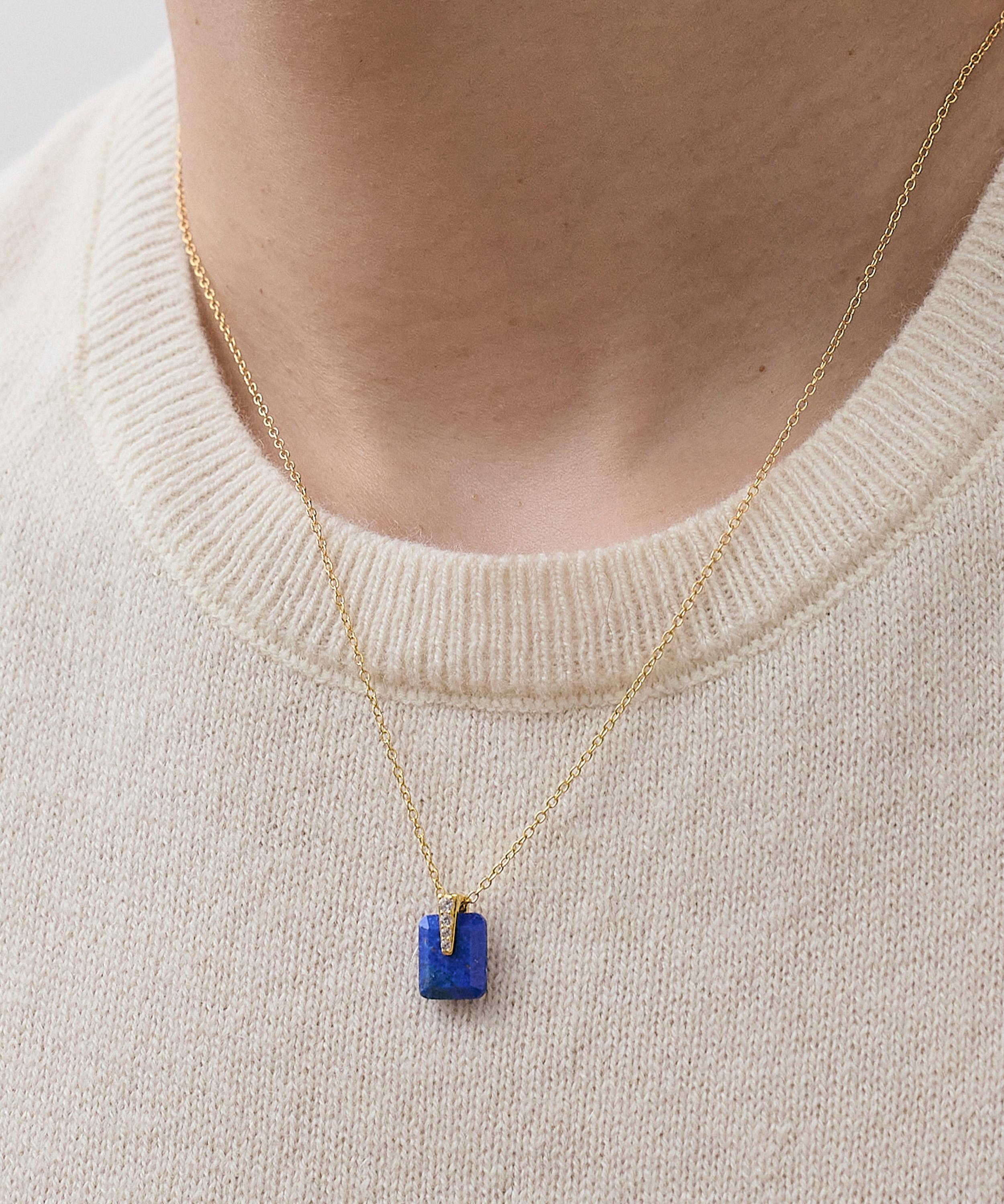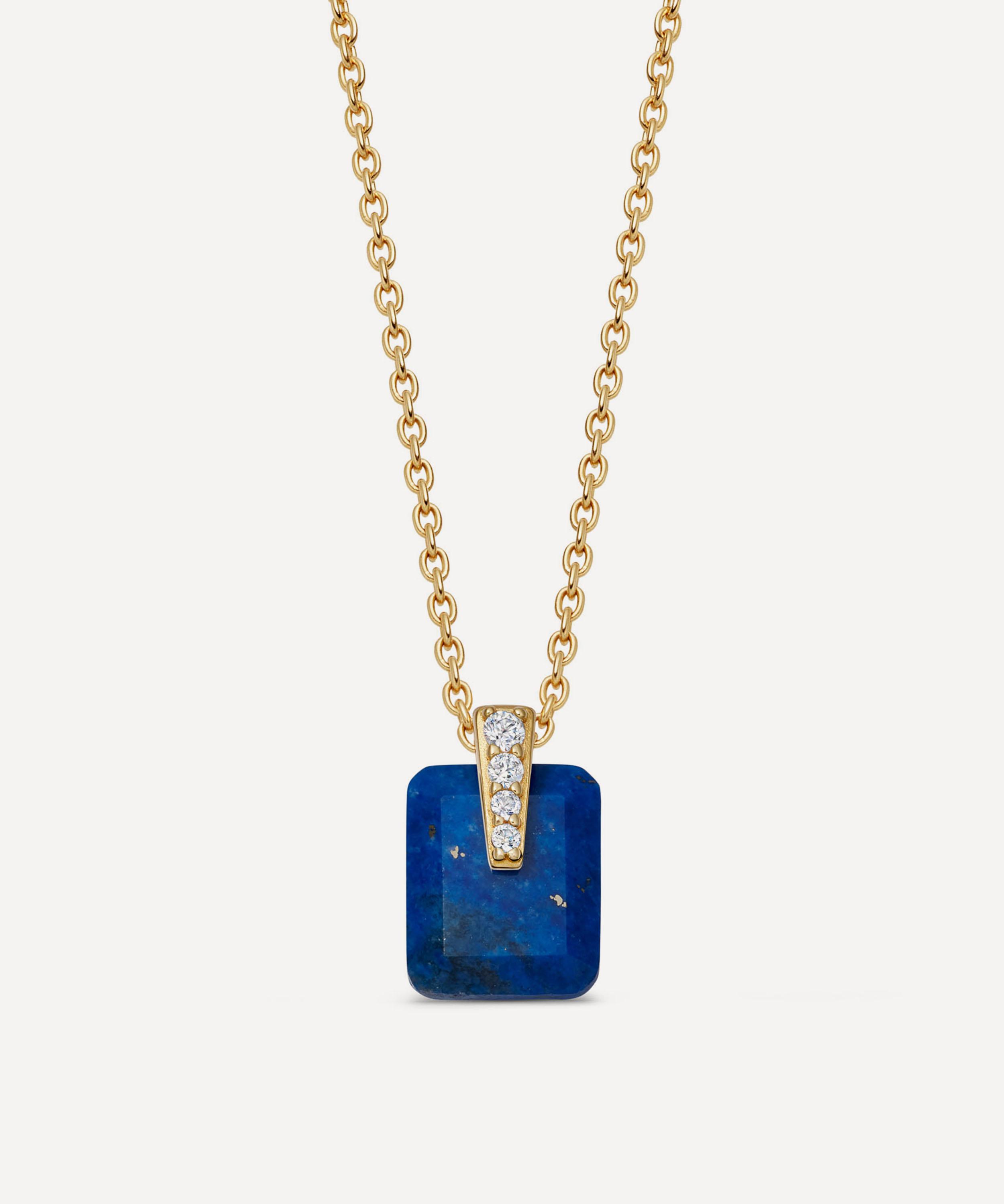 Exemplifying the geometric shapes that characterises the Deco collection, this gold necklace features a fine trace chain and an expertly cut lapis stone, adorned with four cultured sapphires on its bail clasp for extra sparkle – style it solo, stack with contrasting necklaces or team it with the matching Deco Lapis Huggie Drop Earrings.