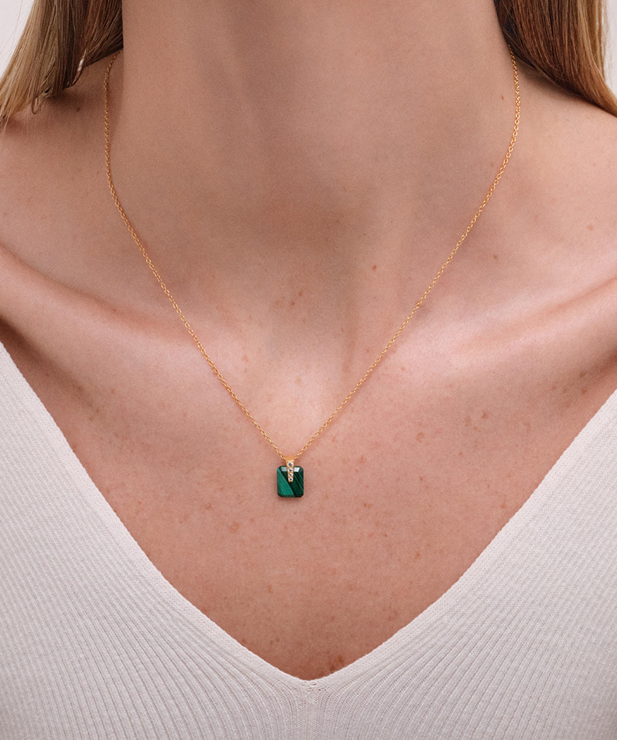 Exemplifying the geometric shapes that characterises the Deco collection, this gold necklace features a fine trace chain and an expertly cut malachite stone, adorned with four cultured sapphires on its bail clasp for extra sparkle – style it solo, stack with contrasting necklaces or team it with the matching Deco Malachite Huggie Drop Earrings.