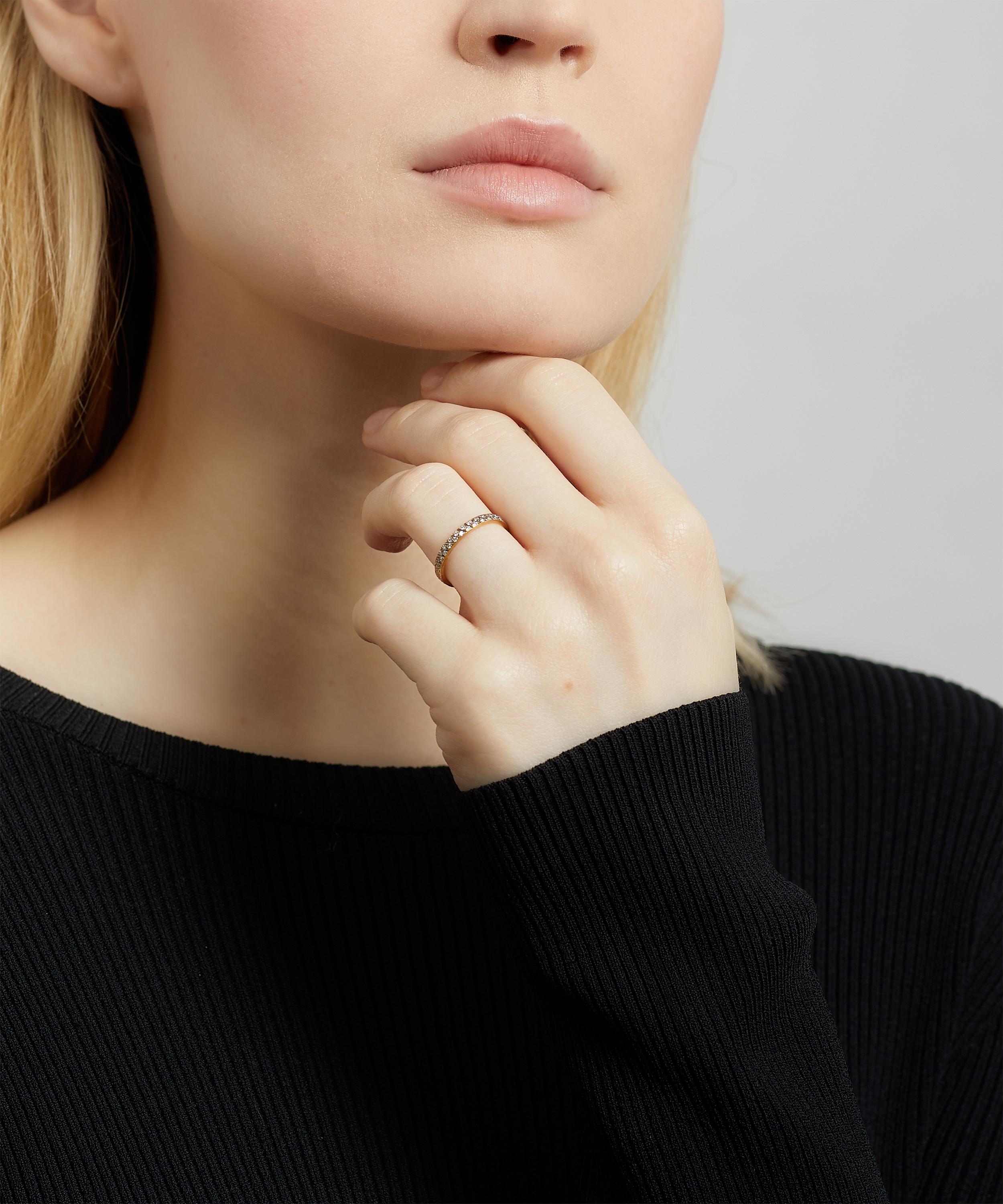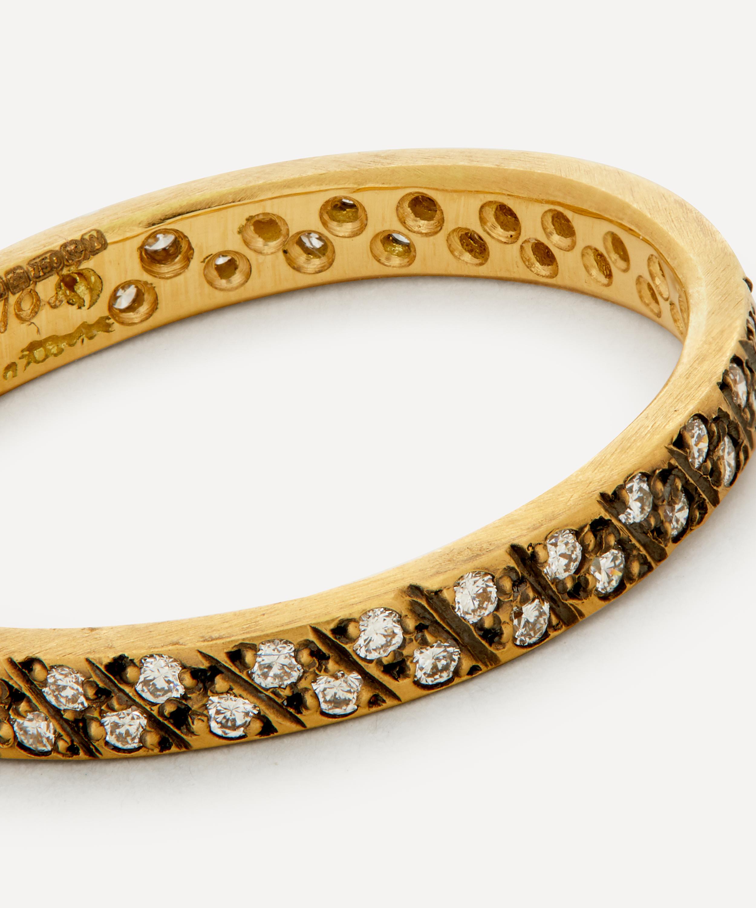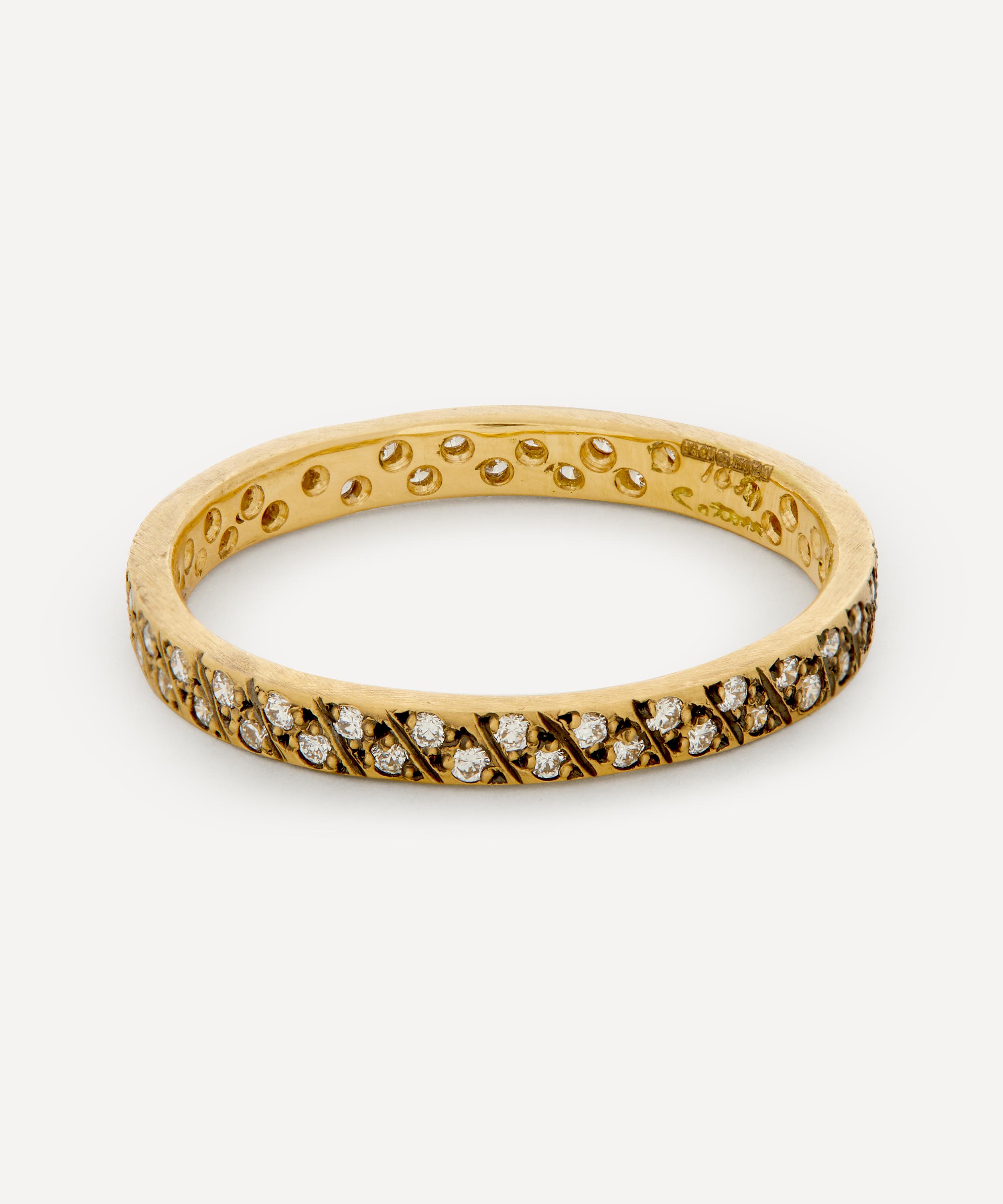Satomi Kawakita's unique skillset and exquisite eye for detail come through in this delicate 18 carat gold ring. A timeless addition to your jewellery curation, it has a slim, matte band inlaid with two rows of round brilliant cut diamonds, finished with antiqued diagonal cuts. Layer it with stacks of plain gold rings to add a hint of sparkle to your everyday jewellery line-up.