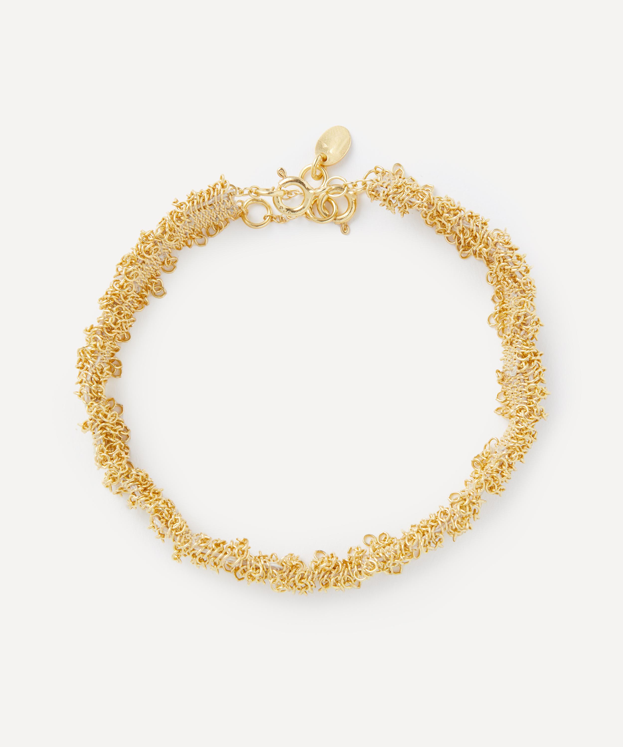 Boasting an edgy addition to your edit, this chain bracelet by Stephanie Schneider showcases the designer’s distinctive chainwork. Handcrafted from gold, it features a cluster of fine trace chains, threaded together to create a chainmail design with fringe detailing and interwoven silk thread for a tonal effect. Team it with a pair of earrings or a bracelet from the brand’s extensive collection for a co-ordinating finish.