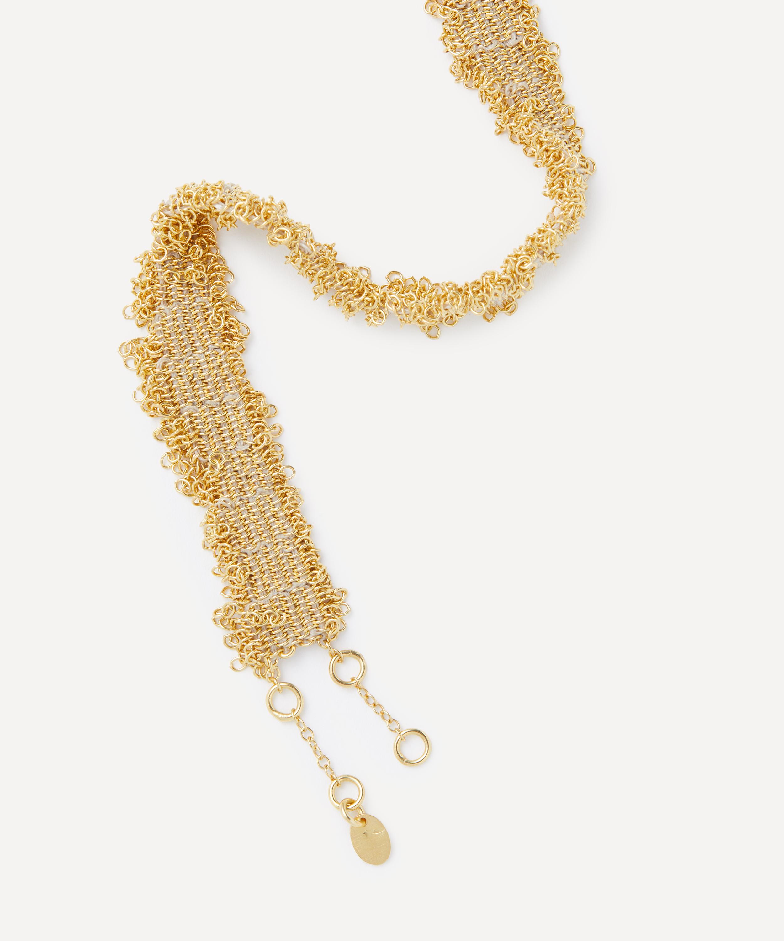Employing her background in textiles as a catalyst for her work, Stephanie Schneider uses time-honoured handcrafting techniques and traditional jeweller’s materials to mimic the fibrous textures and weave structures of fabric. Using delicate chains as her device, Stephanie intricately arranges and interlinks each of her creations, hallmarking each piece with painstakingly hand-threaded silk, mohair or semi-precious stones. An enchanting collection of precious metal armour ensues, referencing textile trims and techniques including fringing, patchwork and weave. Stephanie Schneider is available exclusively in the UK at Liberty.