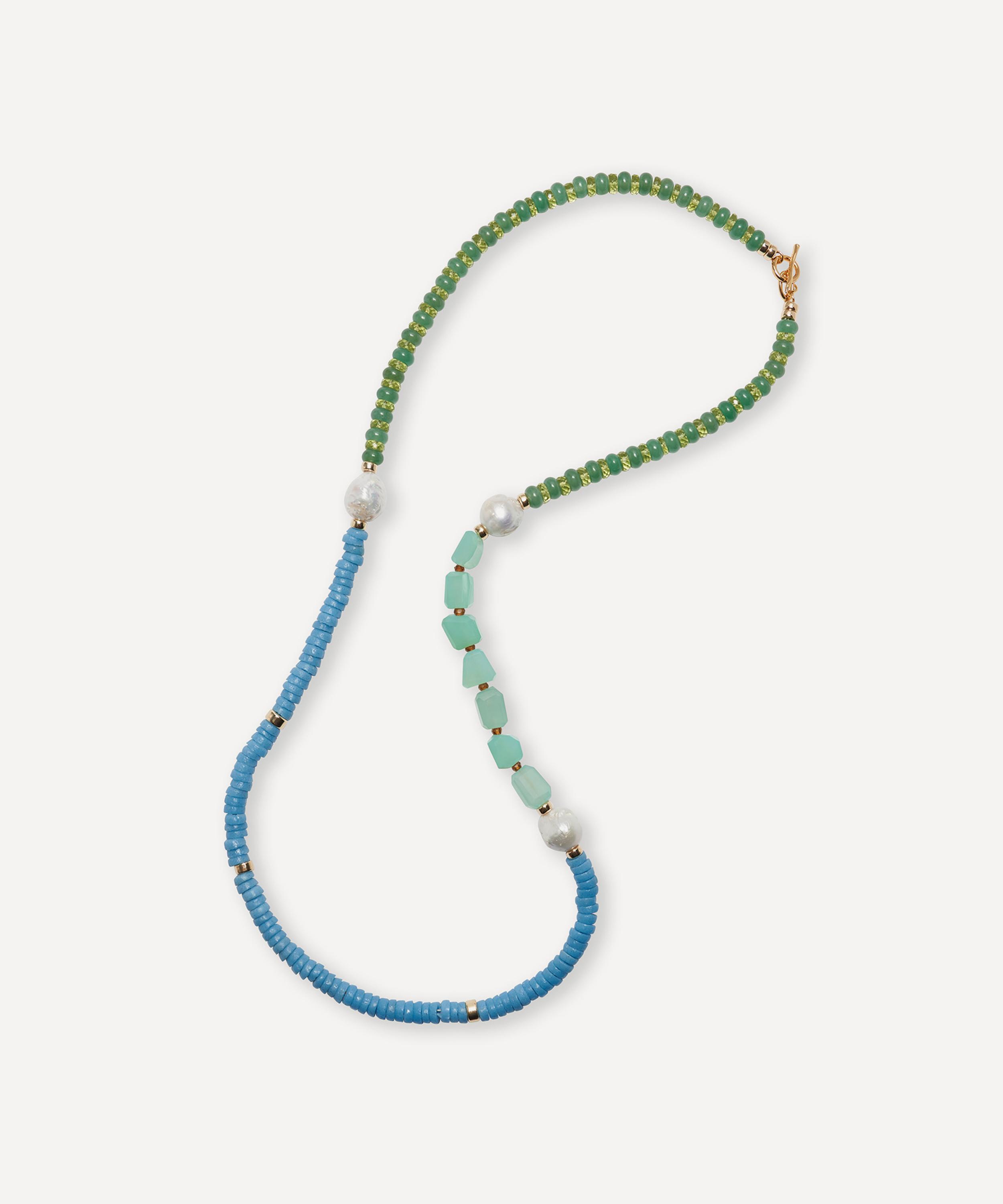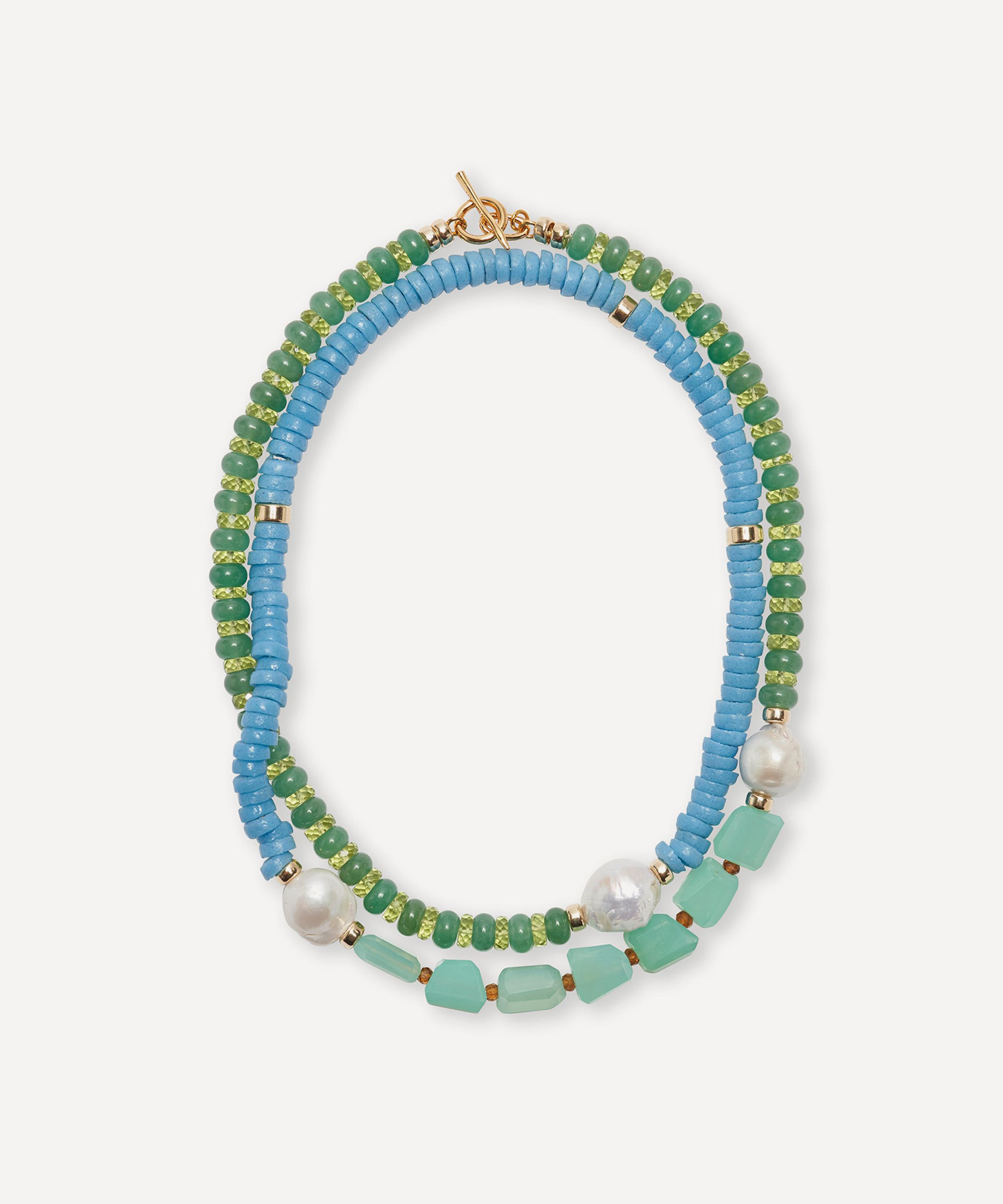 It’s expertly crafted from gold-plated brass and defined by an assortment of green aventurine, peridot coloured hydroquartz, chalcedony and hessonite garnet stones with a trio of freshwater pearls. Capturing the label’s beach-inspired aesthetic, the necklace effortlessly compliments maxi dresses, bandeau tops and beachwear, and can be worn on its own or styled with your favourite pieces to create a unique layered look.