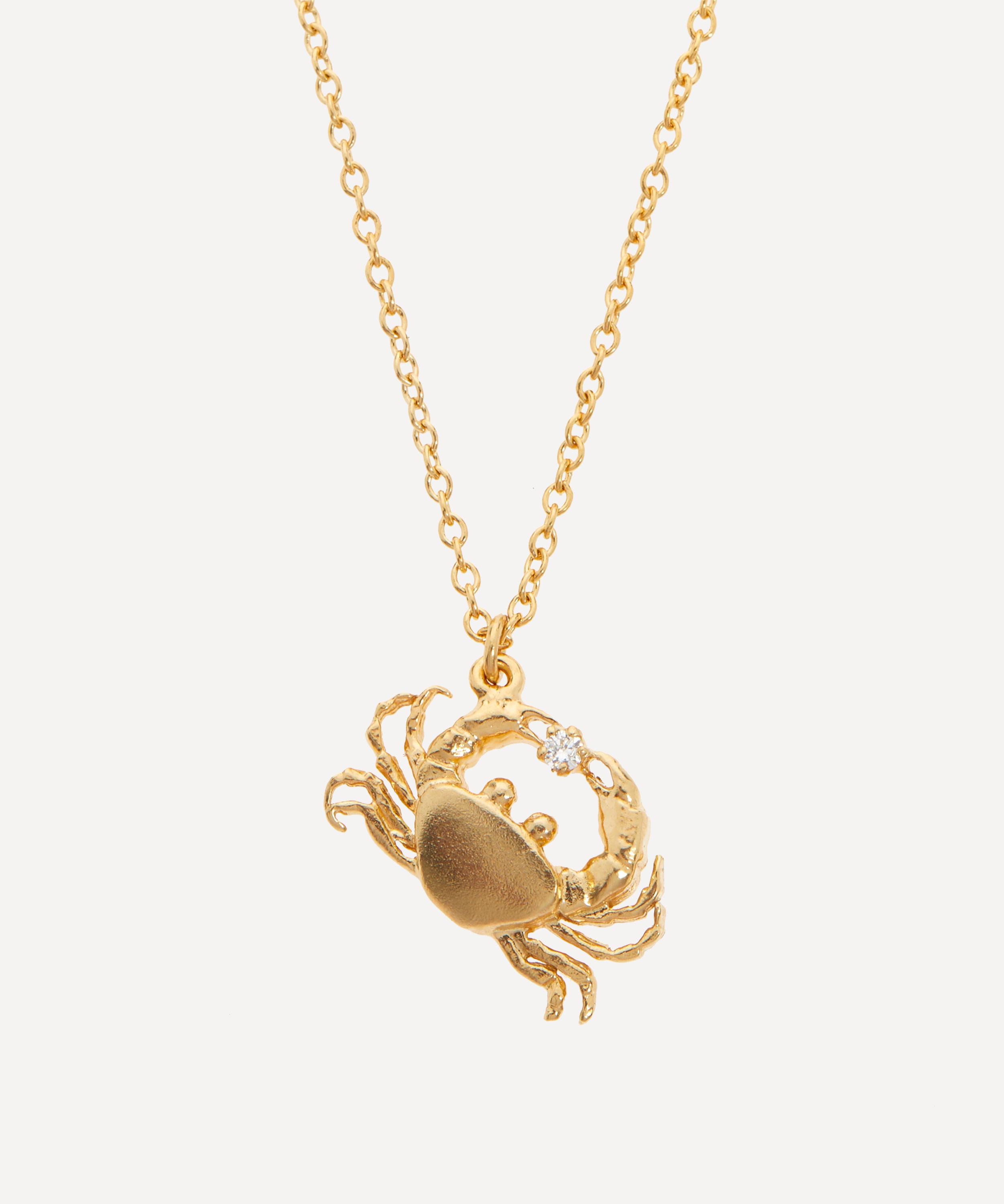 Alex Monroe's Cheeky Crab pendant necklace showcases the designer's affinity for natural motifs. Handcrafted in the brand's London studio from gold-plated silver, this delicately sculpted pendant takes the form of a small crab, clasping a sparkling diamond. Suspended from a fine chain, mix and match this piece with other natural motifs from the brand's collections for a wearable representation of the elegance and delicacy of the natural world.