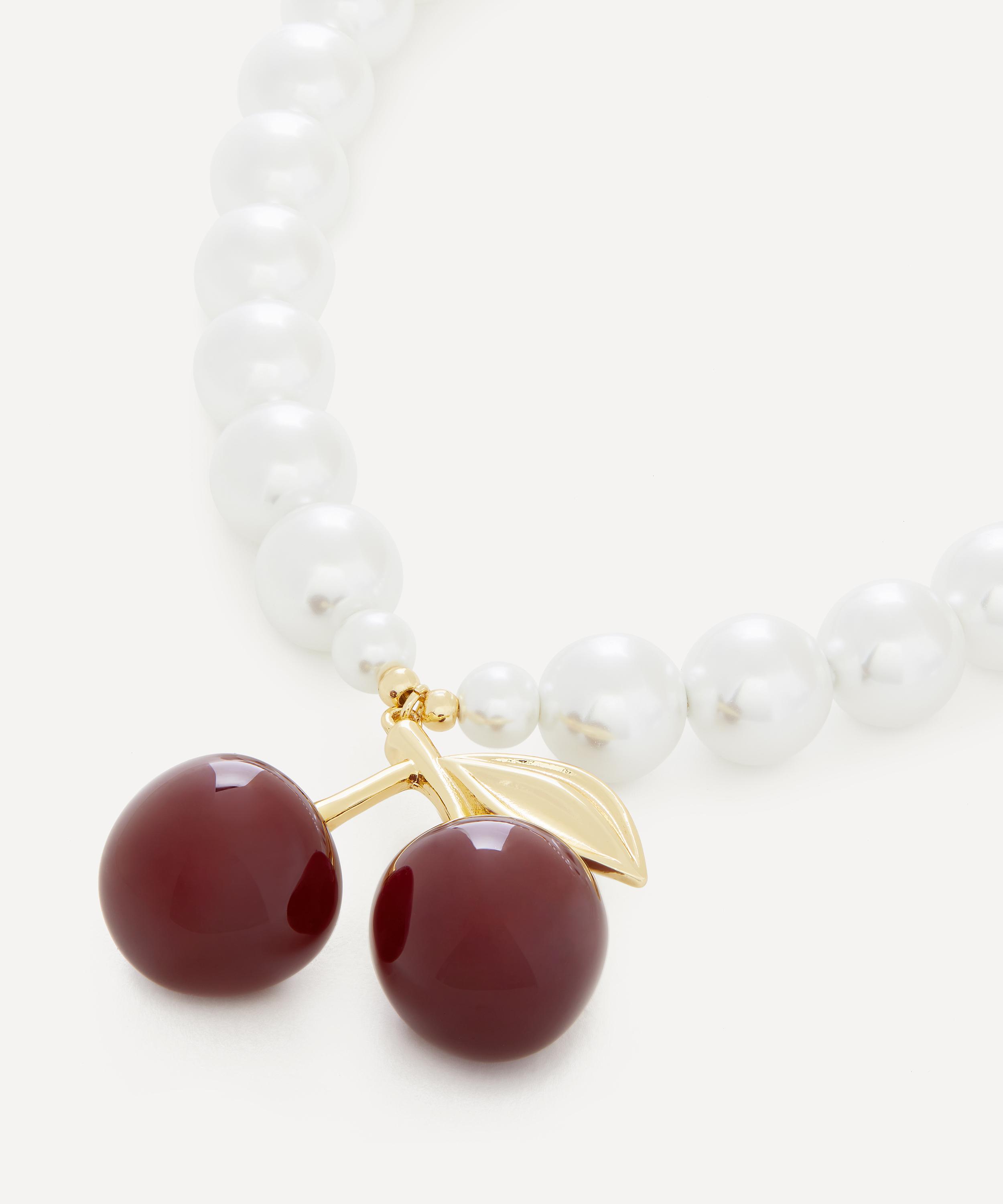 Crafted from gold-plated brass, it is strung with gleaming faux pearls and adorned with a bold cherry pendant. Embodying the extravagant opulence and effortless elegance that have defined the label for almost 60 years – it perfectly complements other pieces from the brand for a maximalist jewellery curation.