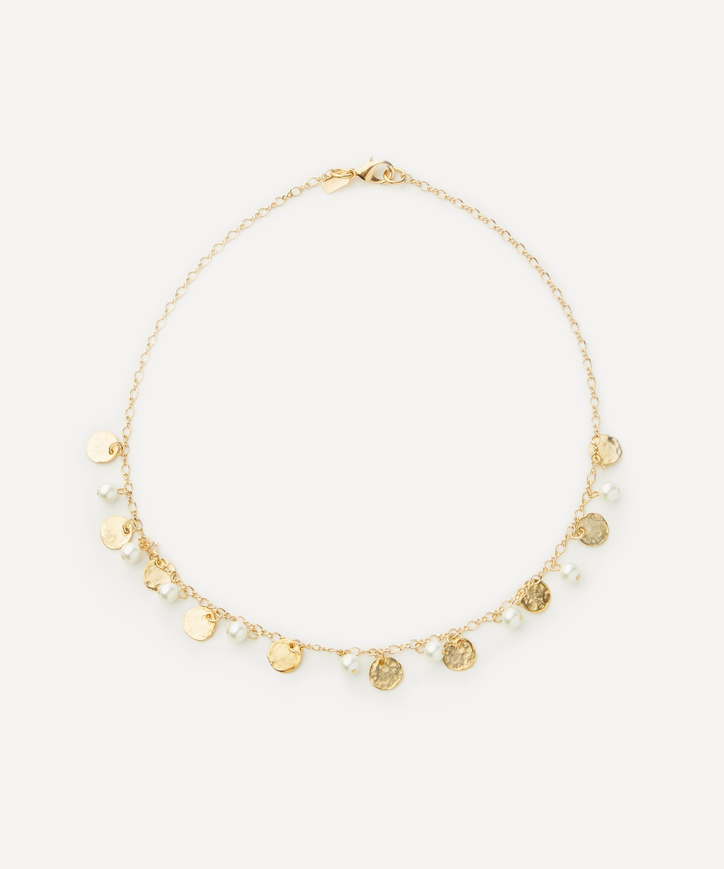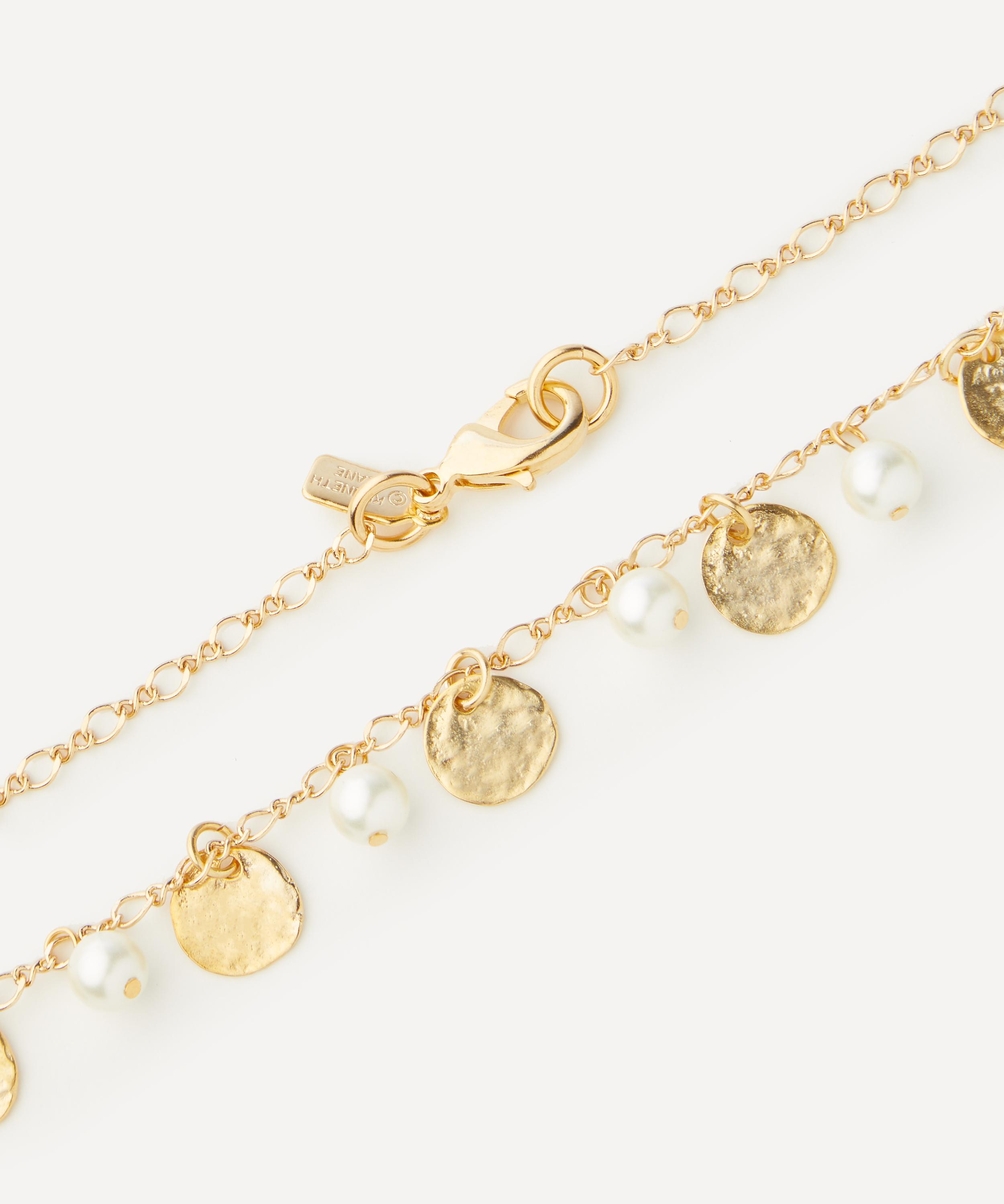 Add a dramatic flair to your look with this station-inspired necklace by fashion jeweller Kenneth Jay Lane. Crafted from gold-plated brass, it features a mix-link chain, characterised by alternating oval links and infinity links. Complete with hammered coin charms and faux pearls, style it on its own, or pair with additional necklaces and chains for a layered finish.