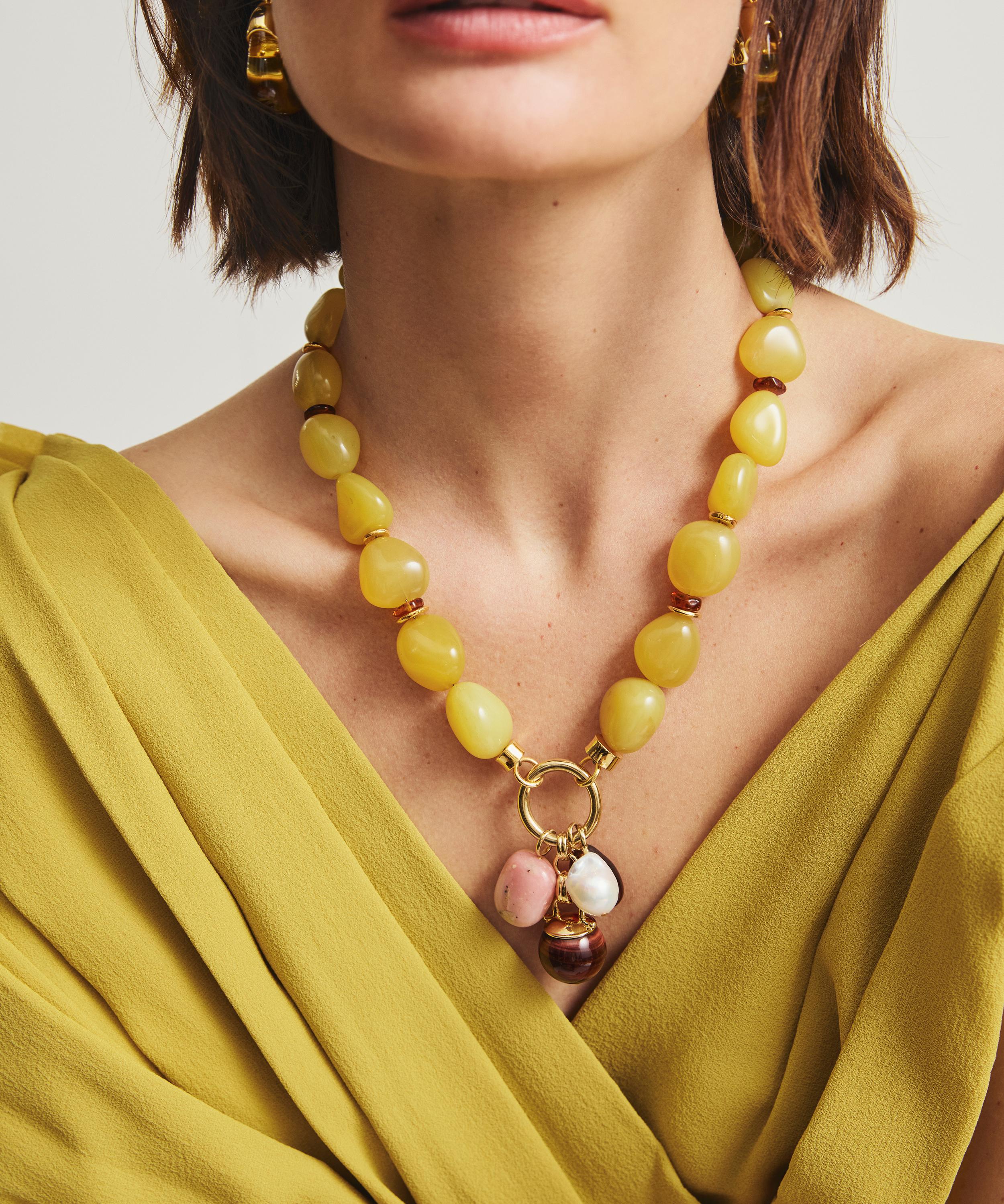 Express your personal style and make a distinctive statement with Lizzie Fortunato’s attention-grabbing Cordoba charm necklace. Threaded with yellow chalcedony and dotted amber beads, it features a gold-plated top ring holding a charm quartet, including pink opal, red tigers eye, freshwater pearl, and a flame-worked glass teardrop. Offering plenty of statement appeal on its own, it can be stacked with chunky chains, pendants and other beaded necklaces for a layered look.