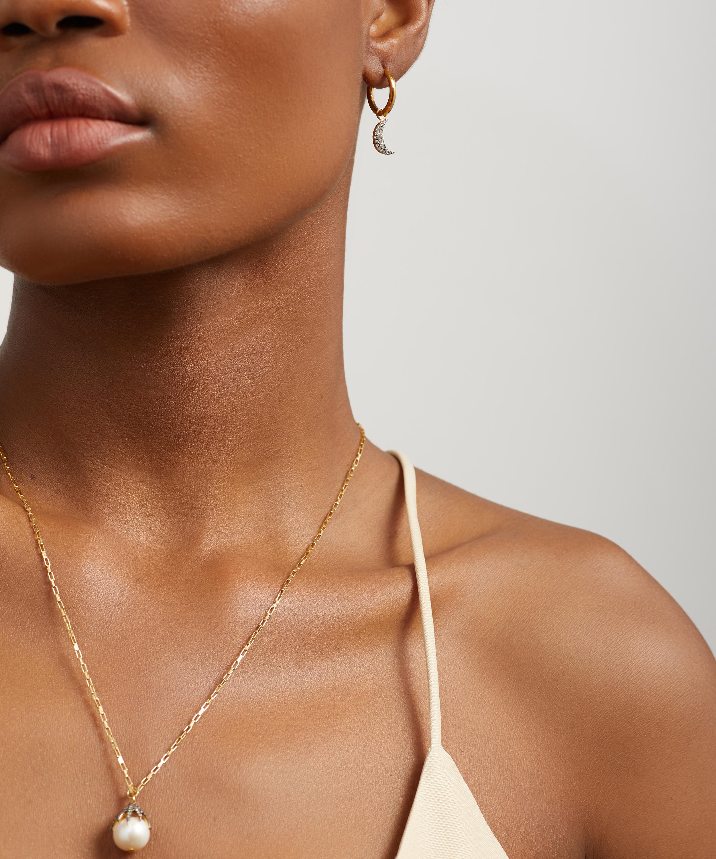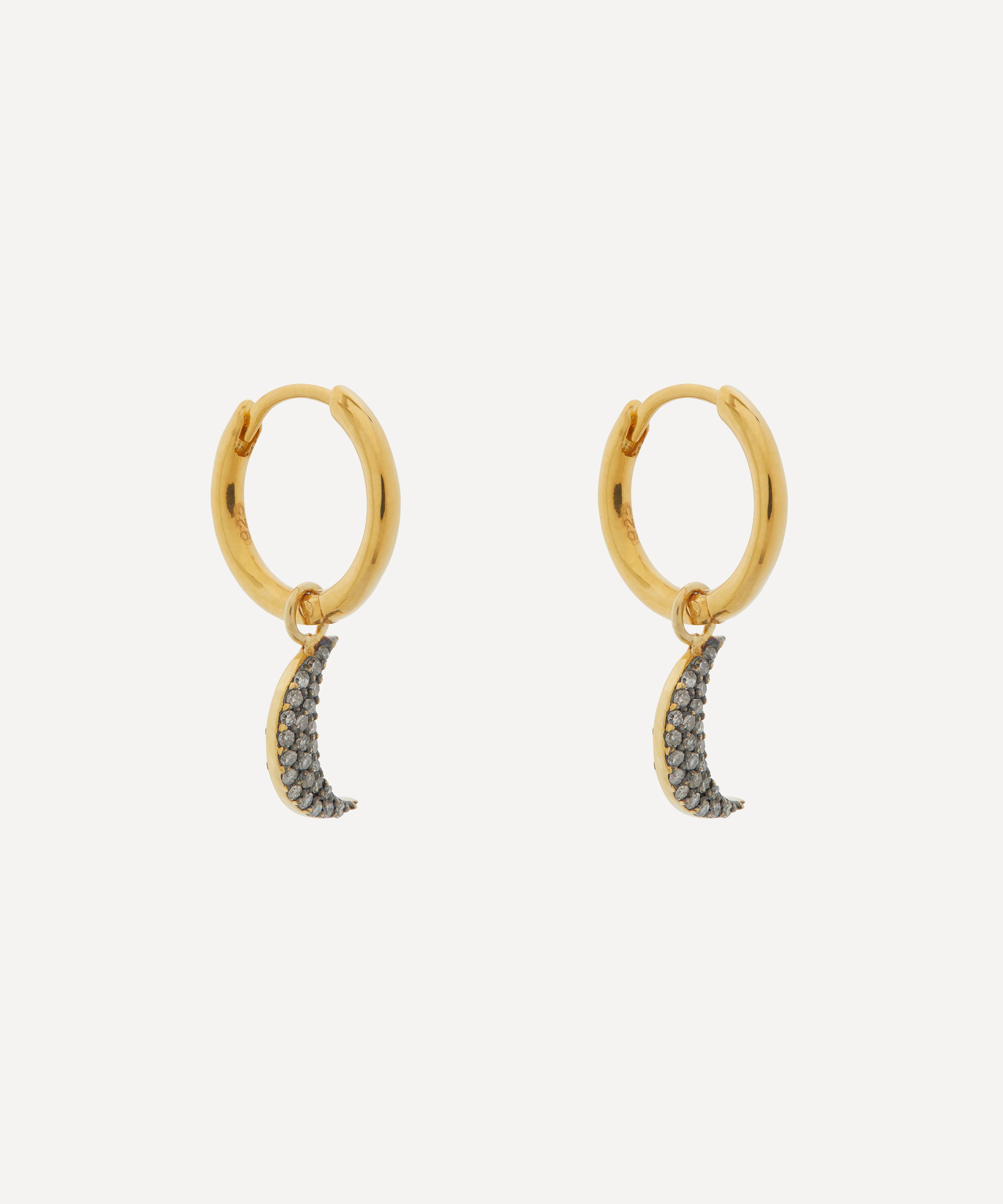 Interlacing edgy style with a soft femininity, each earring features a gold-plated hoop adorned with a crescent moon charm drop covered in pavé set diamonds. Wear this pair as they are, or incorporate them into a curated ear stack.