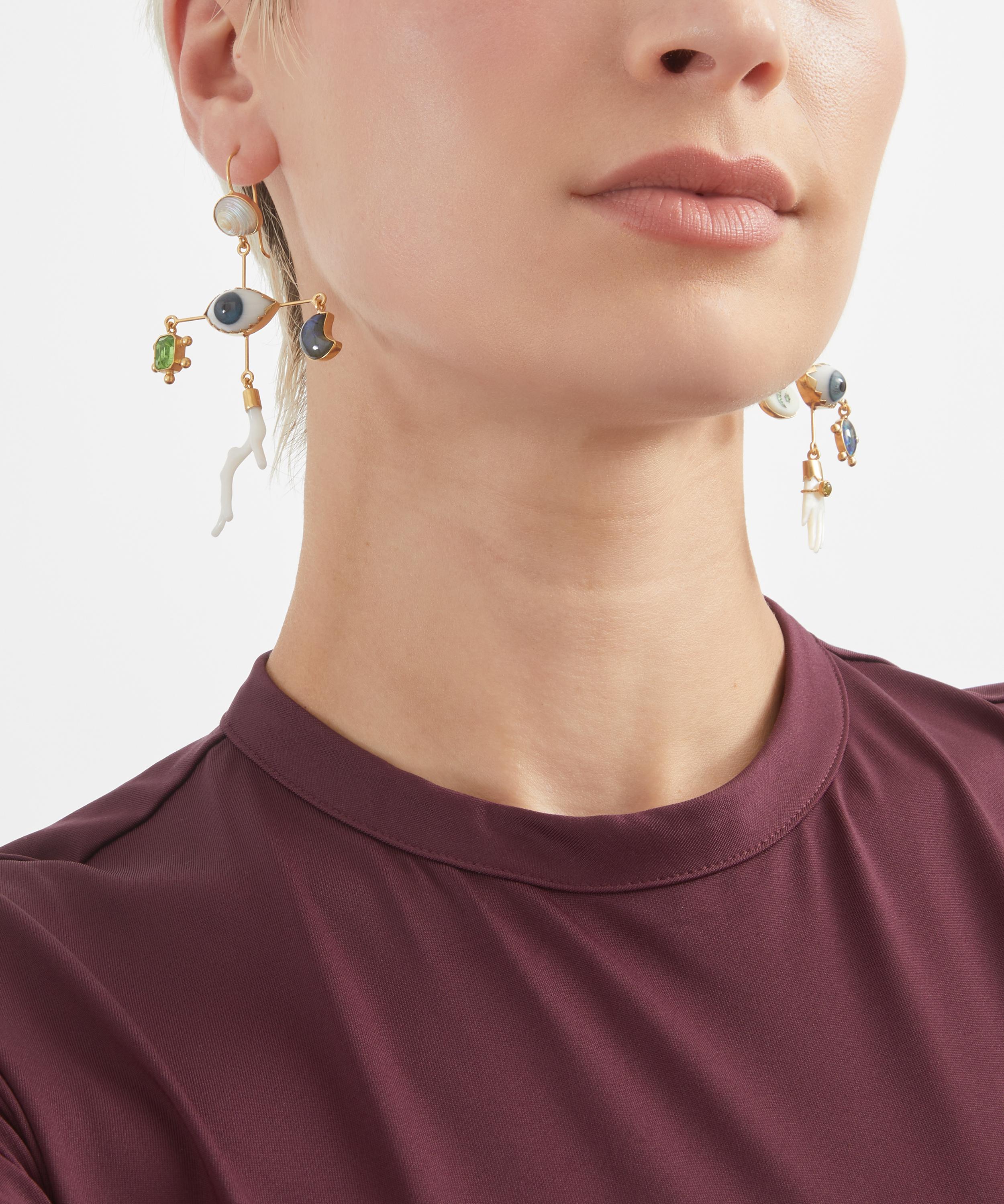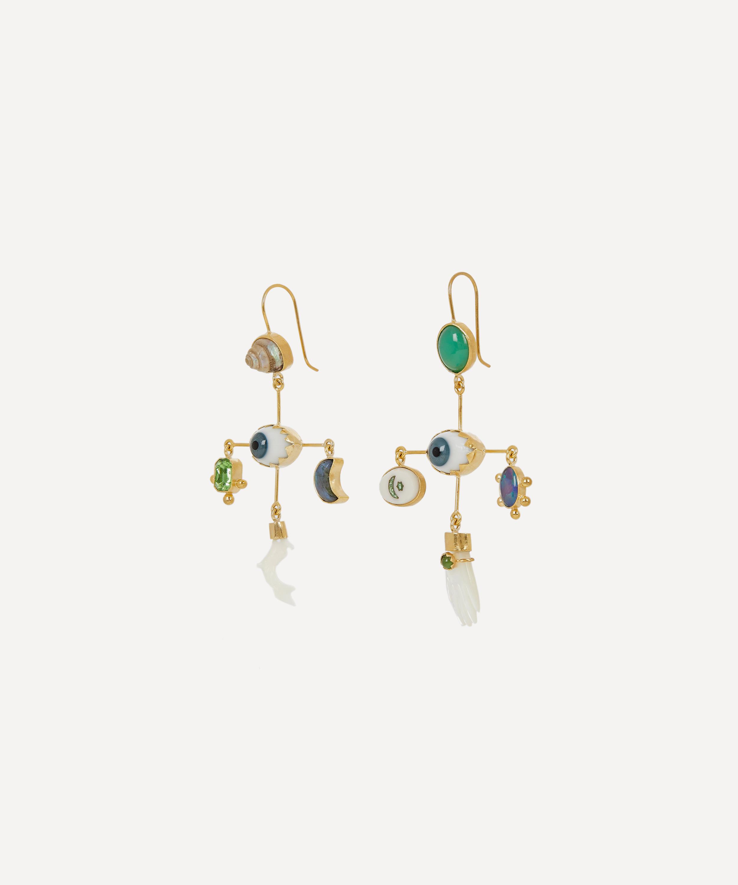 Handmade in Edinburgh, every Grainne Morton creation is formed of a wonderfully unique curation of found objects, coloured gems and tiny trinkets. Each of the Eye Cross earrings features a cross-shaped, chandelier drop formed of an antique glass eye and an asymmetric assortment of shells, antique buttons and mixed-cut gems. Set within 18 carat gold-plated silver, they are an unexpected juxtaposition of vintage and contemporary styles - perfect for adding visual interest to everyday looks.