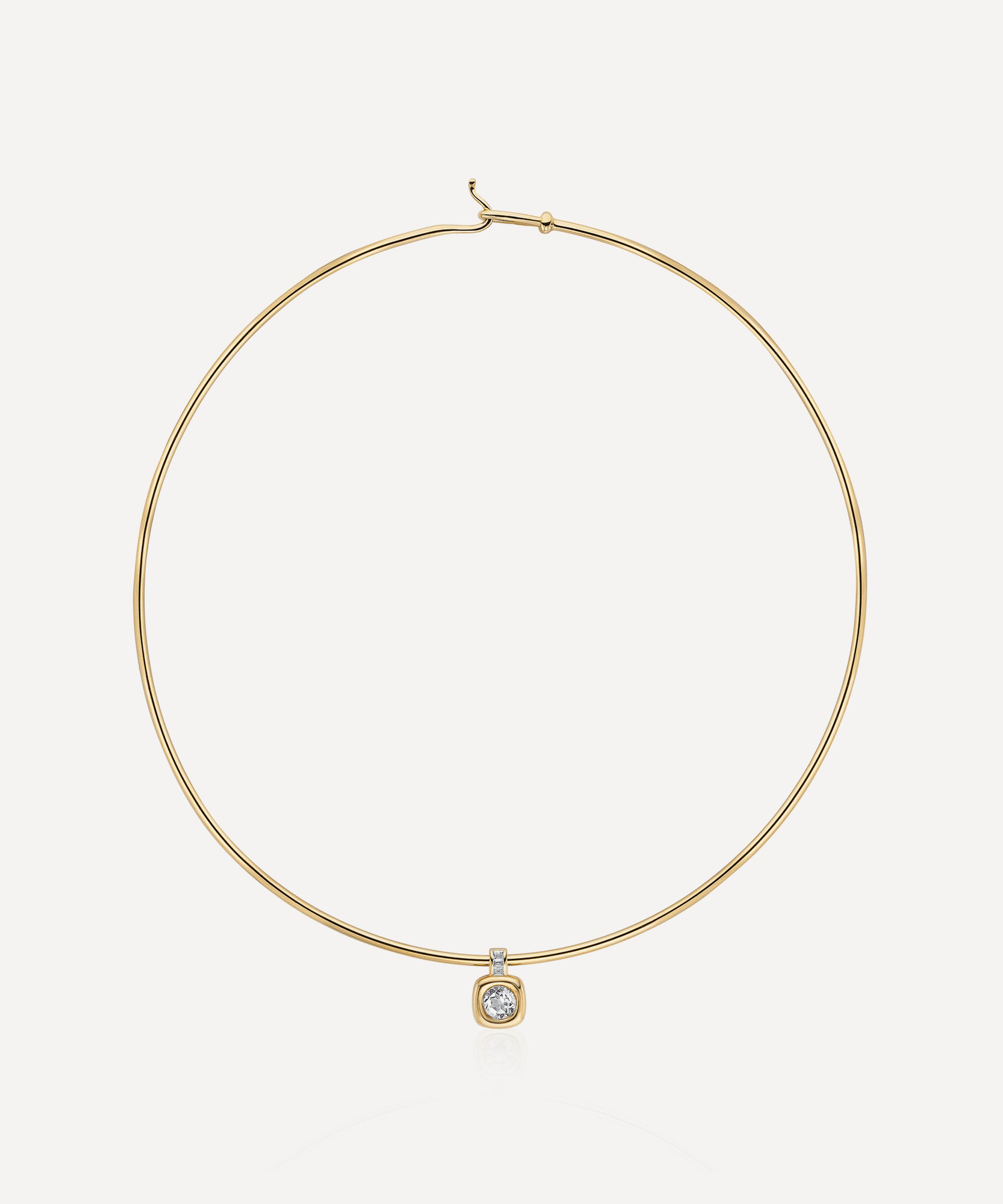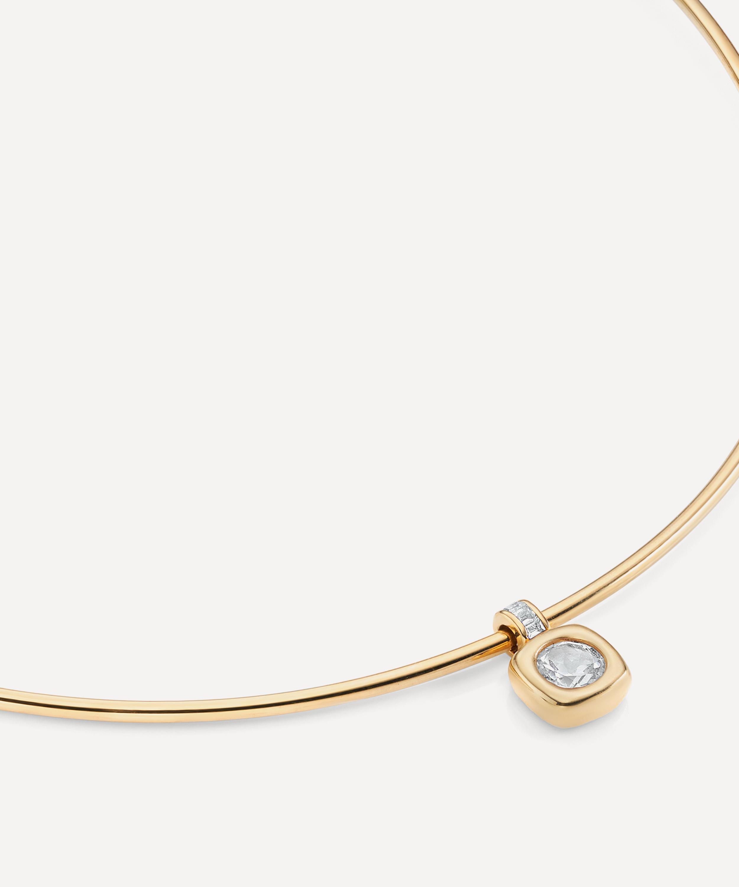 Crafted from gold-plated silver, it features a sleek and polished toque choker embellished with a bezel set wite topaz. Beautifully styled as a solo piece, it can also be paired with other chains and pendants for a curated stack.